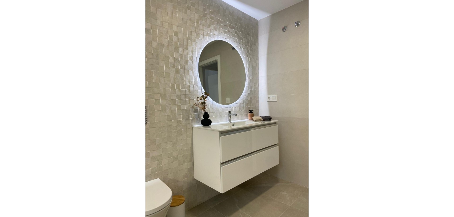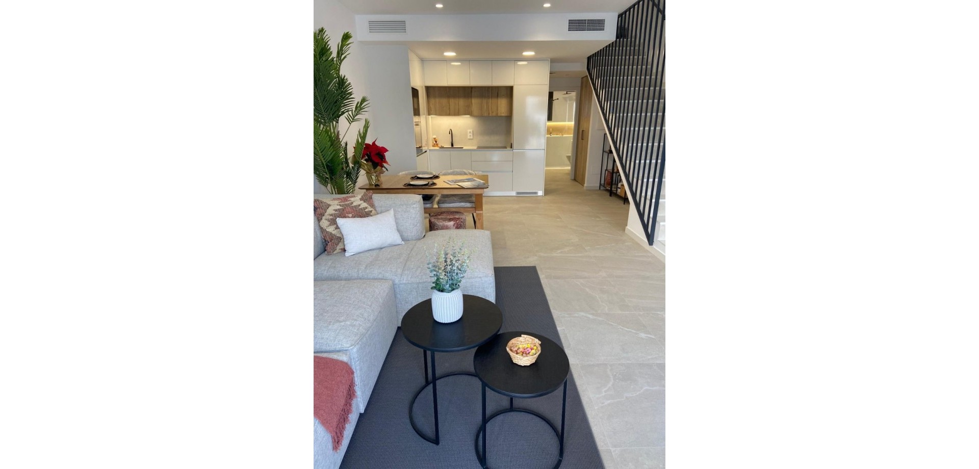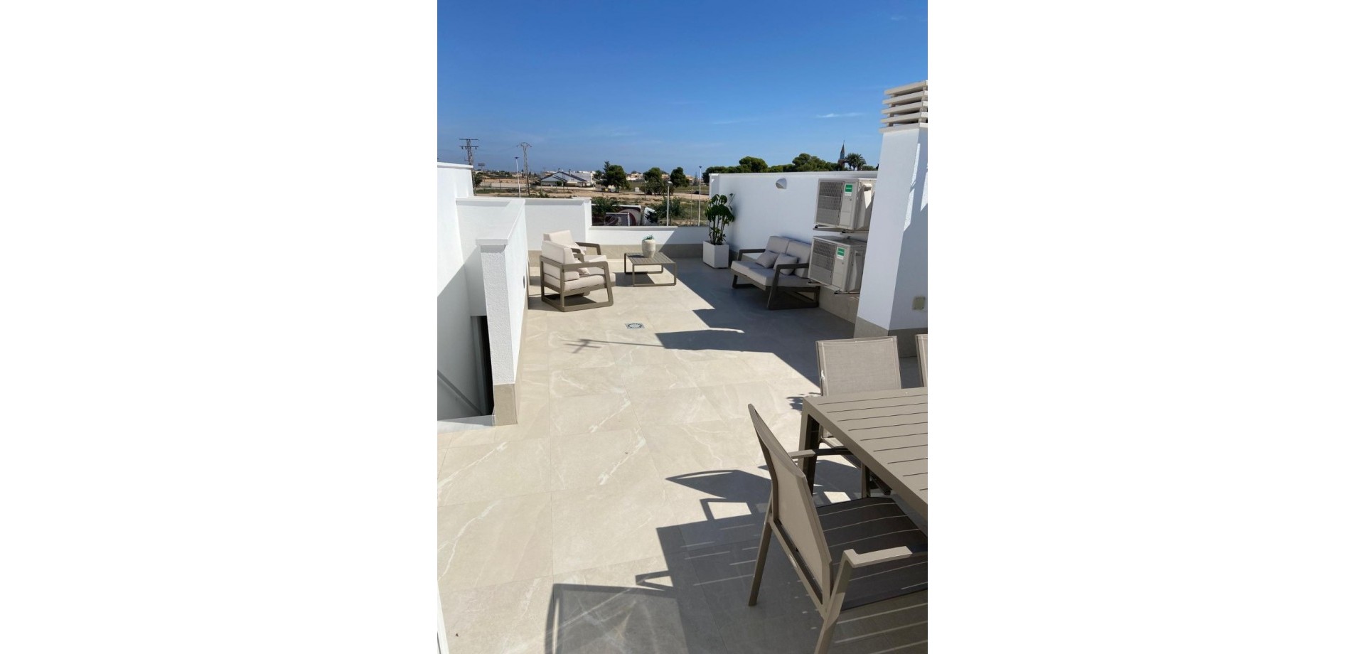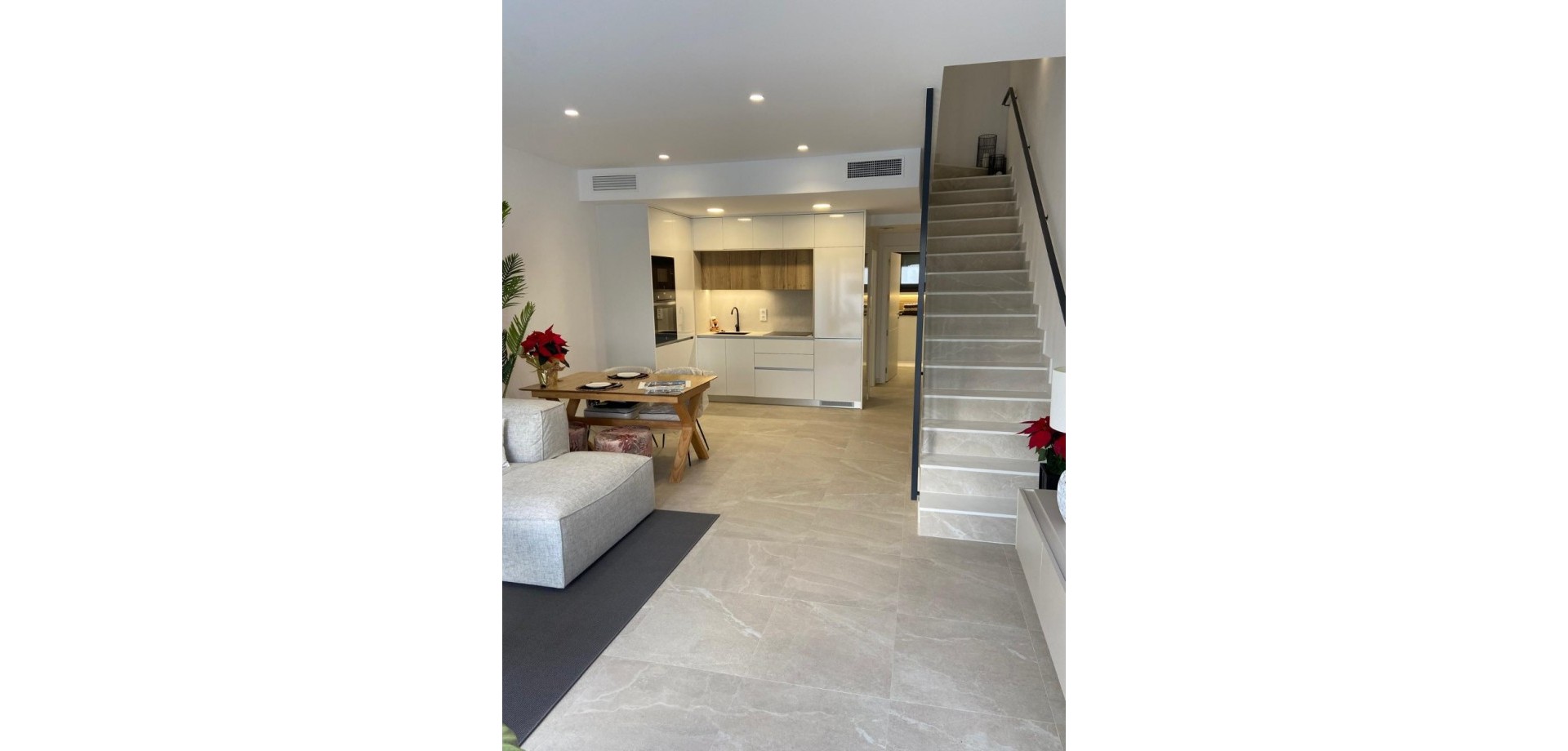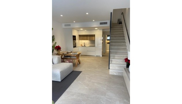 Genießen Sie moderne Annehmlichkeiten wie kostenlose Klimaanlagen, Einbauschränke in allen Schlafzimmern, Vorinstallation für Glasfaseranschluss und eine Gegensprechanlage. Die Innenbeleuchtung umfasst LED-Spots in Küche, Wohnzimmer, Flur und Badezimmern, zusätzliche Wandleuchten an der Fassade und integrierte LED-Spots im Garten und auf der Sonnenterrasse. Jede Wohnung ist mit einem Photovoltaik-Solarpanel für erneuerbare Energien ausgestattet. Die Küche ist mit Elektrogeräten von Balay ausgestattet, darunter ein Induktionskochfeld, ein Backofen, eine Mikrowelle, ein Dunstabzug, ein integrierter Kühlschrank und eine Geschirrspülmaschine.