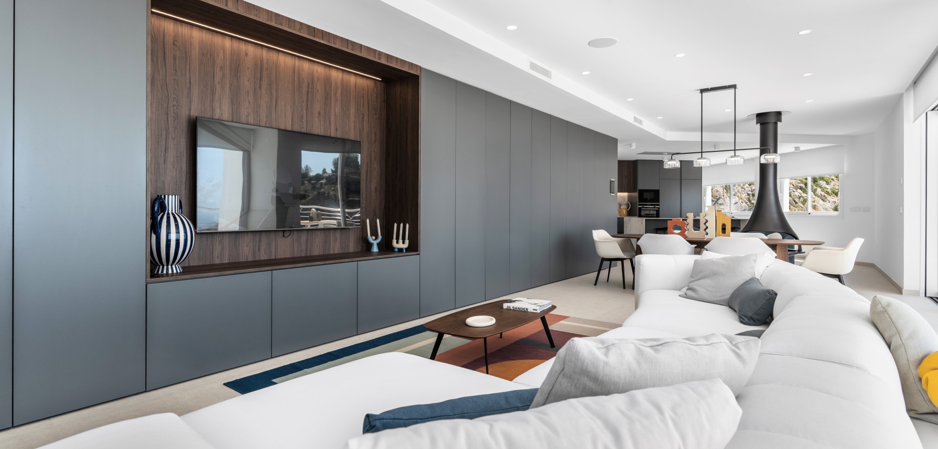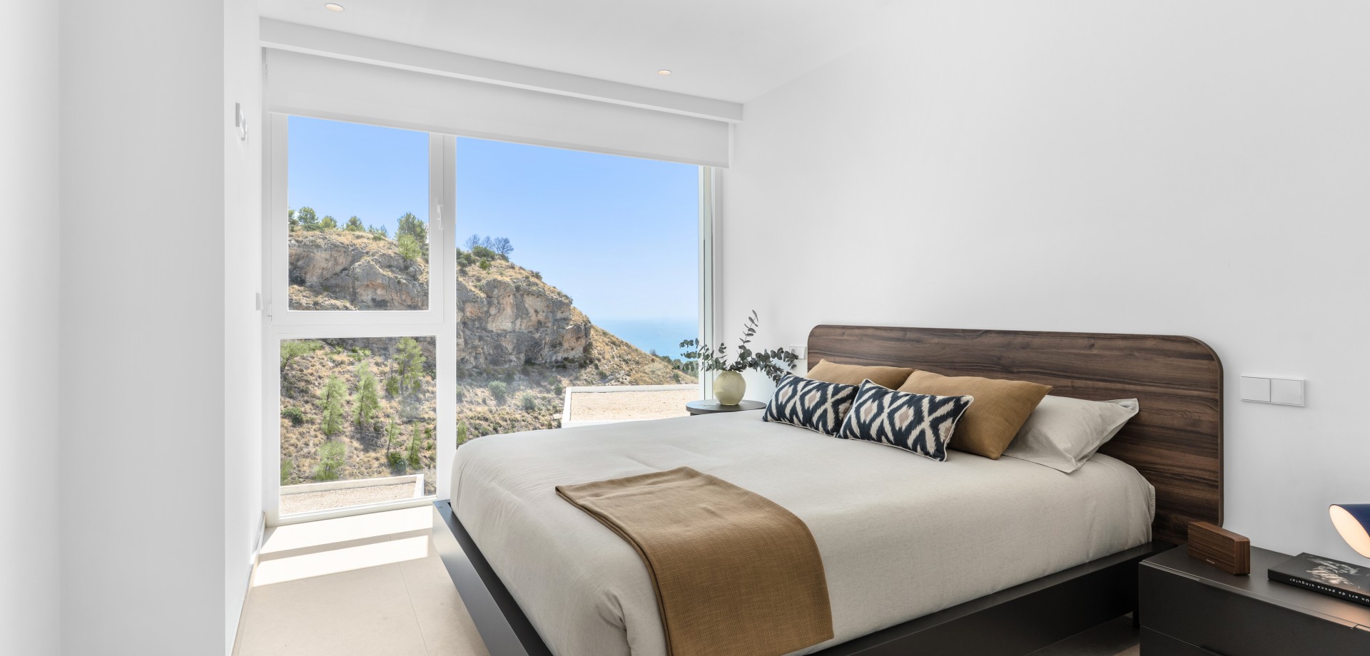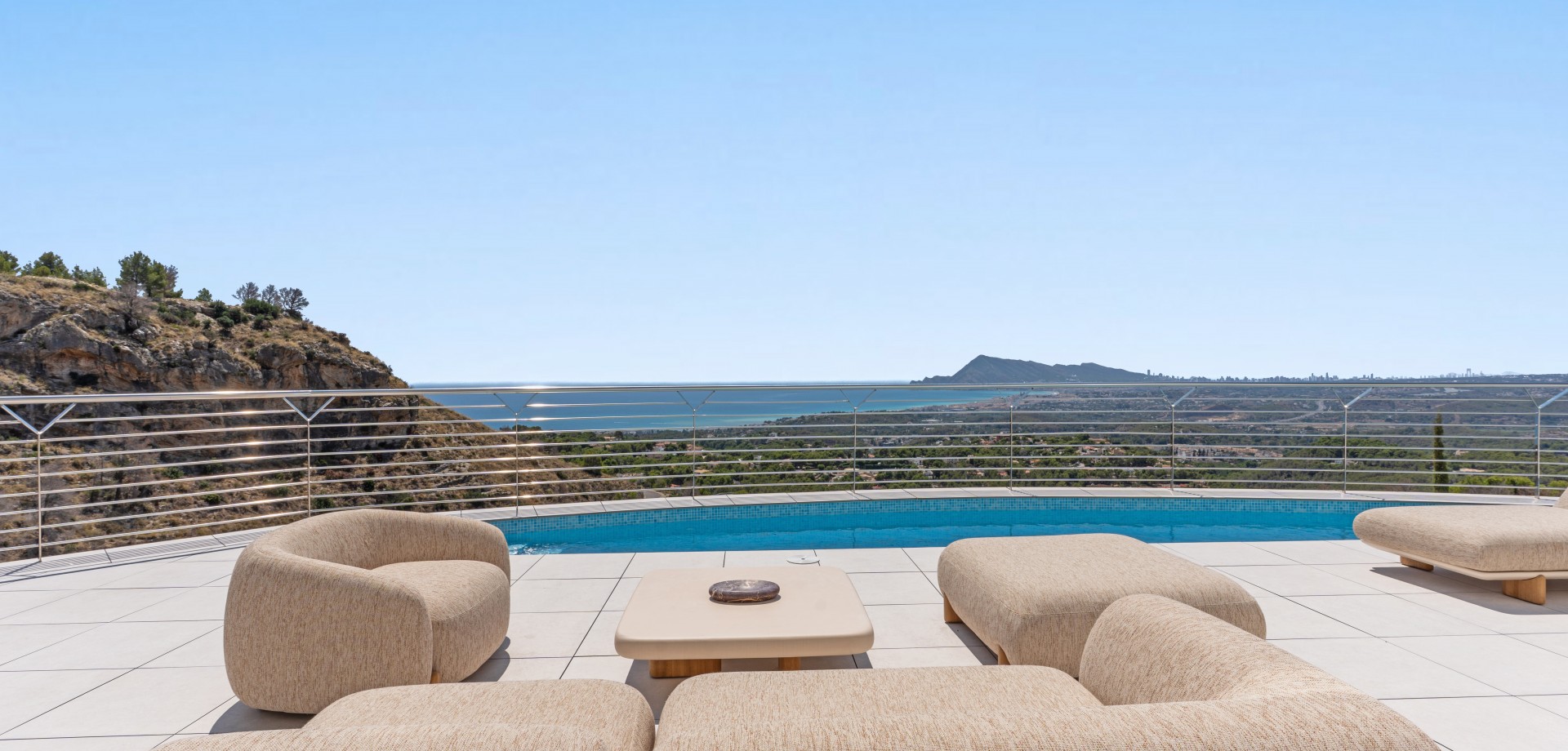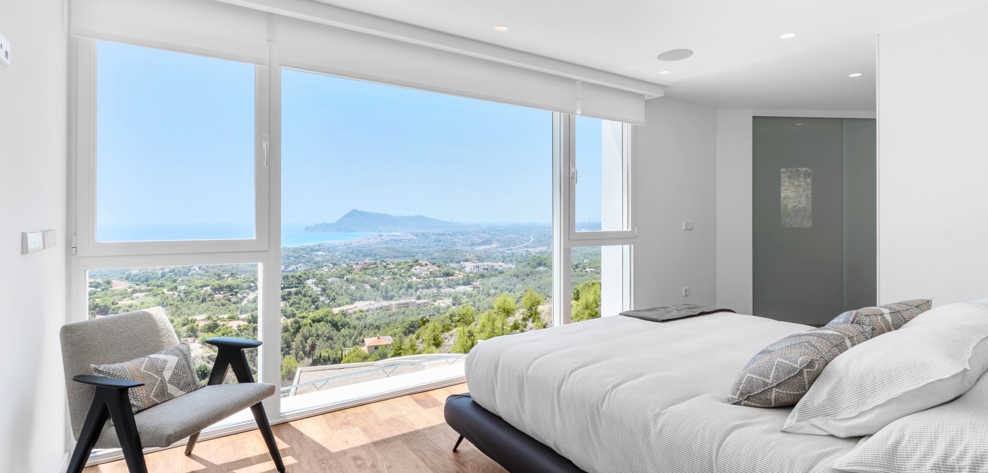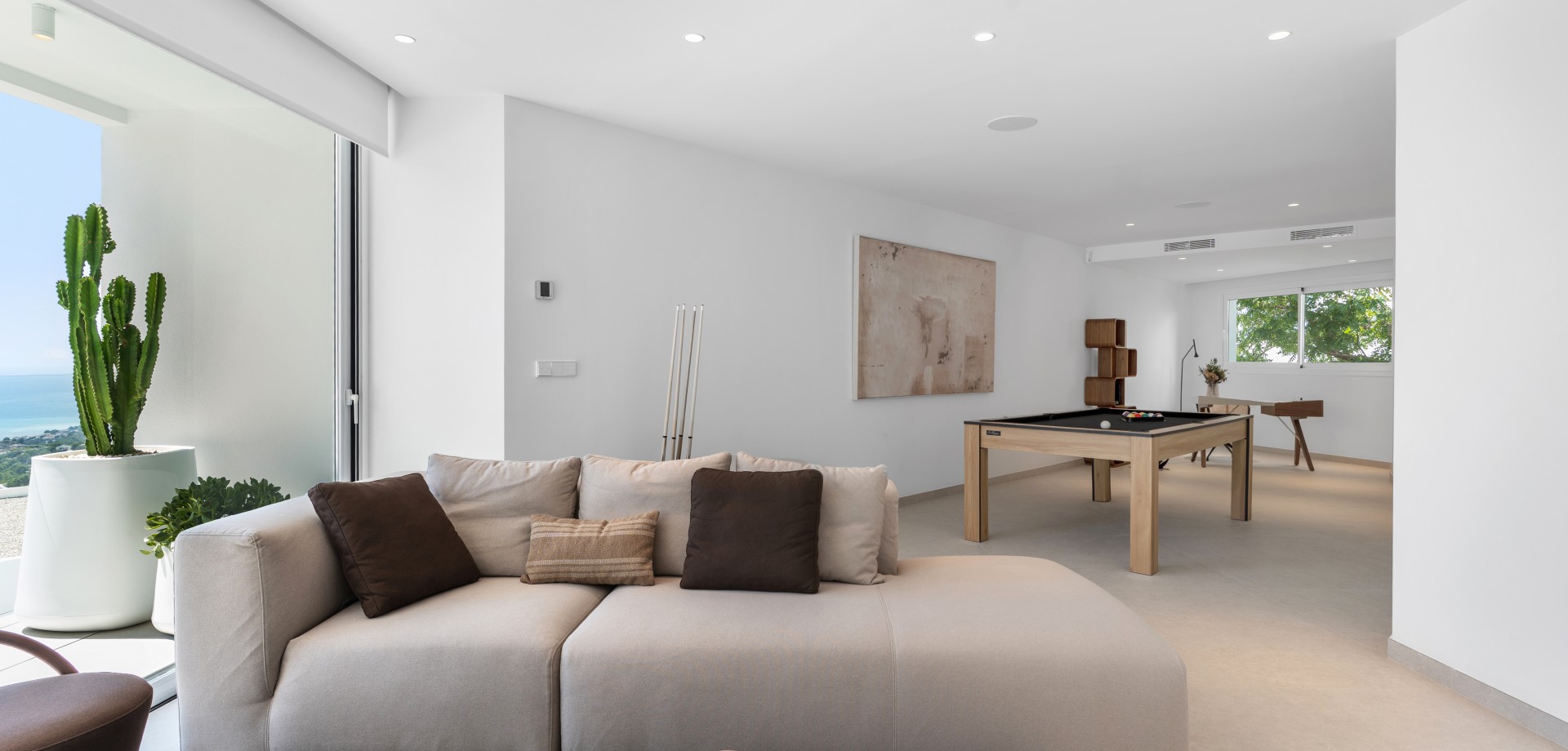 In Altea, zwischen dem Blau des Meeres und dem Grün der Pinienwälder, liegt Blanc-19 – ein vierstöckiges Haus mit einem Design, das geschaffen wurde, um die Landschaft einzufangen. Von seinen Terrassen aus erstrecken sich die Ausblicke über das Mittelmeer, die Küstenwälder und die Skyline von Benidorm und schaffen eine visuelle Verbindung, die jeden Tag zu einem besonderen Erlebnis macht. Das Haus erstreckt sich über mehrere Ebenen, die perfekt miteinander verbunden und durch einen Aufzug erschlossen sind. Die durchdachte Raumaufteilung ermöglicht die Trennung von Ruhe-, Freizeit- und Gemeinschaftsbereichen. Im Hauptgeschoss befinden sich die Gemeinschaftsräume: Wohnzimmer, Küche und Essbereich bilden ein offenes, helles Ensemble. In den oberen und unteren Etagen verteilen sich vier Schlafzimmer, ein Freizeitbereich mit TV- und Billardraum, ein Arbeitsbereich sowie mehrere Abstellräume. Das Hauptschlafzimmer befindet sich in der obersten Etage – ein privater Rückzugsort mit großzügigem Schlafzimmer, Ankleide, Bad mit freistehender Badewanne und eigener Terrasse. Die Immobilie verfügt zudem über eine geräumige Garage mit Platz für drei Fahrzeuge und eine Vorinstallation für eine Ladestation für Elektroautos. Das Haus ist bezugsfertig – komplett möbliert und dekoriert, bereit für den Einzug seiner zukünftigen Bewohner. Der Innenraum spiegelt eine klare, mediterrane Ästhetik wider: Böden in Sandtönen, weiße Flächen und große Fensterfronten, die die Räume mit Licht durchfluten. Blanc-19 ist mit hochwertigen Materialien, effizienter Technik und allen Elementen ausgestattet, die ein komfortables und modernes Wohnen ermöglichen. Vom ersten Schritt ins Haus an ist die Landschaft präsent. Warme Sonnenuntergänge, ungehinderte Ausblicke und eine konstante Ruhe machen dieses Haus zu einem authentischen Ausdruck des mediterranen Lebensstils.