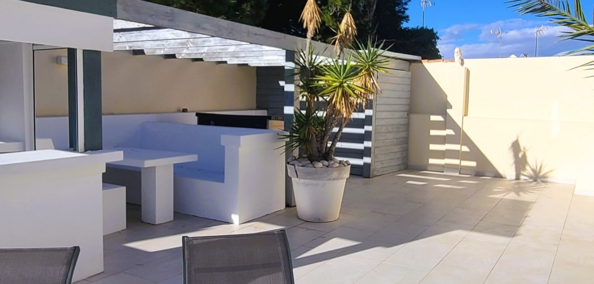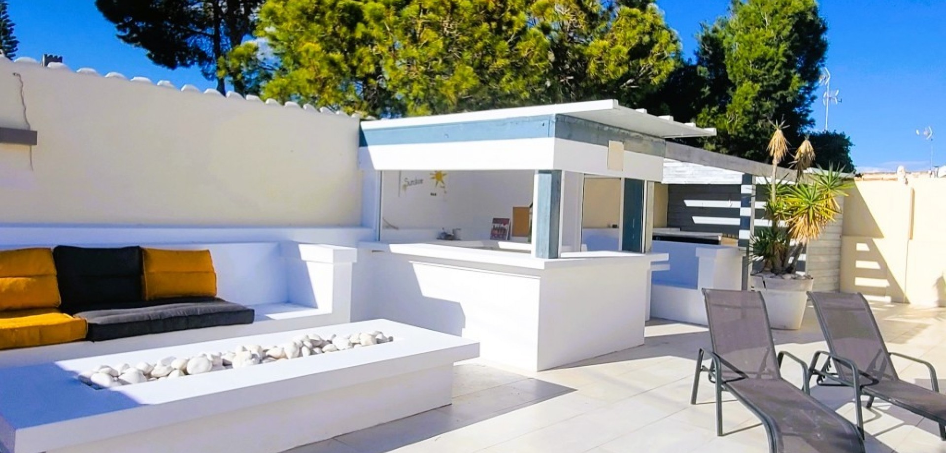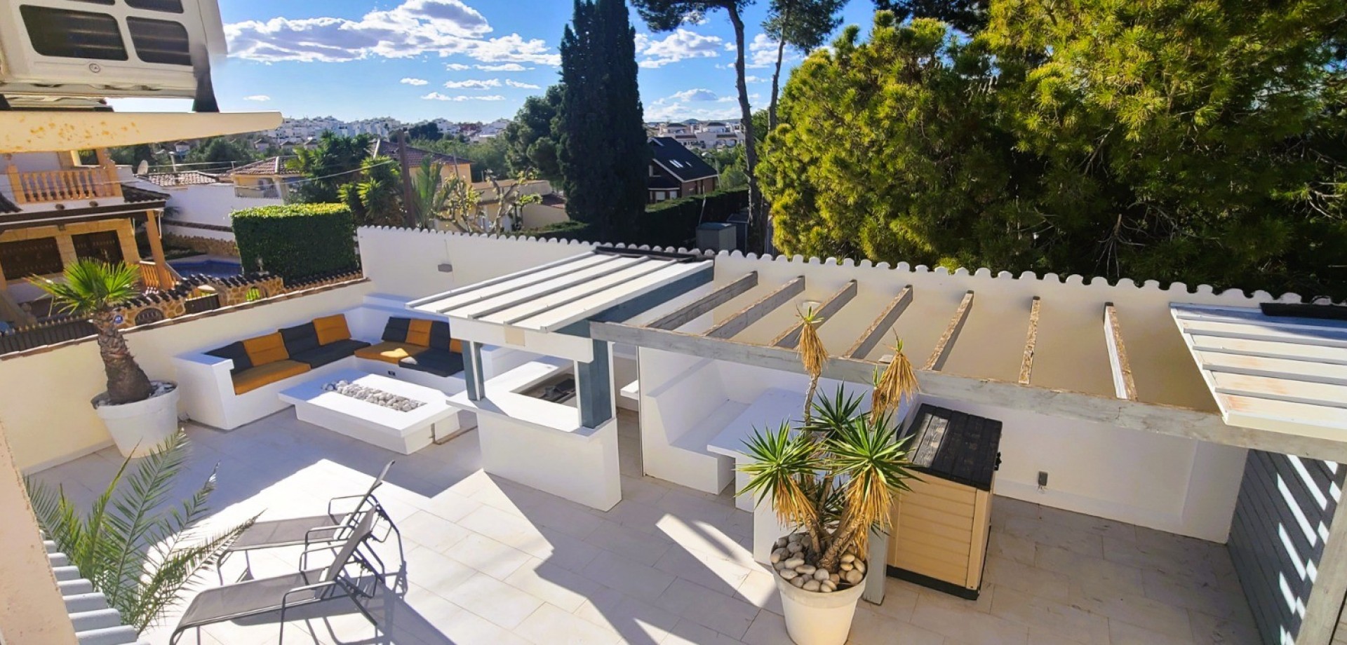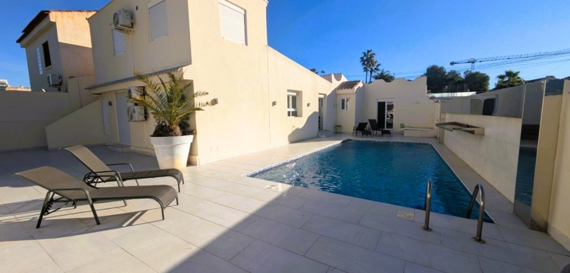 Diese außergewöhnliche, moderne Villa befindet sich auf einem Eckgrundstück in einer begehrten Lage zwischen Torrevieja und Orihuela Costa und bietet stilvolles Wohnen im Innen- und Außenbereich ohne Gemeinschaftsgebühren. Das Anwesen verfügt über einen privaten 8 x 4 Meter großen Swimmingpool mit Wasserfall, umgeben von einem beeindruckenden Unterhaltungsbereich mit integrierter Lounge, Gasfeuerstelle, Essbereich im Freien und einer privaten Bar – perfekt, um den mediterranen Lebensstil zu genießen.