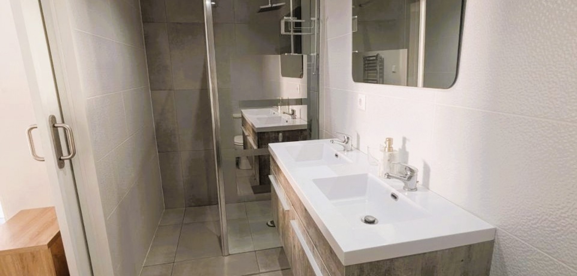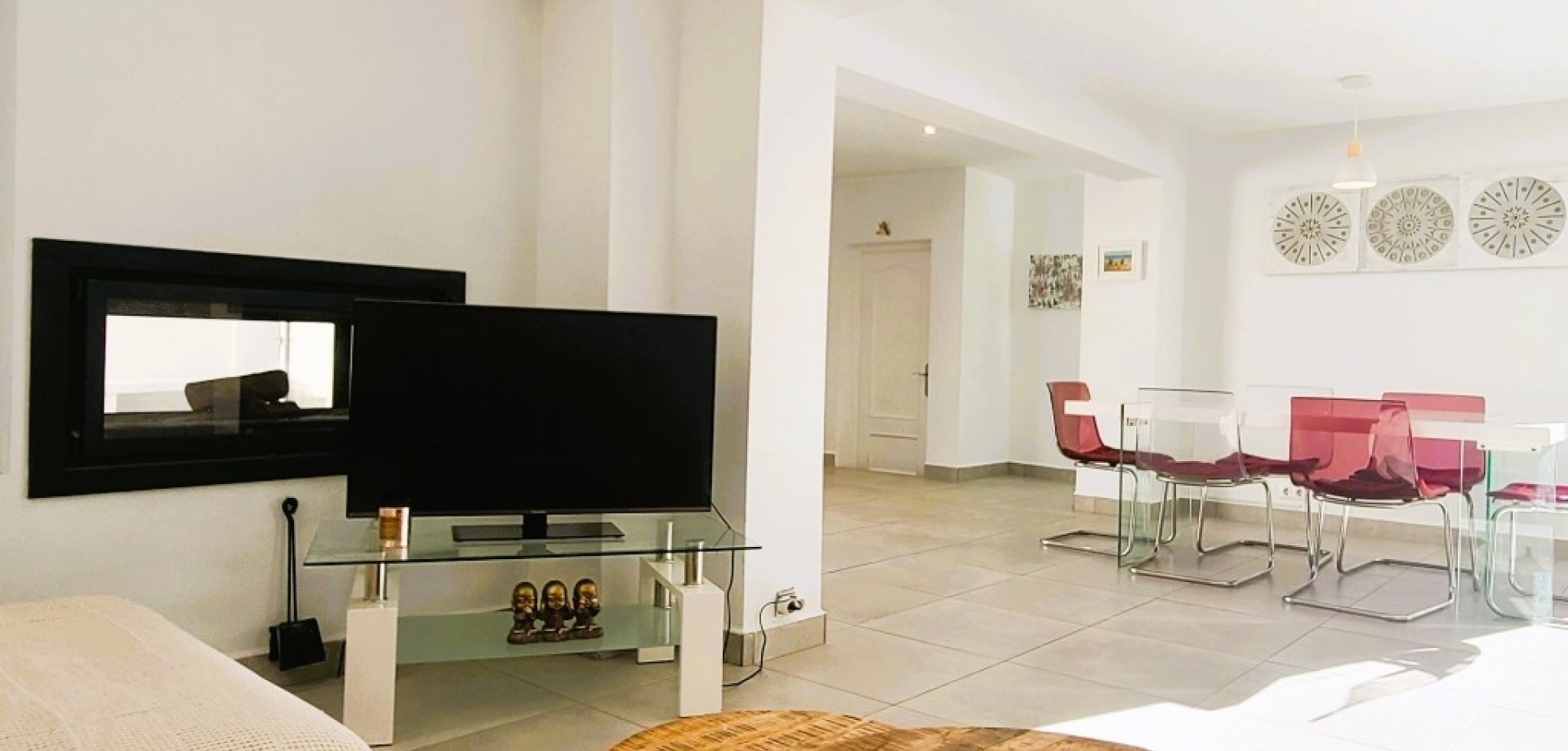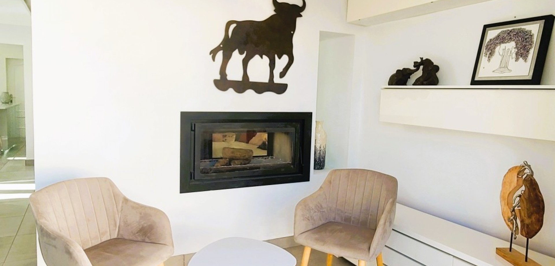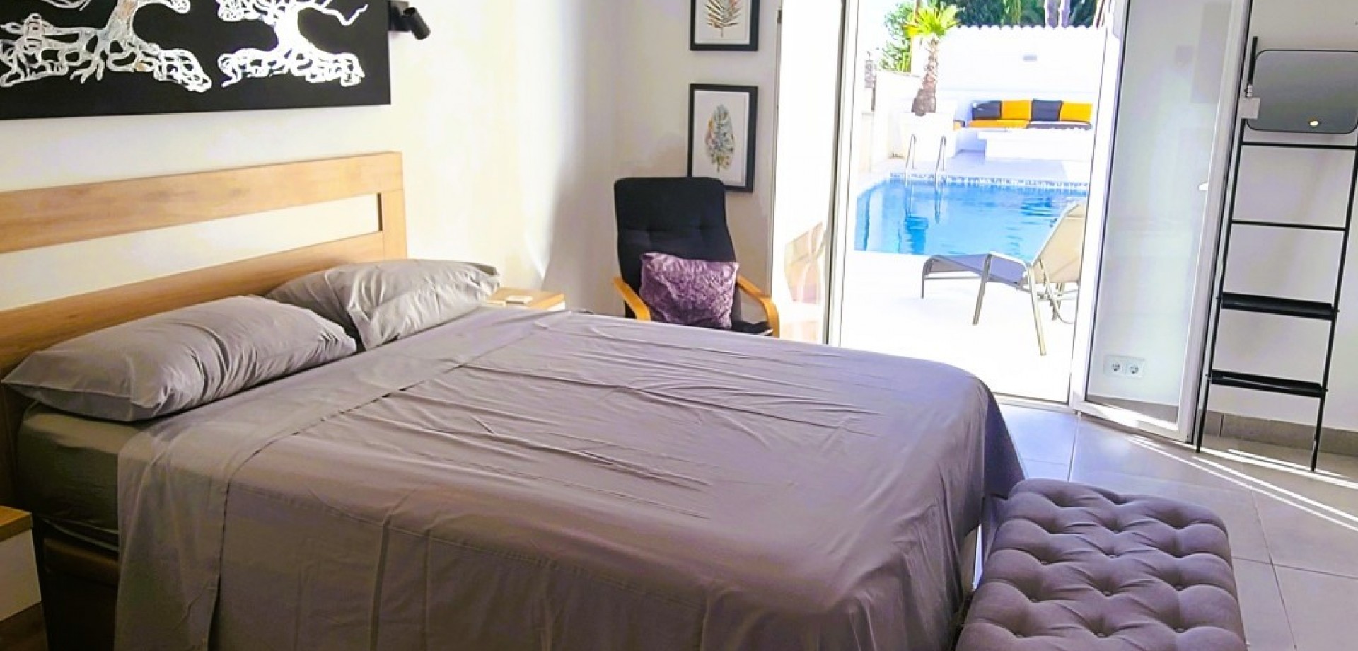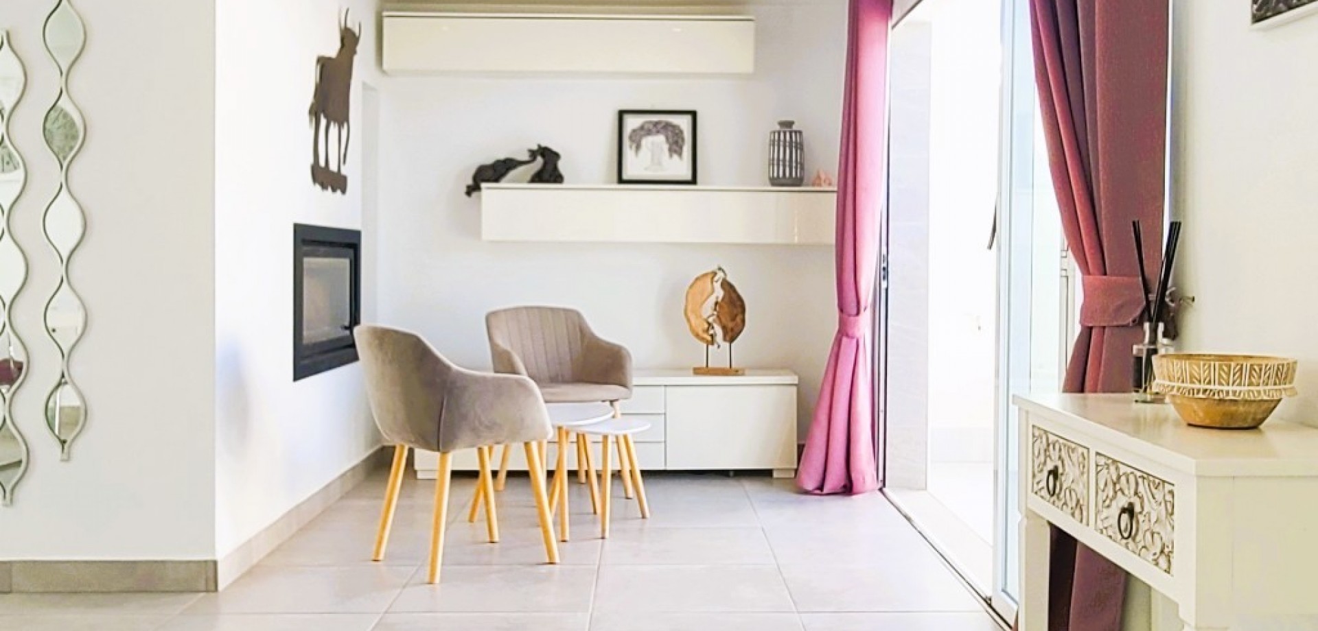 Im Inneren besticht die Villa durch einen hellen, offenen Grundriss mit Wohnzimmer, Essbereich und moderner Küche. Große Falttüren lassen viel Tageslicht herein. Ein Kaminofen mit zwei Fensterfronten sorgt für Gemütlichkeit und Charakter. Im Erdgeschoss befinden sich drei Schlafzimmer, darunter eine Master-Suite mit eigenem Bad und direktem Zugang zu den Terrassen und dem Poolbereich, sowie ein Familienbad mit Whirlpool und ebenerdiger Dusche.