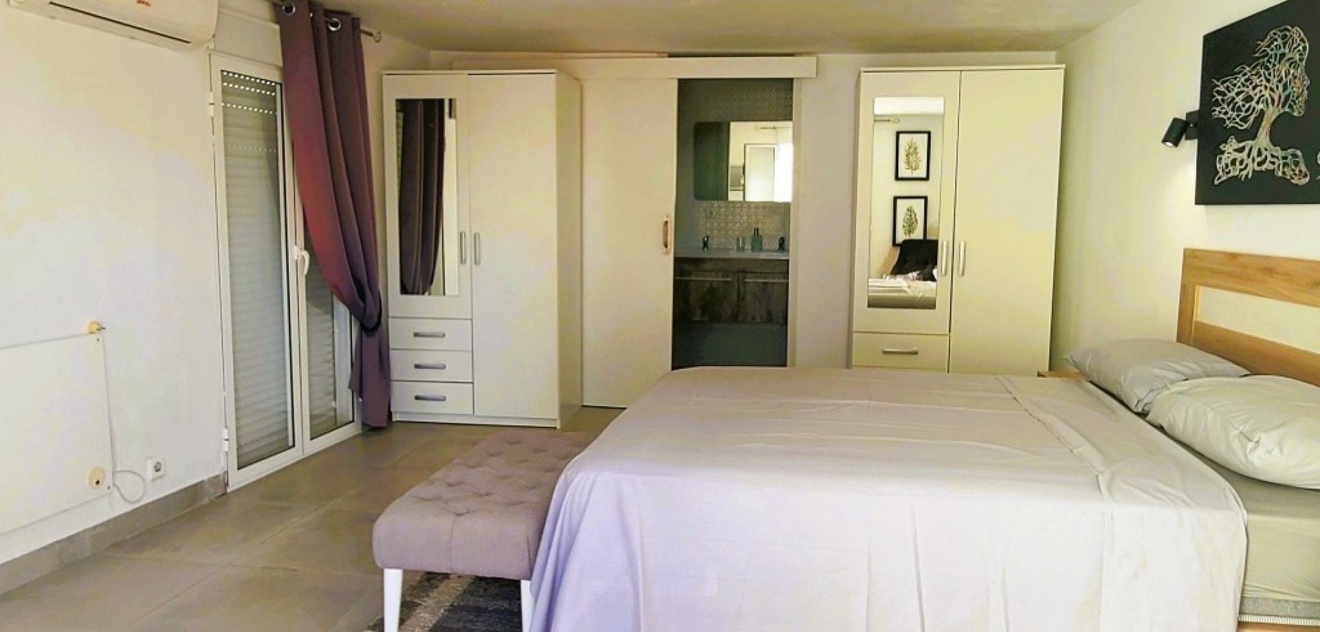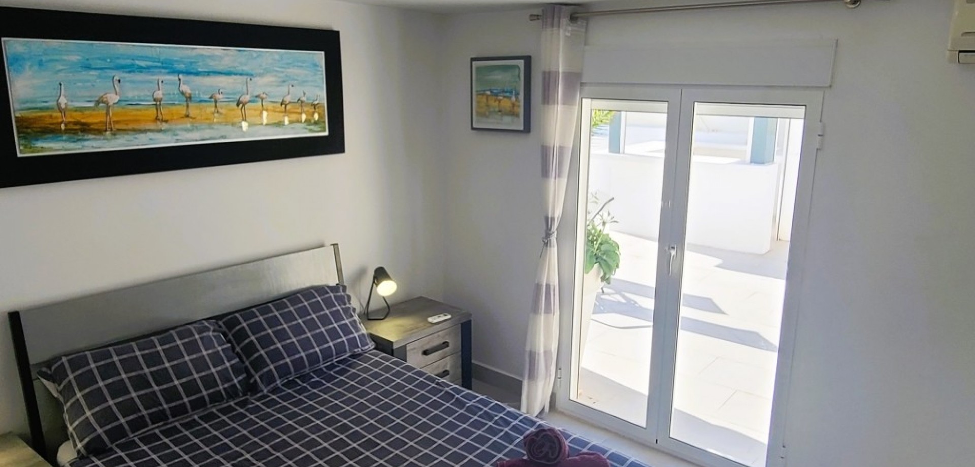 Eine Außentreppe führt zu einem vierten Schlafzimmer mit eigenem Bad, ideal für Gäste, mit herrlichem Blick auf den Garten und die umliegende Landschaft. Zu den weiteren Ausstattungsmerkmalen gehören eine Klimaanlage, ein Hauswirtschaftsraum, Abstellräume, ein pflegeleichter Garten und eine niedrige jährliche Grundsteuer von ca. 275 €.