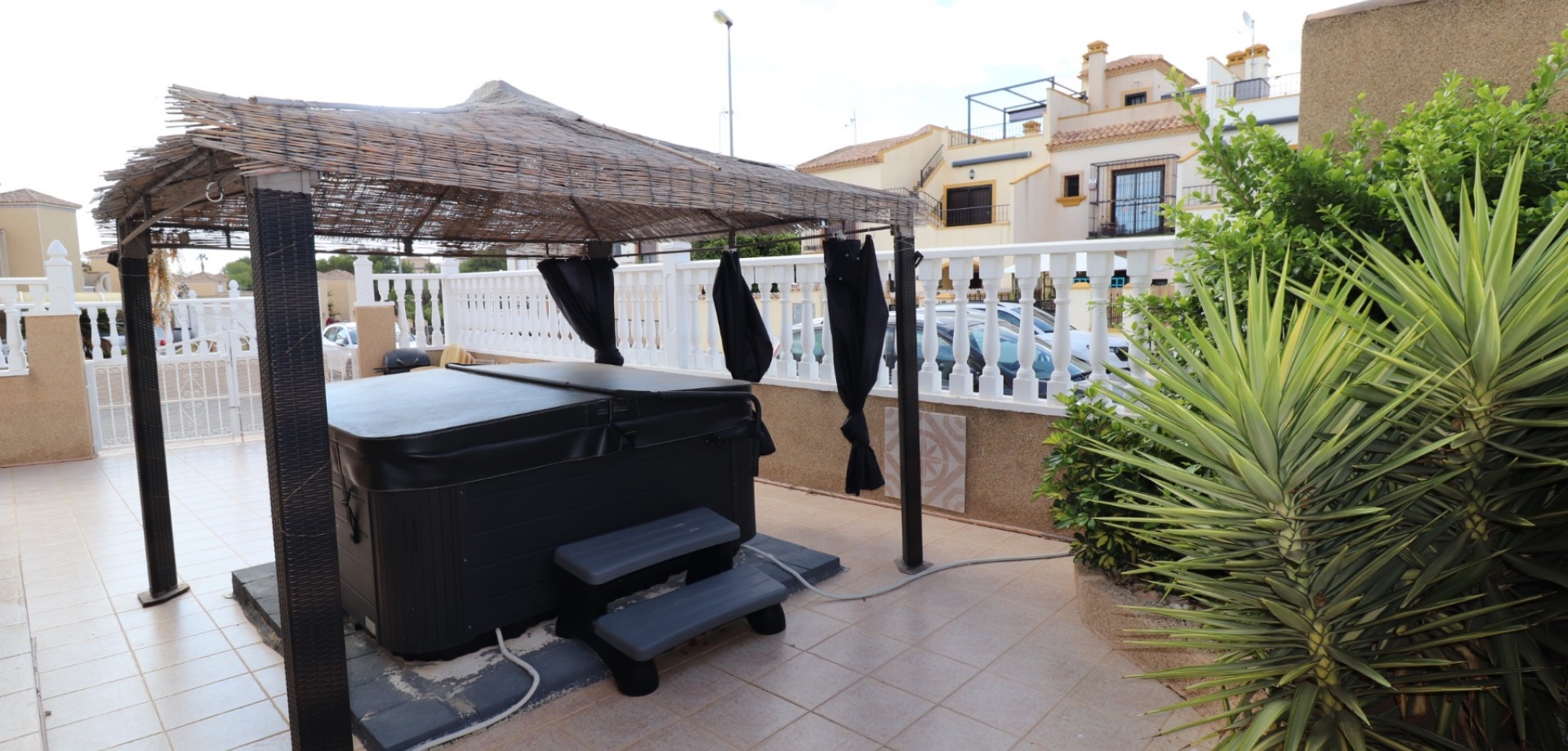 Der Außenbereich lädt zum Entspannen und Verweilen ein und bietet mehrere Terrassen (eine davon überdacht), einen privaten Whirlpool, einen Stellplatz und einen zusätzlichen Abstellraum. Das Haus ist klimatisiert (Wohnzimmer und alle Schlafzimmer) und wird komplett möbliert verkauft – sofort bezugsfertig. Dank gültiger touristischer Lizenz bietet es hervorragende Vermietungsmöglichkeiten.