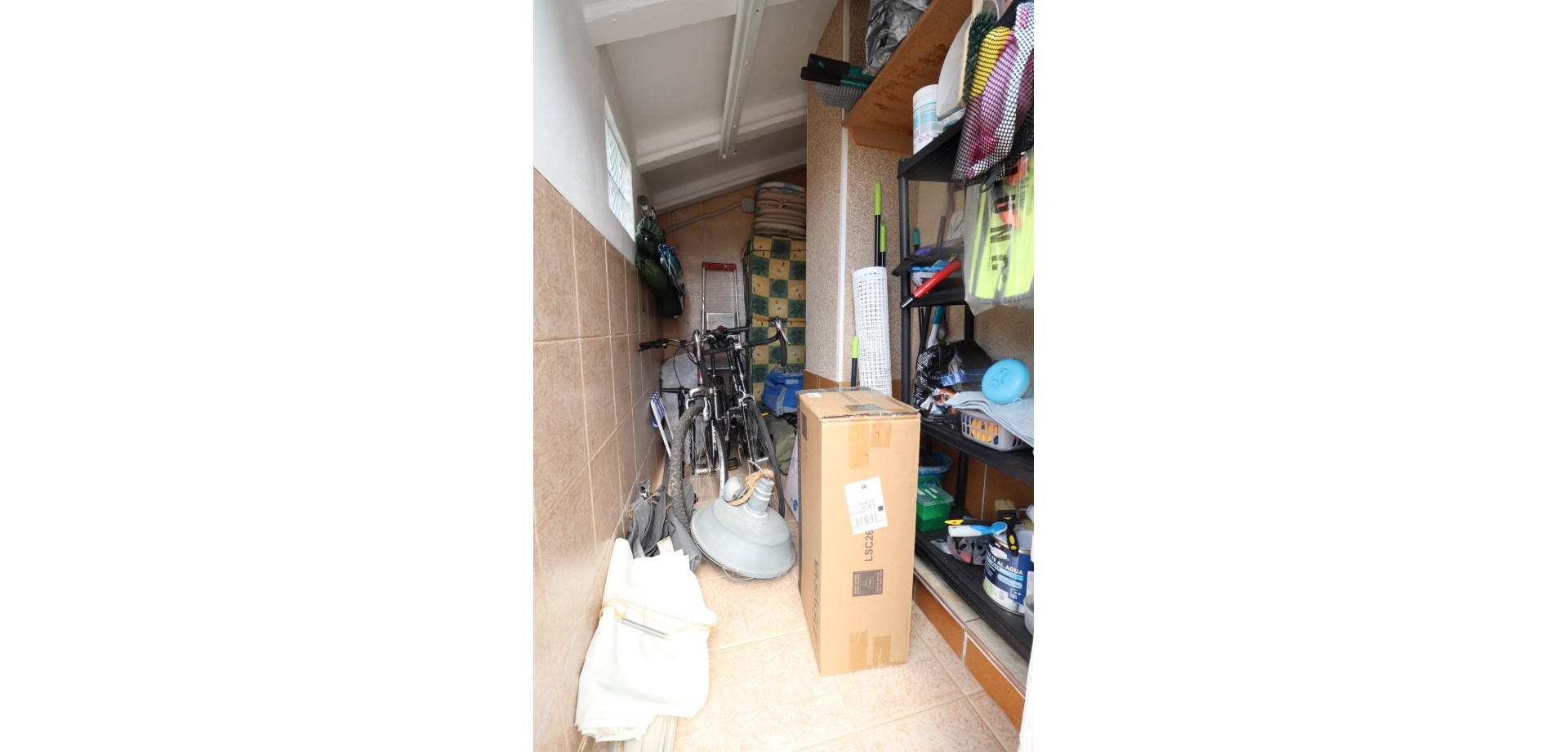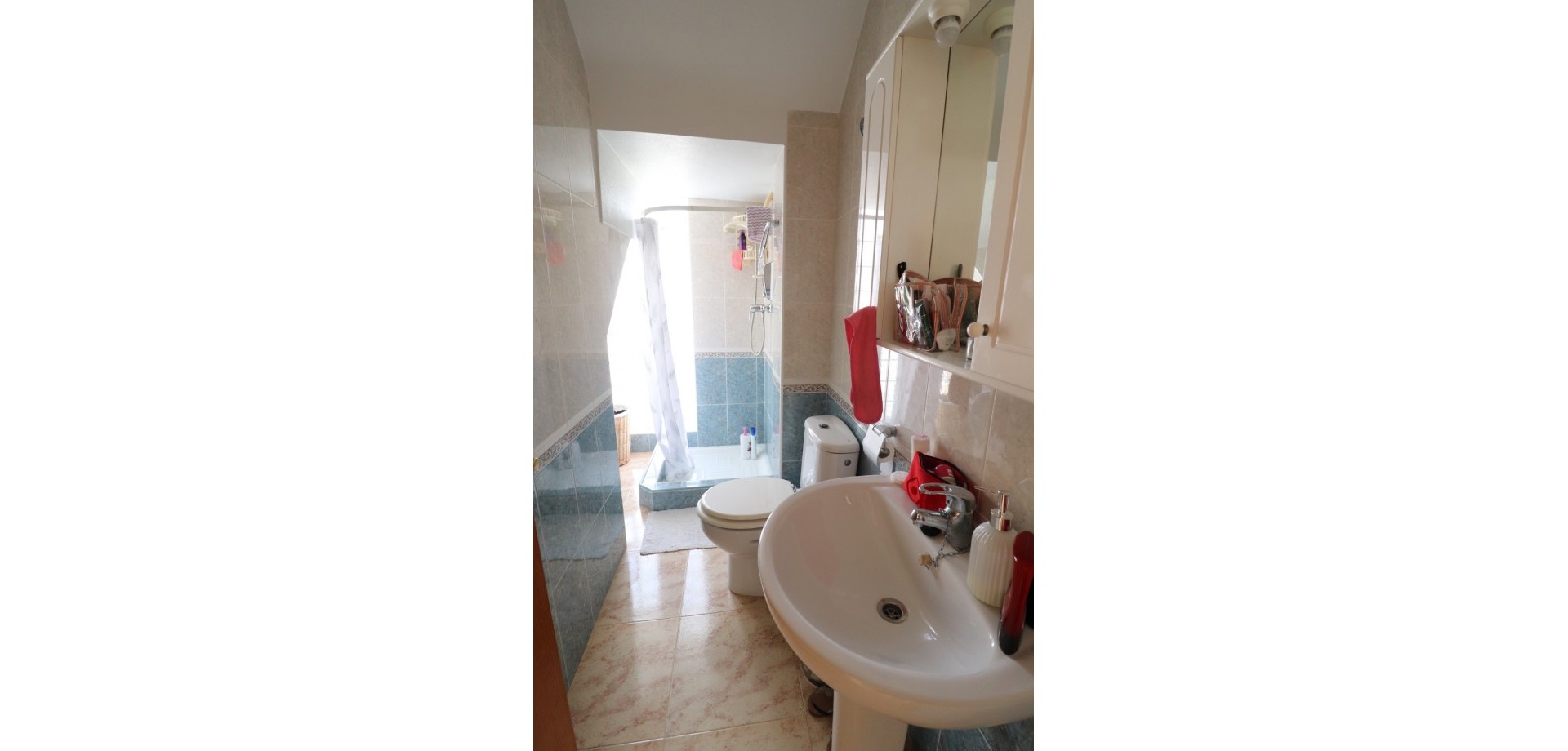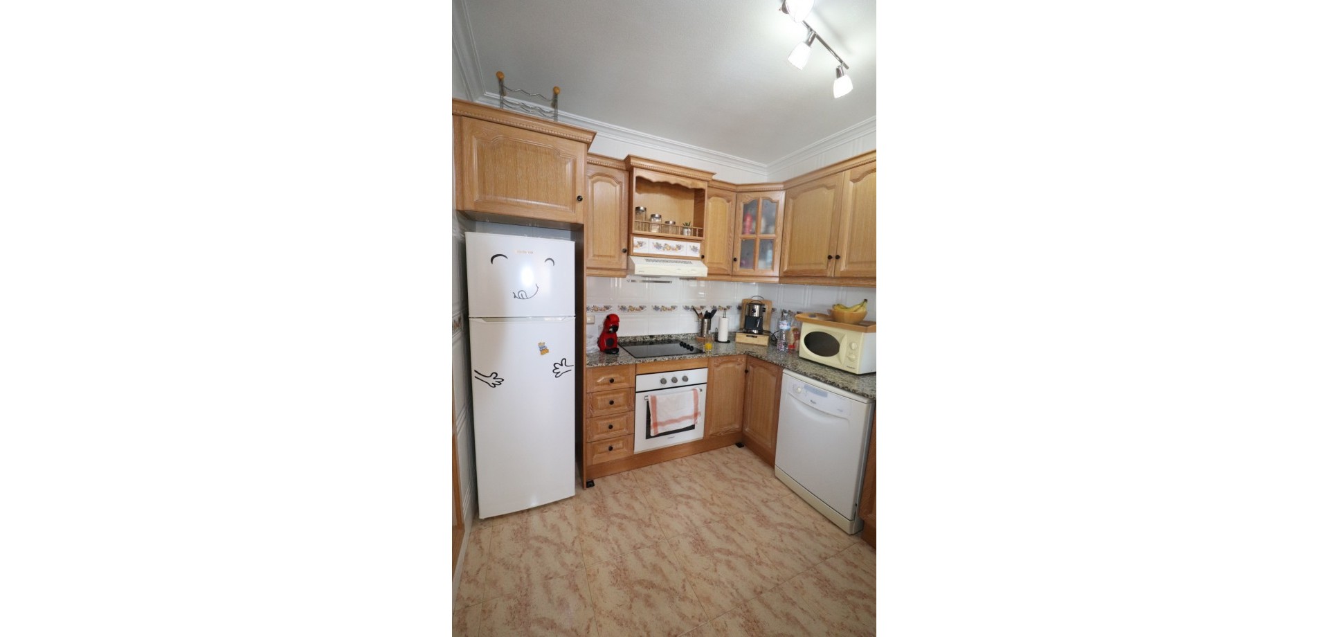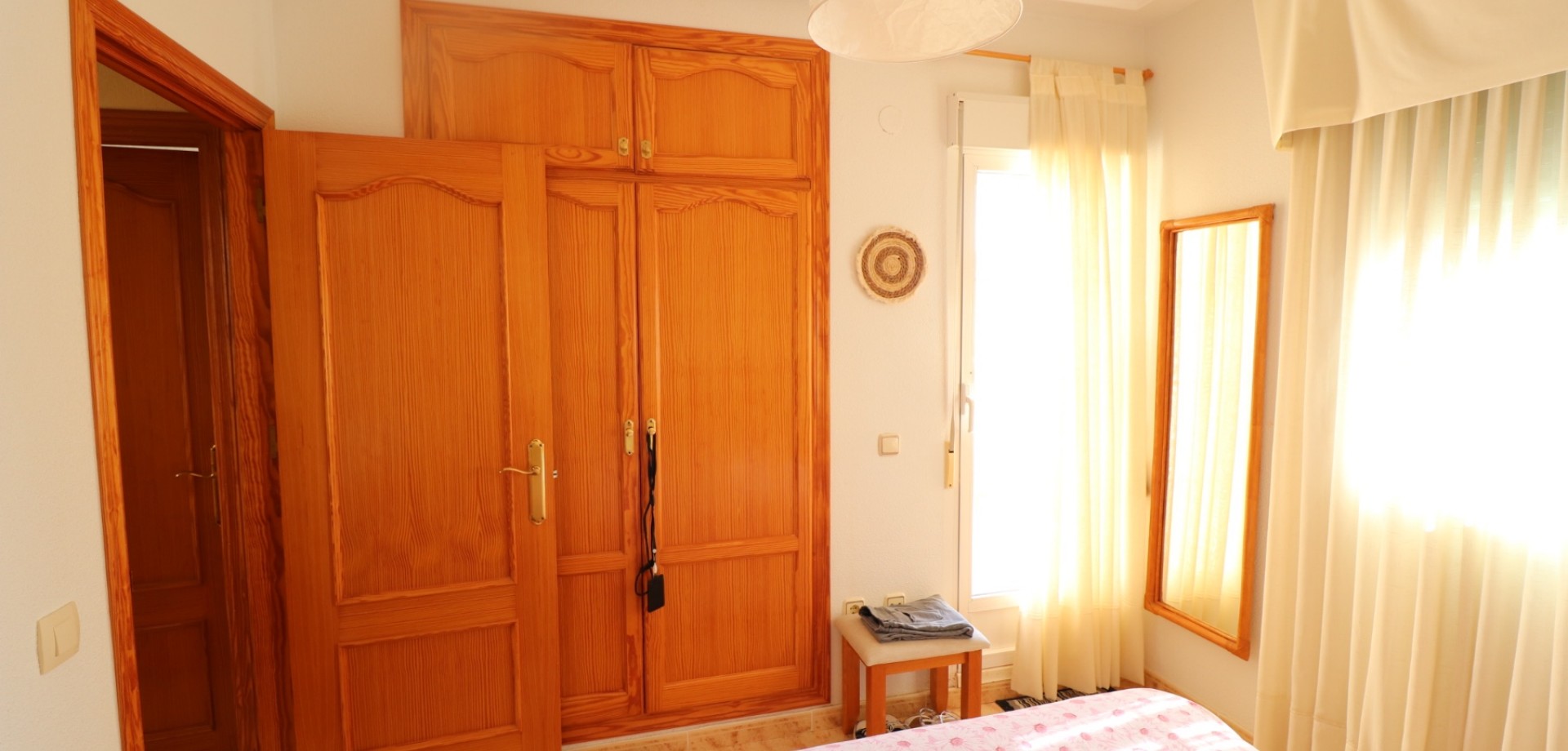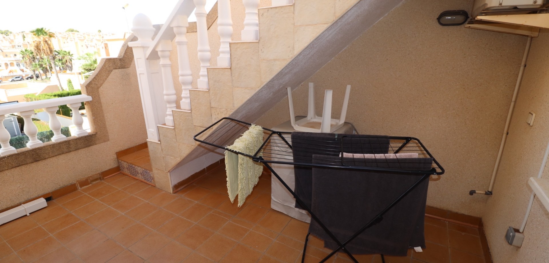 Das Haus erstreckt sich über zwei Etagen. Im Erdgeschoss befinden sich eine offene Küche mit angrenzendem hellen Wohnzimmer, ein Schlafzimmer und ein modernes Badezimmer. Im Obergeschoss erwarten Sie zwei weitere Schlafzimmer, jeweils mit Einbauschrank, und ein zweites Badezimmer. Eines der Schlafzimmer verfügt über einen privaten Balkon. Von hier aus gelangen Sie auf eine Terrasse mit Zugang zu einem privaten Solarium und einem Abstellraum – perfekt, um die mediterrane Sonne zu genießen.