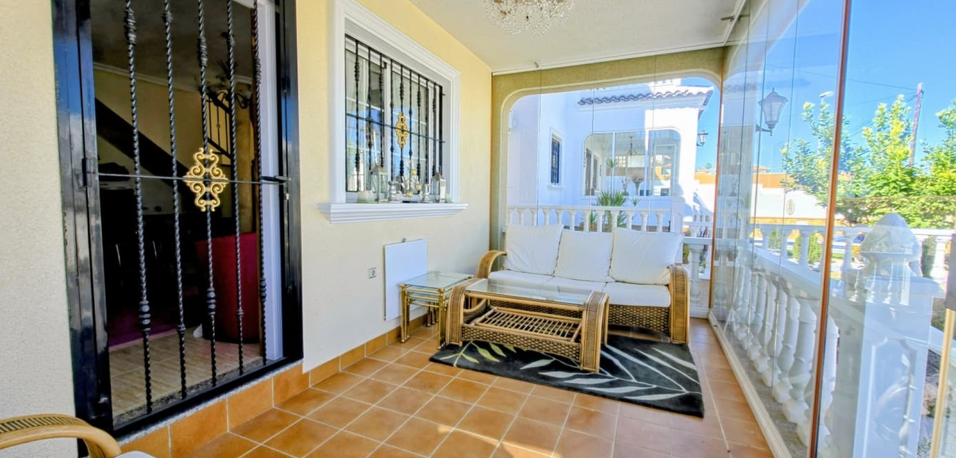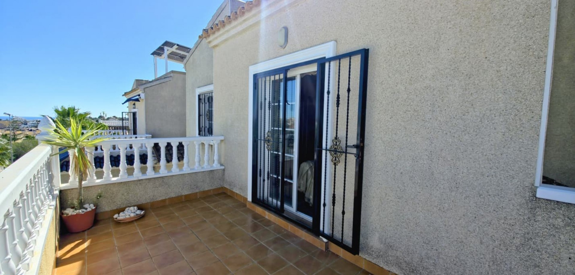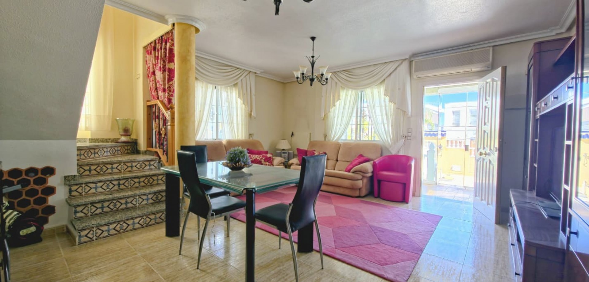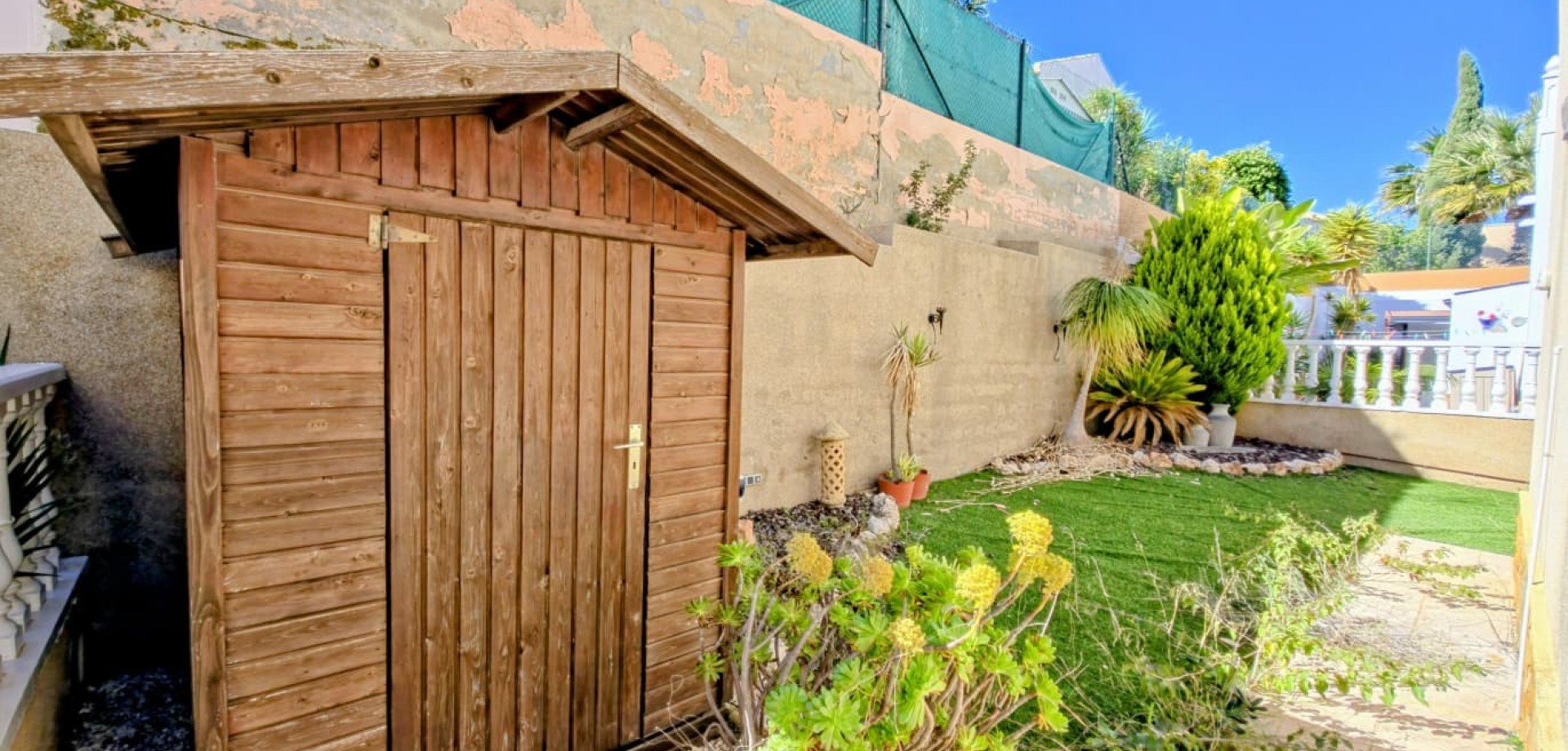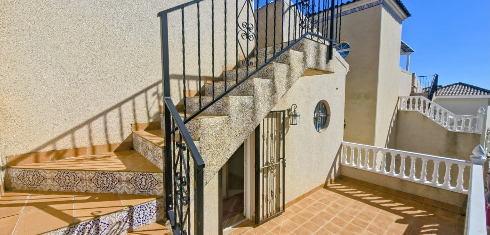Das Haus liegt auf einem privaten Grundstück und verfügt über drei große Schlafzimmer, zwei Badezimmer, ein helles, geräumiges Wohnzimmer, eine separate, voll ausgestattete Küche sowie einen praktischen Hauswirtschaftsraum. Mehrere Terrassen bieten ideale Außenbereiche zum Entspannen oder für gesellige Stunden, während ein Abstellraum zusätzlichen Komfort bietet.