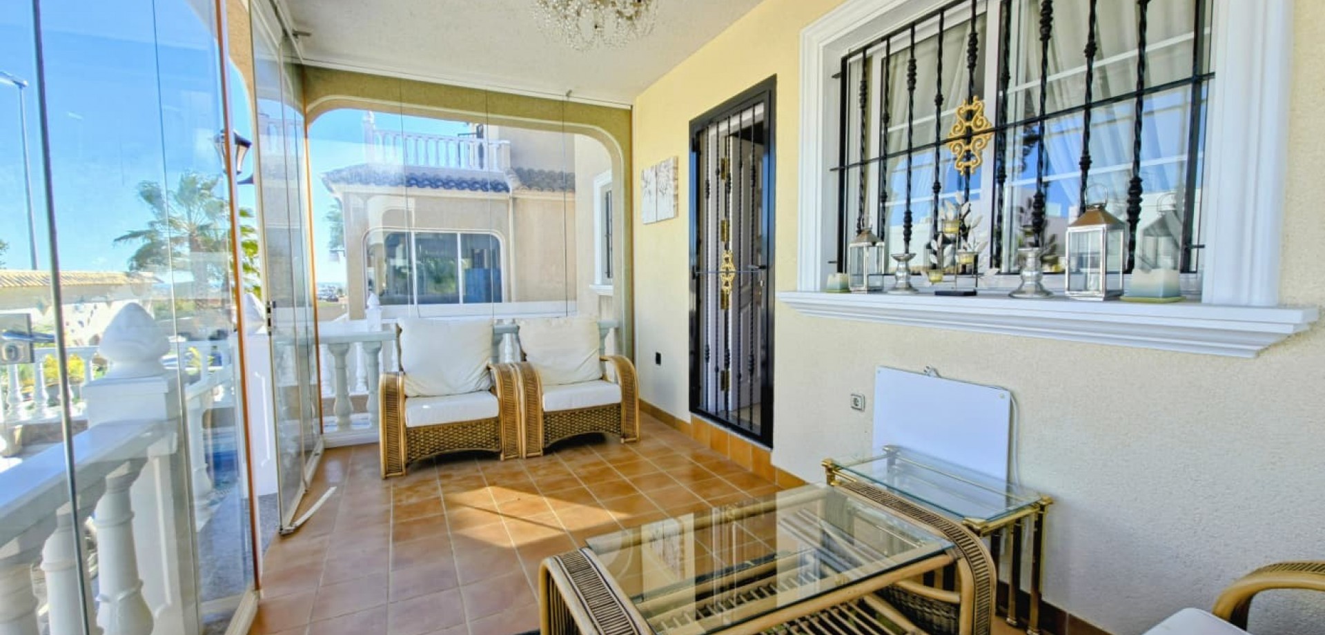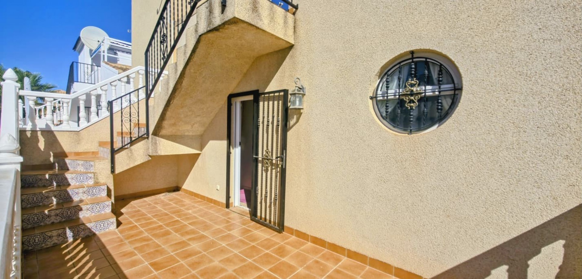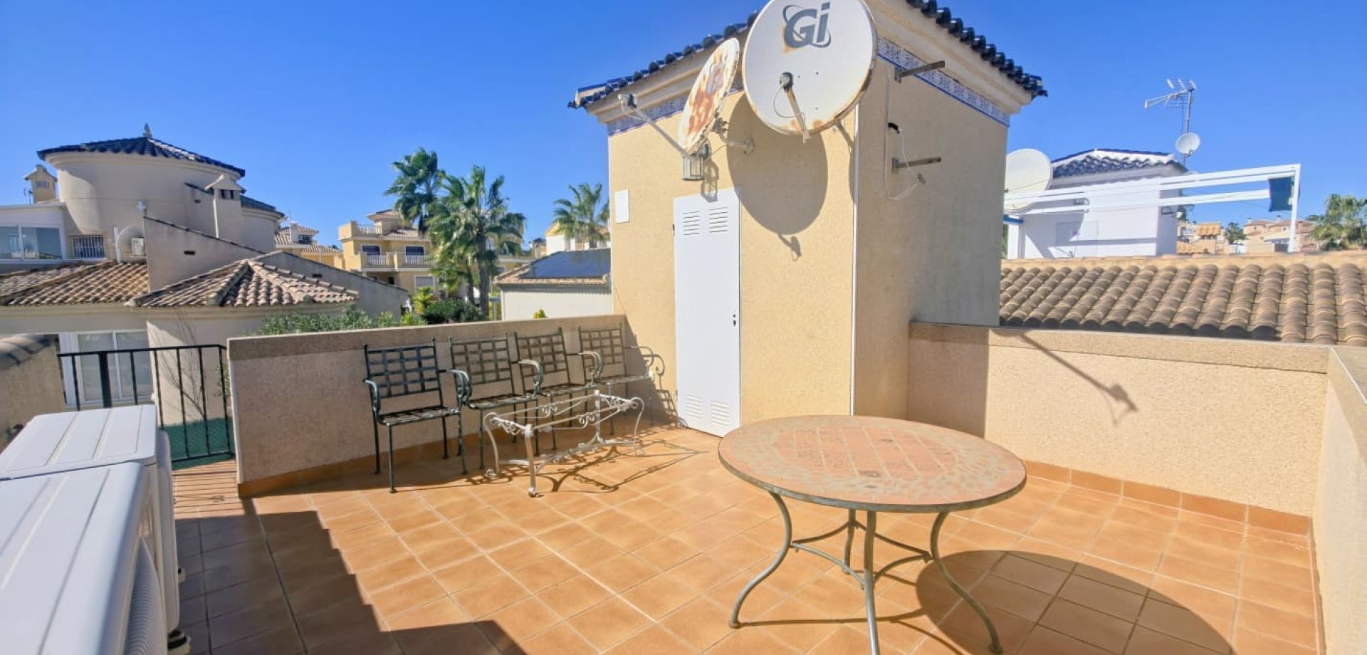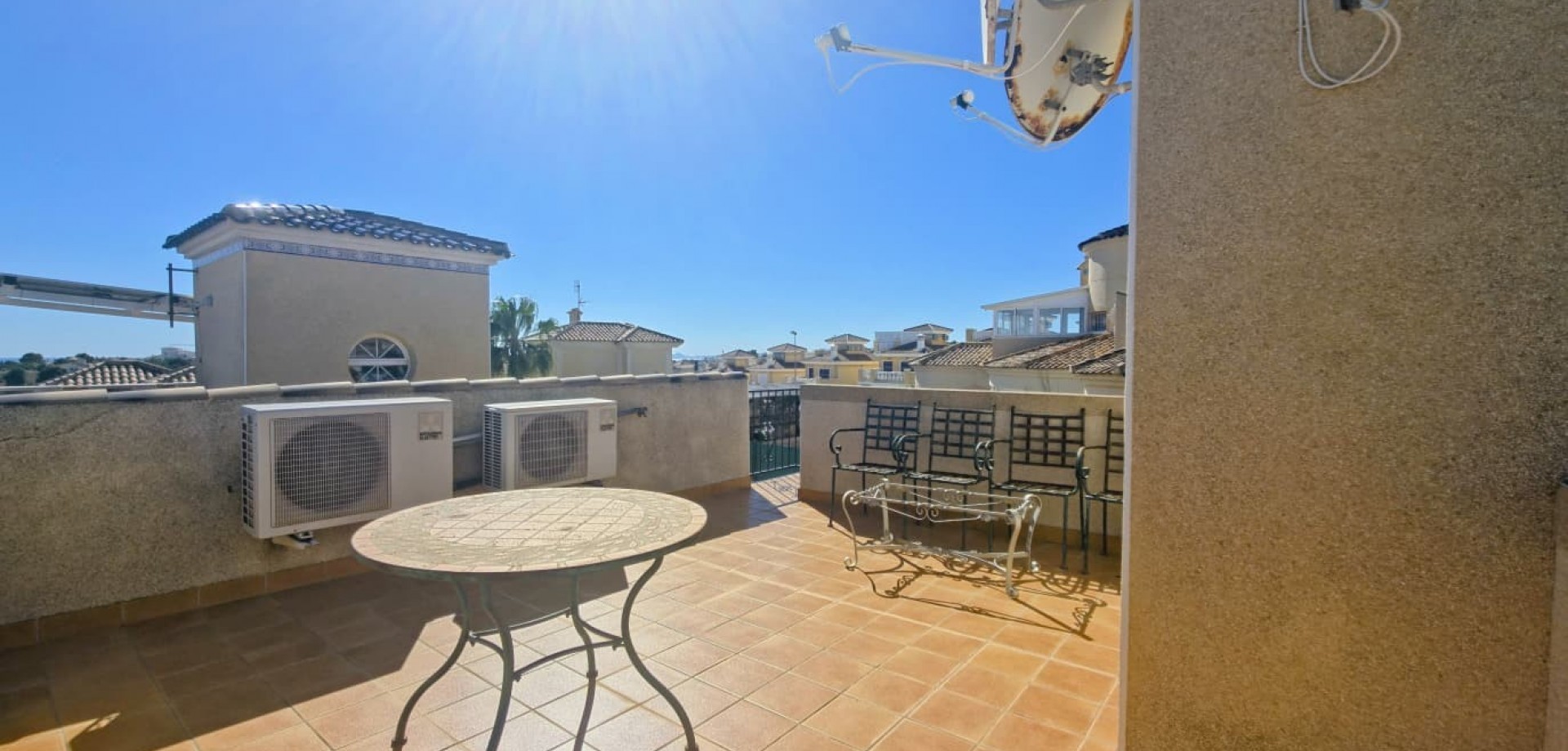 Das Haus liegt auf einem privaten Grundstück und verfügt über drei große Schlafzimmer, zwei Badezimmer, ein helles, geräumiges Wohnzimmer, eine separate, voll ausgestattete Küche sowie einen praktischen Hauswirtschaftsraum. Mehrere Terrassen bieten ideale Außenbereiche zum Entspannen oder für gesellige Stunden, während ein Abstellraum zusätzlichen Komfort bietet.