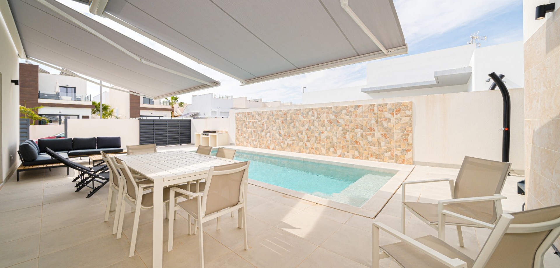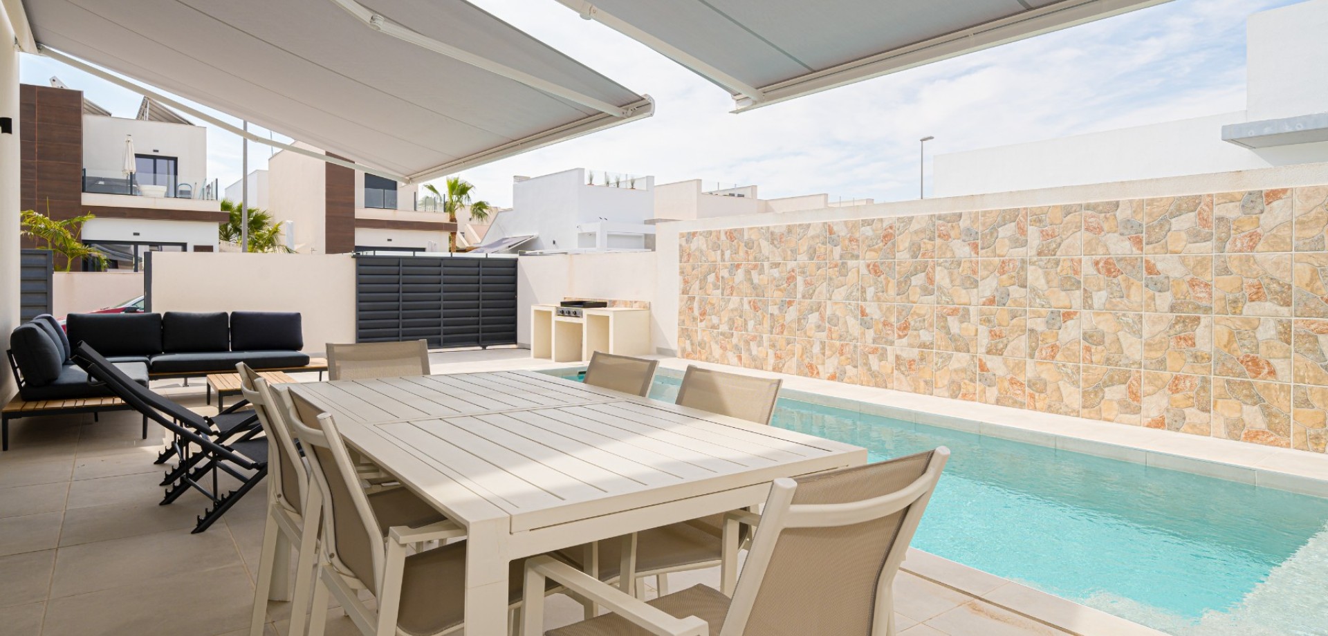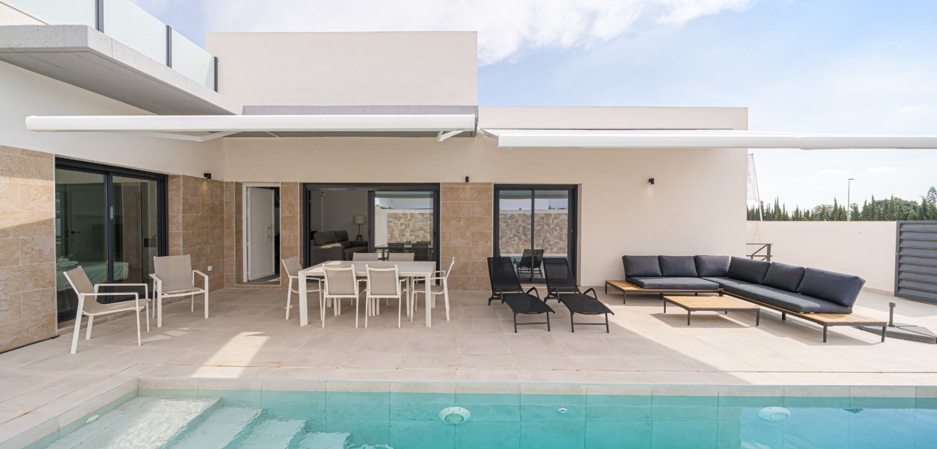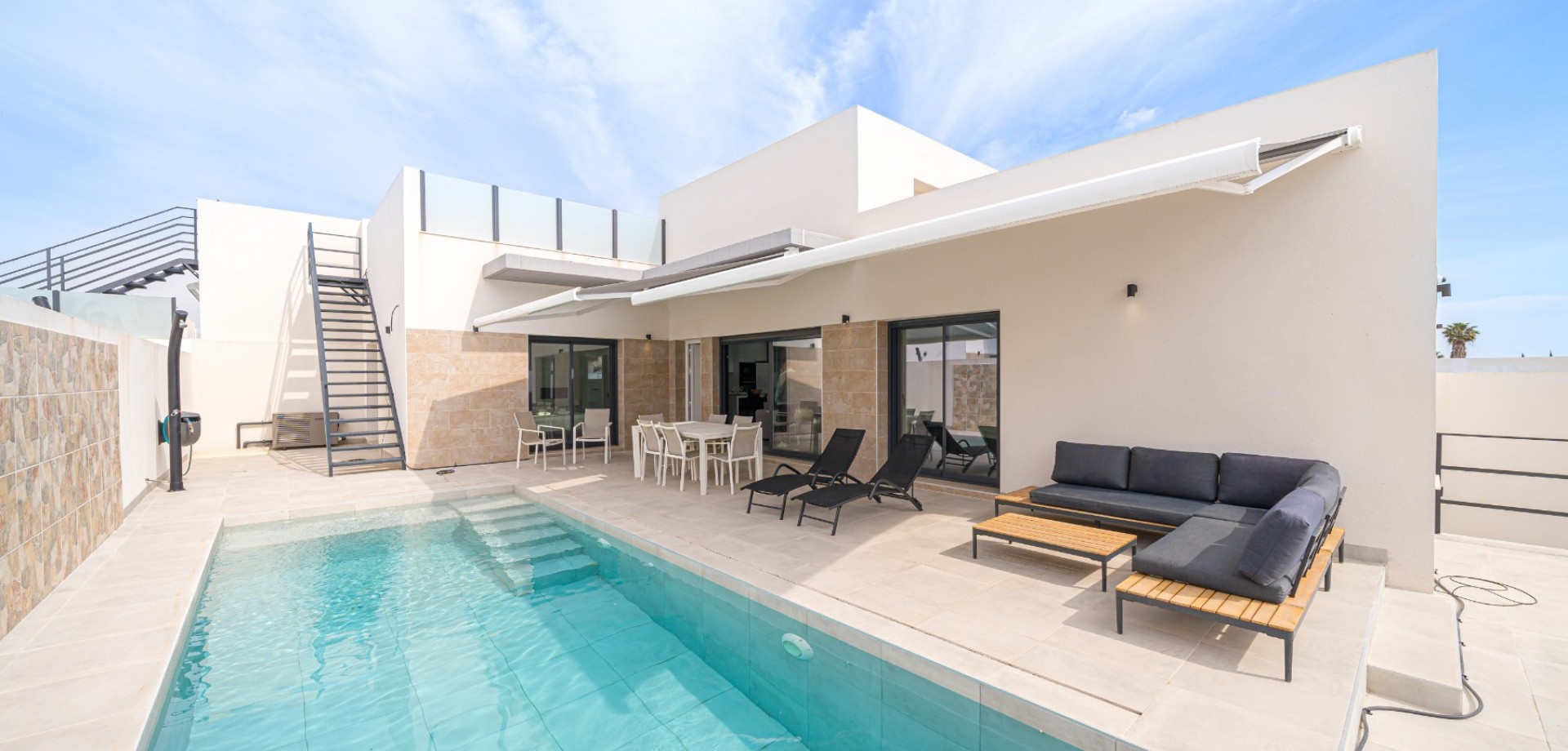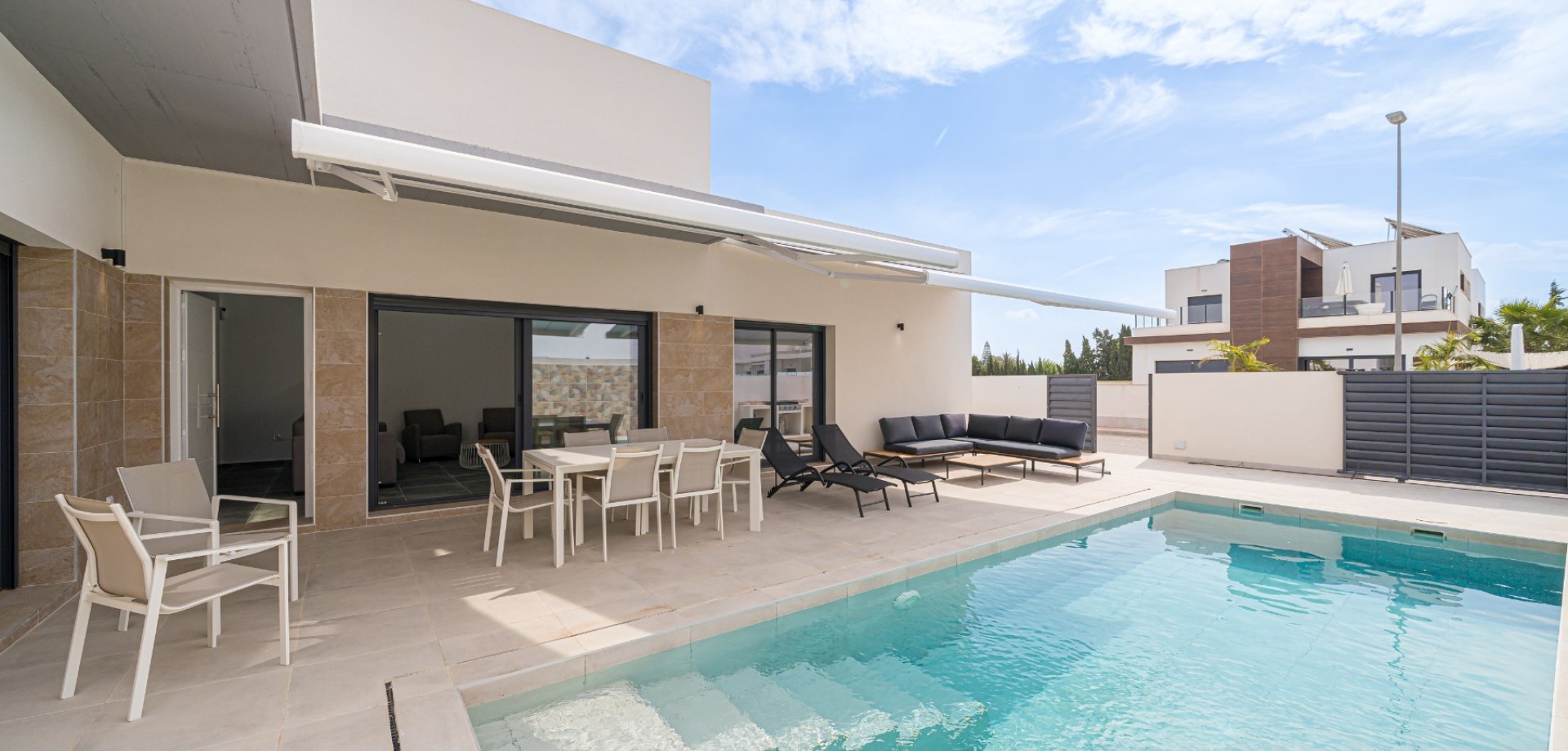 Entdecken Sie modernes mediterranes Wohnen in dieser wunderschönen, zeitgenössischen 3-Zimmer-Villa in Daya Nueva, perfekt gelegen in einer ruhigen und exklusiven Wohngegend an der Costa Blanca. Stilvolles Design, großzügiger Außenbereich und die friedliche Lage in einem Dorf machen diese Immobilie ideal als Hauptwohnsitz, Ferienhaus oder Kapitalanlage.