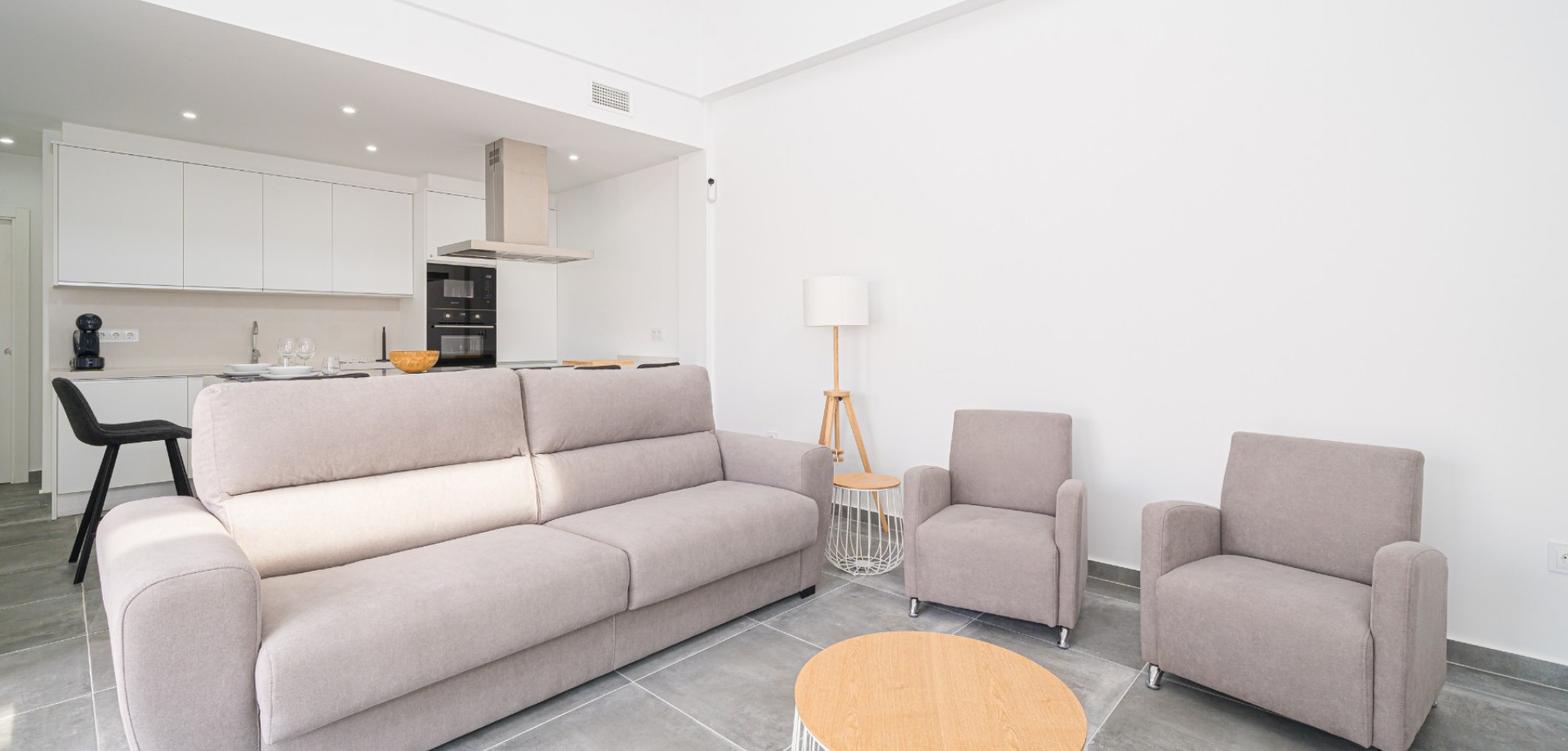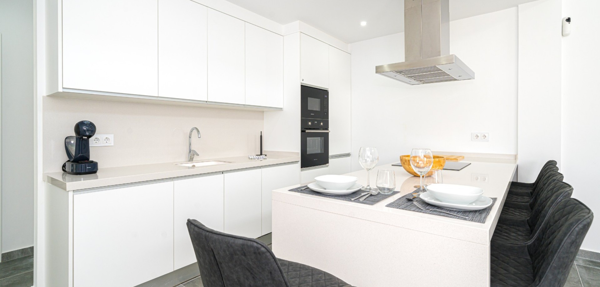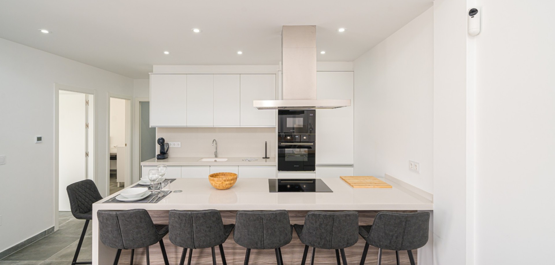 Diese 100 m² große, moderne Villa vereint moderne Architektur mit mediterranem Charme. Der helle, offene Wohnbereich geht fließend in die elegante Küche im amerikanischen Stil über und schafft so ein einladendes Ambiente, perfekt zum Entspannen oder für gesellige Stunden.