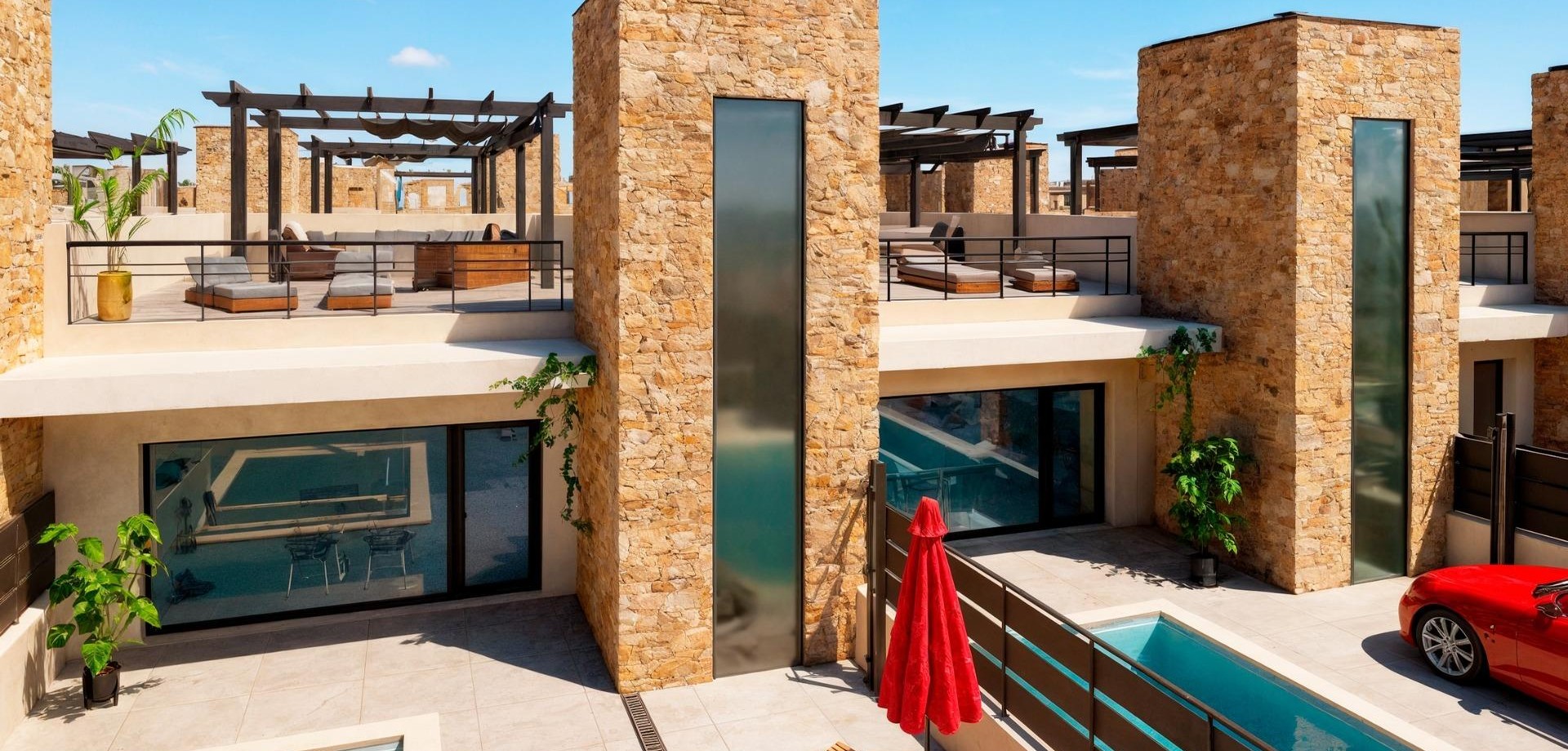 Neubauwohnanlage mit Villen und Reihenhäusern in Fuente Álamo, Murcia. Dieser Standort bietet eine außergewöhnliche natürliche Umgebung, fernab vom Trubel der Großstädte und dem touristischen Druck der Küste. Darüber hinaus verpflichten wir uns zu einer nachhaltigen Entwicklung, minimieren unsere Umweltbelastung und maximieren die Integration in die lokale Gemeinschaft. Hier werden Ihre Träume von einem ruhigen und nachhaltigen Lebensstil wahr. Stellen Sie sich vor, Sie wachen jeden Morgen in einer atemberaubenden Naturlandschaft auf, umgeben von ruhigen Landschaften und der einzigartigen Schönheit der murcianischen Landschaft. Bei diesem Projekt stehen Energieeffizienz, die Verwendung umweltfreundlicher Materialien und die harmonische Integration in die ländliche Umgebung im Vordergrund. Vom Entwurf der Immobilie bis zur Planung der Entwicklung, um unseren CO2-Fußabdruck zu reduzieren und verantwortungsbewusste Praktiken in allen Bereichen zu fördern. Video-Gegensprechanlage. Farblich lackierte Sicherheitstür mit Schloss und vandalismussicheren Beschlägen. Schränke mit Stauraum, innen verkleidet, weiß lackiert. Küchenmöbel mit Elektrogeräten Warmwasser durch Aerothermie. Elektrische Rollläden. Pergolen auf Sonnenterrassen. Privater Pool 2,5 x 4,5 m mit Unterwasserbeleuchtung und Salzwasser-Chlorungssystem. Vorinstallation für Außenküche/Whirlpool auf der Sonnenterrasse Fuente Álamo de Murcia ist eine Ortschaft und Gemeinde in der Region Murcia im Süden Spaniens. Sie liegt 22 km nordwestlich von Cartagena und 35 km südwestlich von Murcia. Die Stadt liegt im Becken des Mar Menor, umgeben von den Gebirgszügen Algarrobo, Los Gómez, Los Victorias und Carrascoy. Das Wasser dieser Berge fließt hinunter in die Rambla de Fuente Álamo und dann in das Mar Menor. Fuente Álamo liegt 30 Minuten vom Flughafen Murcia - Corvera entfernt. Die nächsten Geschäfte sind 6 km entfernt.