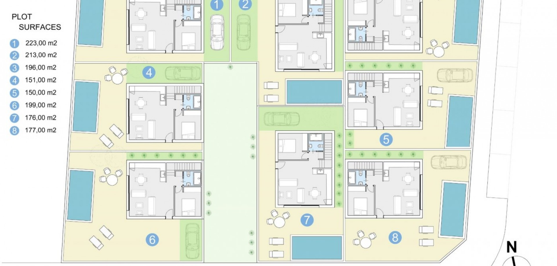 Schöne Villen mit 3 Schlafzimmern und 2 Bädern, Wohnzimmer, Küche, Galerie und Terrasse auf den Grundstücken von 150m2 bis zu 223m2, hat Garten mit privatem Pool und parkinf Platz.