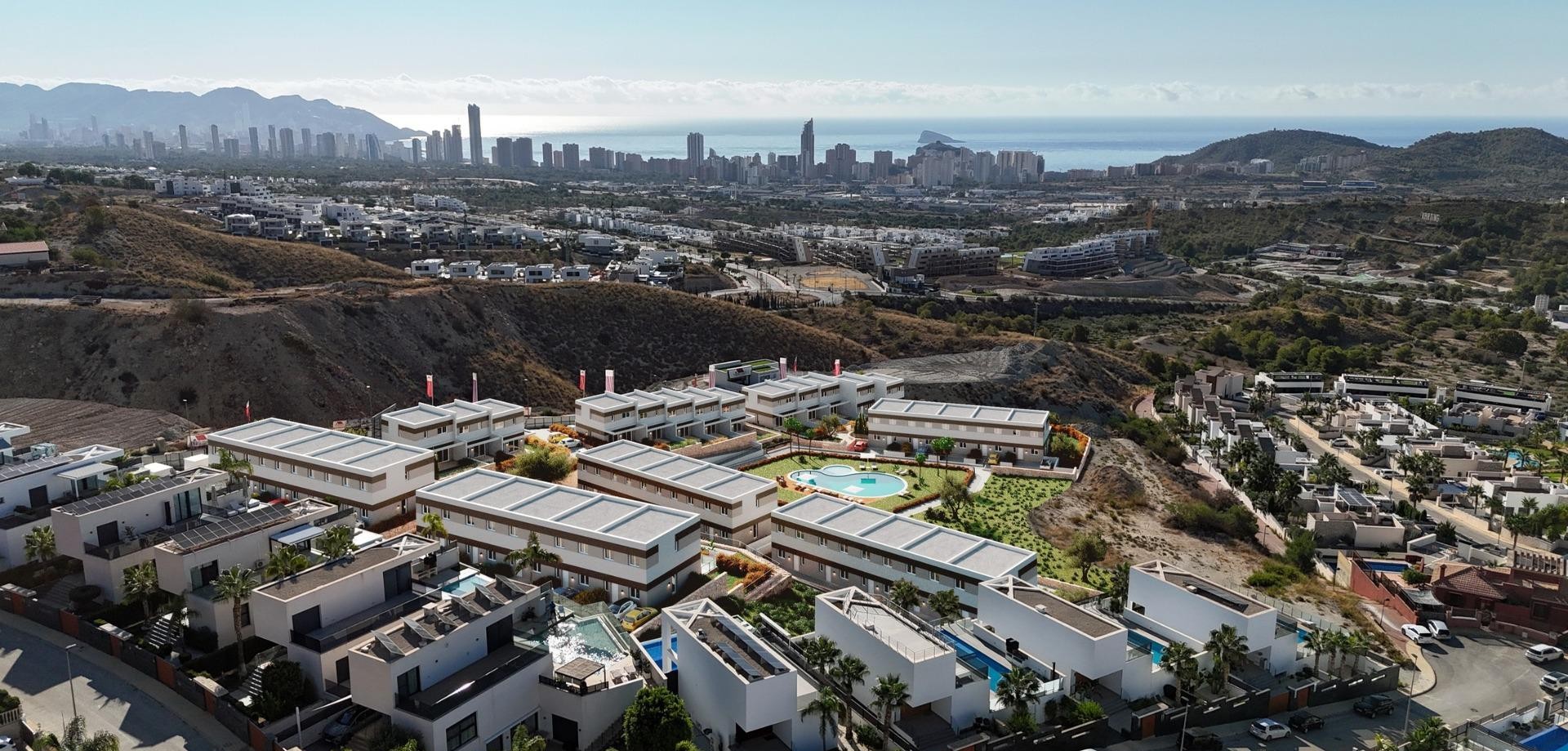 Moderne Reihenhäuser mit 3 Schlafzimmern zum Verkauf in Balcon de Finestrat an der Costa Blanca Moderne Häuser in erstklassiger Lage am Mittelmeer Diese neue Wohnanlage mit Reihenhäusern mit 3 Schlafzimmern, 2 Badezimmern und 1 Gästetoilette befindet sich in Balcon de Finestrat, einer ruhigen und gepflegten Gegend an der Costa Blanca. Nur wenige Minuten von Benidorm entfernt und neben dem Golfplatz Puig Campana gelegen, bietet dieser Standort eine ideale Balance zwischen Natur, Meer und wichtigen Dienstleistungen. Die Gegend ist bekannt für ihre wunderschöne Berglandschaft, den einfachen Zugang zu Freizeitgebieten und ein angenehmes Klima das ganze Jahr über. Modernes Design mit hellen und funktionalen Innenräumen Die Reihenhäuser verfügen über einen modernen offenen Grundriss. Im Erdgeschoss befinden sich eine geräumige Küche, ein Ess- und Wohnbereich mit viel Tageslicht sowie eine Gästetoilette. Im Obergeschoss bieten die Doppelzimmer und voll ausgestatteten Badezimmer Komfort und Privatsphäre für die ganze Familie. Einige Einheiten verfügen über einen 50 m² großen Keller mit Vorinstallation für ein zusätzliches Badezimmer und einen offenen Raum, den die Eigentümer individuell gestalten können und der direkten Zugang zum Garten bietet. Außenbereiche für mediterranes Wohnen Jede Immobilie verfügt über großzügige Terrassen, die ideal sind, um die Aussicht auf die natürliche Umgebung und das sonnige Wetter der Costa Blanca zu genießen. Die Wohnanlage verfügt über einen Swimmingpool, Landschaftsgärten und Entspannungsbereiche im Freien, die eine ruhige Umgebung für die Bewohner schaffen. Hochwertige Ausstattung und Energieeffizienz Die Wohnungen verfügen über komplett ausgestattete Badezimmer mit Möbeln, Spiegeln und Duschwänden, eine komplette Klimaanlageninstallation, Sonnenkollektoren zur Stromversorgung, eine gepanzerte Eingangstür und ein Energiezertifikat der Klasse A. Die Keller sind für die Installation von Split-Klimaanlagen vorgerüstet. Hervorragende Anbindung und Dienstleistungen in der Nähe Die Sandstrände von Benidorm und Villajoyosa sind nur 4 km entfernt, und das Einkaufszentrum La Marina mit Restaurants, Geschäften und Unterhaltungsangeboten ist nur eine kurze Autofahrt entfernt. In der Nähe finden Sie internationale Schulen, Supermärkte und alle Annehmlichkeiten des täglichen Lebens. Entfernungen von Interesse: Flughafen Alicante 40 km, Golfplatz Puig Campana 1 km, Strände von Benidorm 4 km, Hafen von Villajoyosa 9 km. Ein Lebensstil voller Komfort und Bequemlichkeit Jede Immobilie verfügt über einen oder zwei private Außenparkplätze, die das ganze Jahr über für Praktikabilität und Komfort sorgen. Kontaktieren Sie uns noch heute, um einen Besichtigungstermin zu vereinbaren und sich Ihr neues Zuhause in Balcon de Finestrat zu sichern.