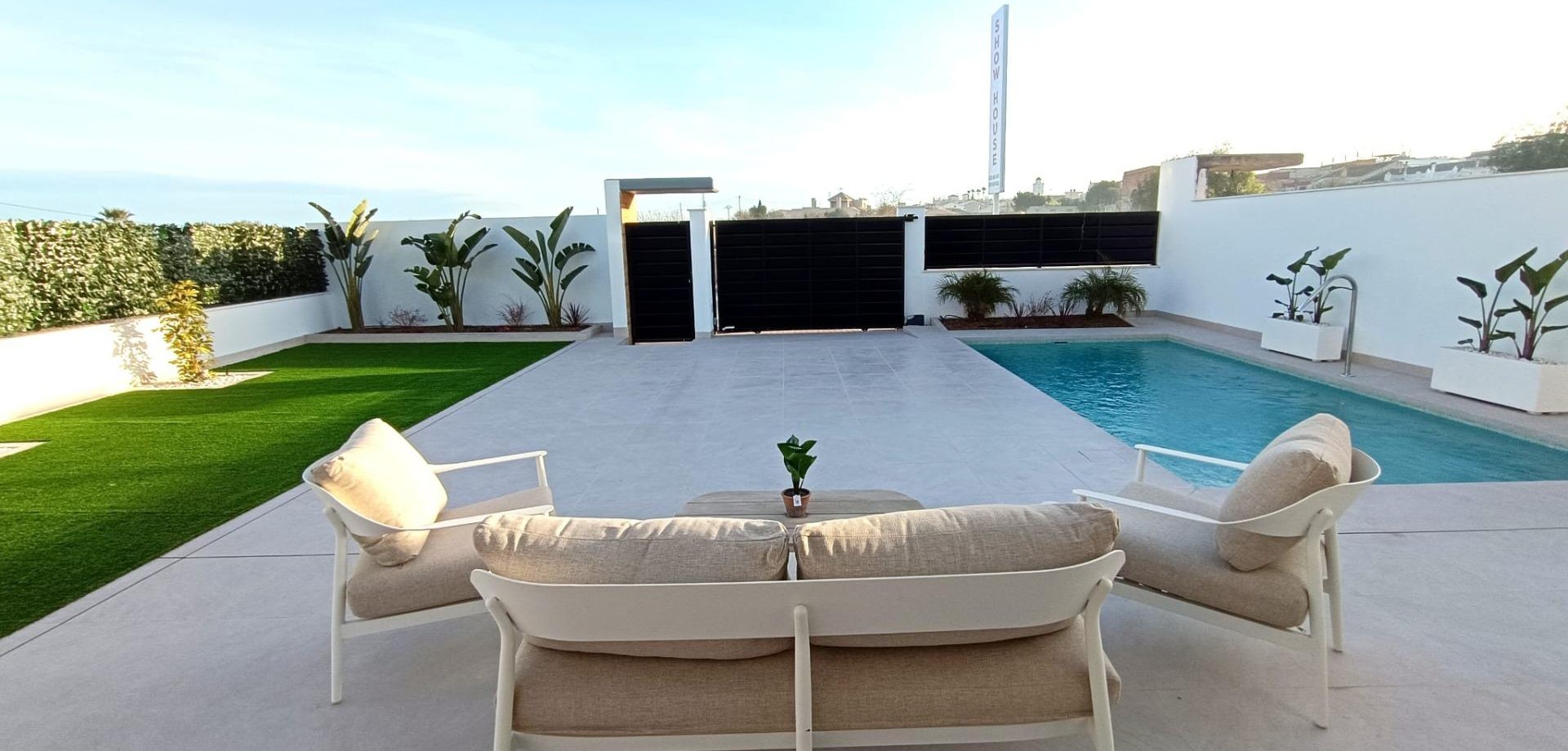 Luxuriöse Neubau-Doppelhaushälften in Benijófar, Costa Blanca Erstklassige Lage in Benijófar mit bequemem Zugang zu Annehmlichkeiten Erleben Sie ein neues Niveau des Luxuswohnens in der charmanten Stadt Benijófar, einer begehrten Gegend an der Costa Blanca in Spanien. Diese neu erbauten Doppelhaushälften befinden sich in einem lebendigen Viertel mit einer perfekten Mischung aus Moderne und lokalem Charme und bieten leichten Zugang zu allen wichtigen Dienstleistungen und Attraktionen. Nur 10 km von den goldenen Stränden von Guardamar del Segura und 30 km vom Flughafen Alicante entfernt, sind die Villen strategisch günstig für Komfort und Lifestyle positioniert. Geräumiges und modernes Design mit hochwertigen Oberflächen Jede Villa ist mit einer modernen Ästhetik gestaltet und zeichnet sich durch klare Linien und hochwertige Oberflächen aus. Der Grundriss umfasst drei geräumige Schlafzimmer und drei Badezimmer und bietet viel Platz für Familien oder Gäste. Der offene Wohn- und Essbereich verbindet sich nahtlos mit einer voll ausgestatteten Küche und bietet den idealen Raum für Unterhaltung und Familienfeiern. Große Fenster lassen viel Tageslicht herein und schaffen eine helle und einladende Atmosphäre im gesamten Haus. Private Außenbereiche mit Pool und Solarium Diese Villen verfügen über private Außenbereiche, die für Entspannung und Genuss des mediterranen Klimas ausgelegt sind. Der geflieste Garten umfasst einen 2,5 x 5 m großen Pool, ideal für eine Abkühlung an warmen Tagen, sowie ausreichend Parkmöglichkeiten. Die Immobilien bieten zudem ein Solarium auf dem Dach, von dem aus Sie die Umgebung genießen können. Das Solarium ist für eine mögliche Installation eines Whirlpools vorbereitet und bietet somit den perfekten Ort, um sich zu entspannen und den Sonnenuntergang zu genießen. Hochwertige Ausstattung für maximalen Komfort Jede Villa ist voll ausgestattet mit erstklassigen Geräten, darunter ein integrierter Kühl-Gefrierschrank, Induktionskochfeld, integrierter Geschirrspüler, eingebaute Mikrowelle und Backofen. Weitere Merkmale umfassen Klimaanlagen für die Temperaturregelung, Fußbodenheizung in den Badezimmern und elektrische Rollläden für Privatsphäre. Spotlights und Außenbeleuchtung verstärken die Atmosphäre und machen jede Villa sowohl funktional als auch luxuriös. Benijófar: Eine Mischung aus Tradition und modernem Leben Benijófar ist ein charmantes Dorf mit einer einladenden Atmosphäre, bekannt für seine schöne Kirche, lokale Geschäfte, Supermärkte, Apotheken, Banken und köstliche Restaurants. Naturliebhaber werden den nahegelegenen Naturpark zu schätzen wissen, der sich ideal zum Spazieren und Erkunden eignet. Golfliebhaber finden mehrere Golfplätze in kurzer Entfernung, und Familien können nahegelegene Wasserparks in Rojales (4 km) und Torrevieja (12 km) genießen. Die Villen sind außerdem gut angebunden, mit den Autobahnen N-332 und AP-7, die einen einfachen Zugang zu umliegenden Städten bieten. Bereit, Benijófar zu Ihrem neuen Zuhause zu machen? Erleben Sie den Luxus und Komfort dieser modernen Villen in Benijófar. Verpassen Sie nicht diese Gelegenheit, das Leben an der Costa Blanca zu genießen. Kontaktieren Sie uns noch heute, um eine Besichtigung zu vereinbaren und den ersten Schritt zu Ihrem Traumhaus zu machen.