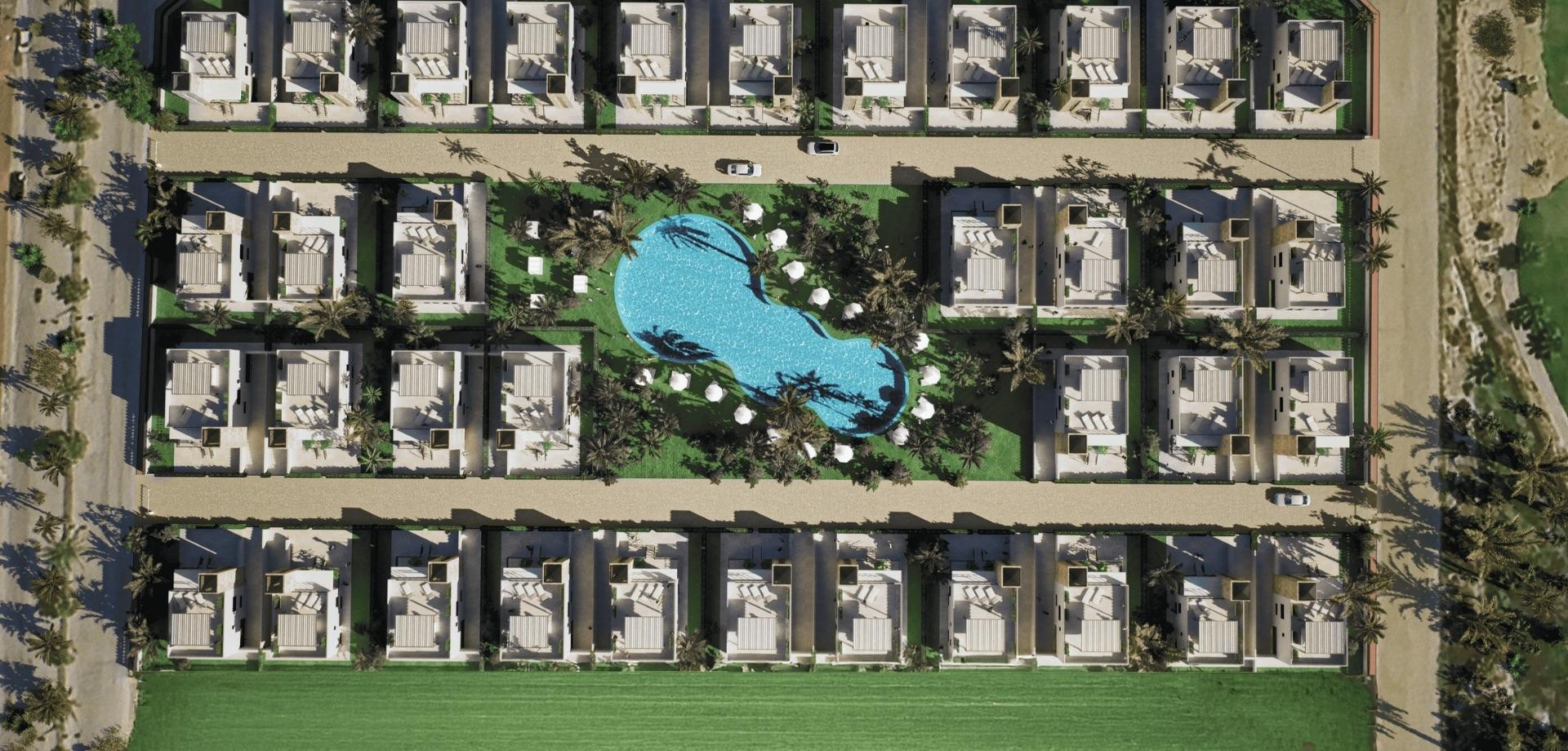 Entdecken Sie diese private Wohnanlage mit 69 freistehenden Villen, die sich auf einem Grundstück direkt am Camposol Golf in Mazarrón, Murcia, befindet. Die Anlage ist um eine große zentrale grüne Oase mit Gemeinschaftspool und gepflegten Gärten herum angelegt und bietet eine ruhige und sichere Umgebung, ideal, um den mediterranen Lebensstil zu genießen.