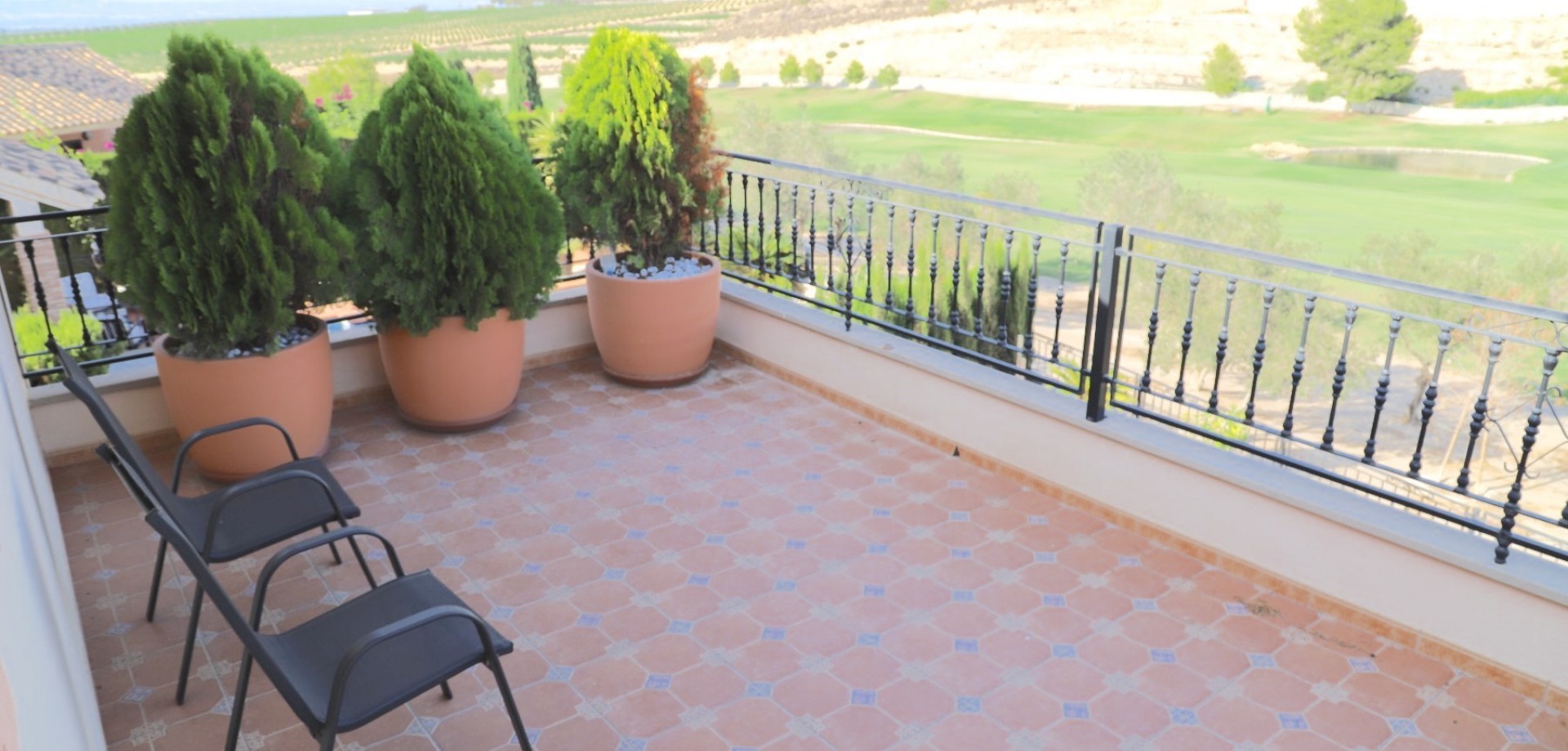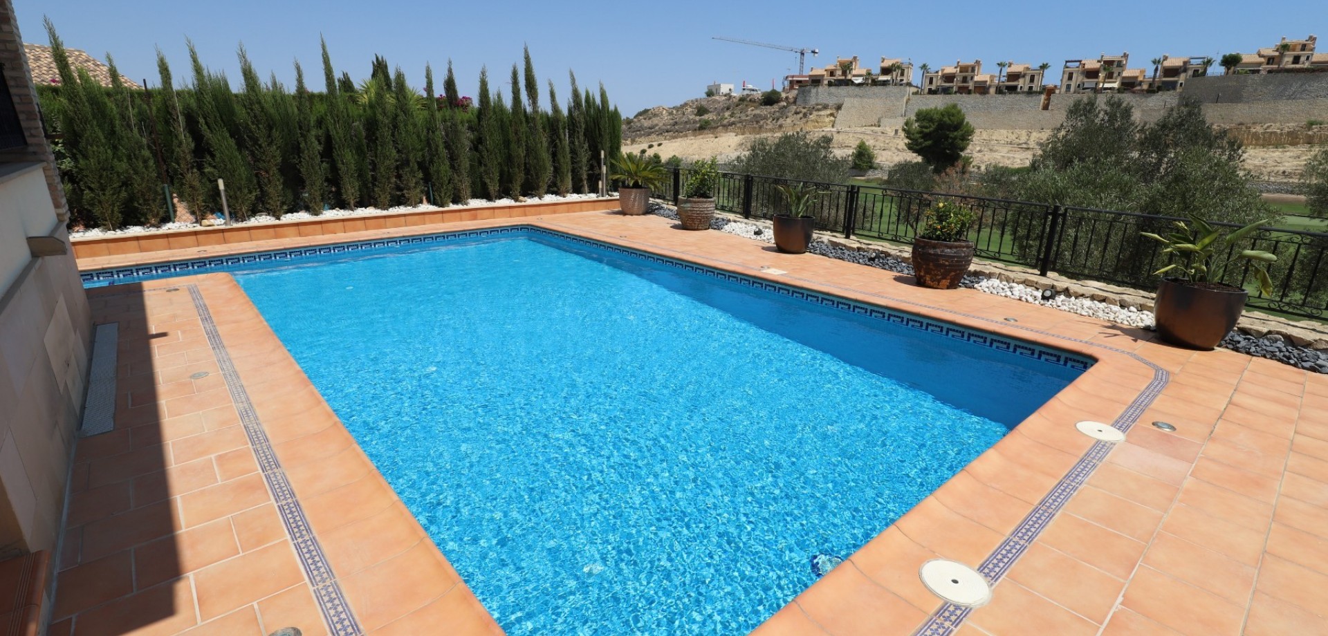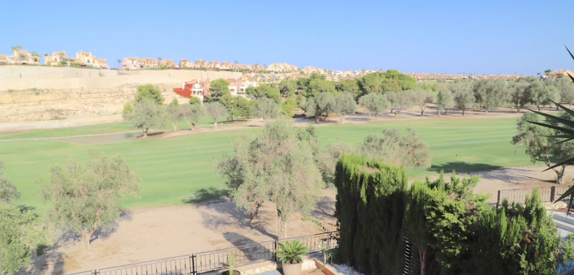 Al entrar en la villa, accederá a un salón/comedor de planta abierta con un llamativo techo abovedado y una chimenea funcional. Unas grandes puertas correderas de cristal conducen a la terraza inferior y a la zona de la piscina privada. La espaciosa cocina totalmente equipada se encuentra junto al salón. Dos amplios dormitorios dobles con armarios empotrados, un moderno cuarto de baño familiar y un práctico armario bajo la escalera. En la primera planta se encuentra el dormitorio principal, acristalado y de estilo francés, con armarios empotrados y un moderno cuarto de baño en-suite. Desde el dormitorio se accede a una terraza privada con vistas panorámicas al campo de golf, a la piscina privada y a la zona de terrazas.