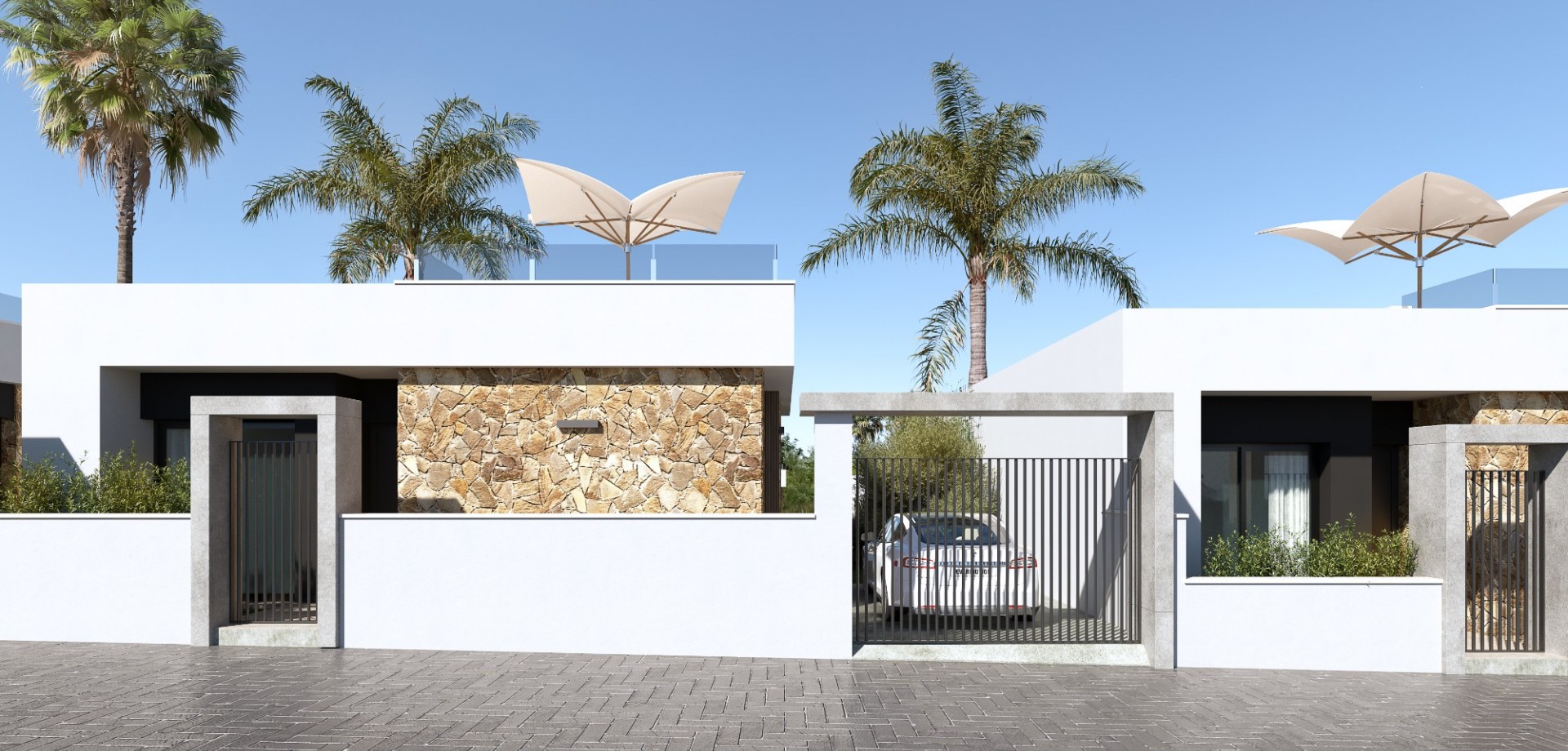 La urbanización cuenta con viviendas unifamiliares cuidadosamente diseñadas con tres dormitorios y 2-3 baños, disponibles en distribuciones de una o dos plantas, cada una de ellas complementada con un espacioso solárium.