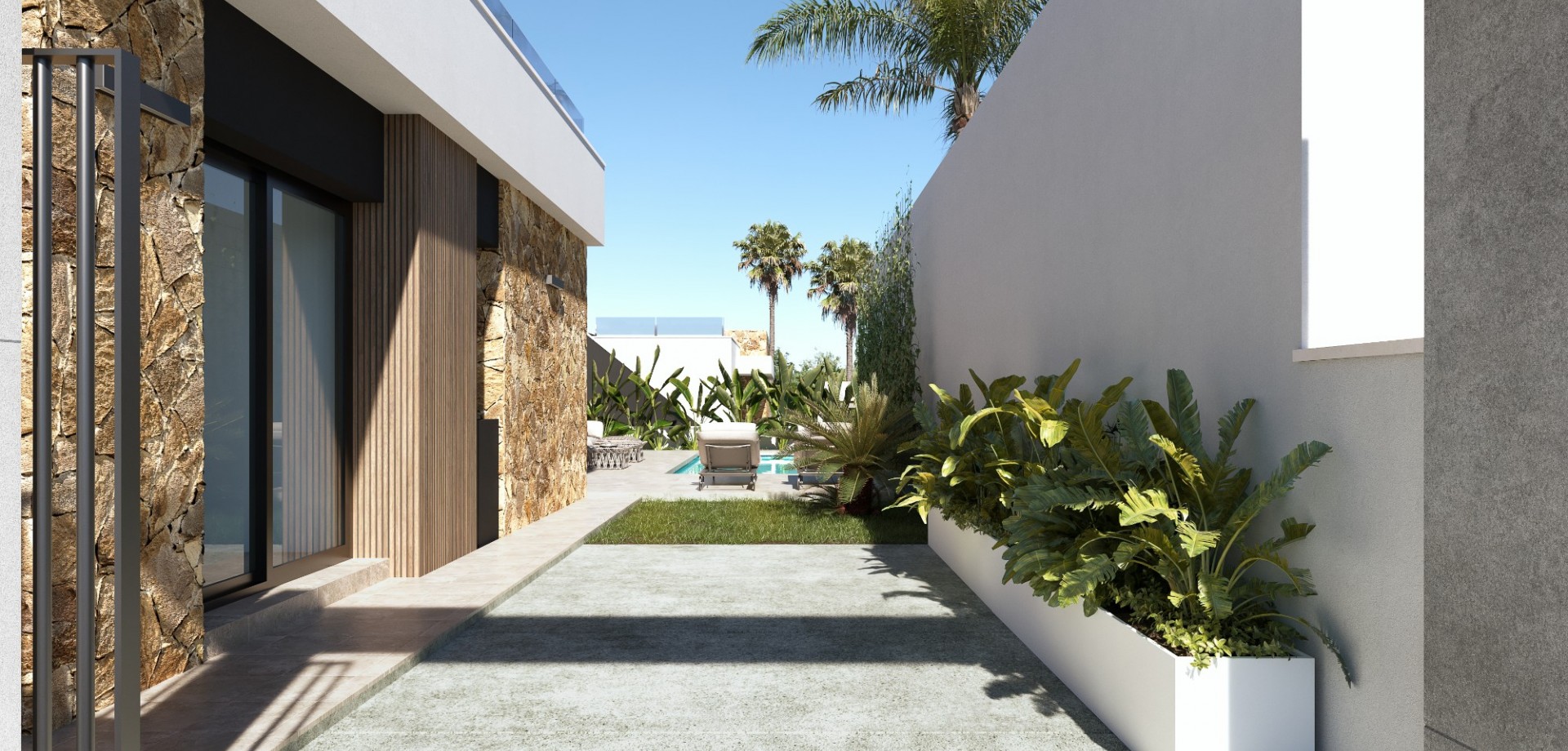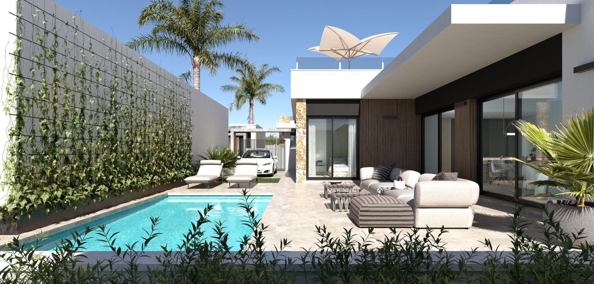Los espacios exteriores son igualmente impresionantes, con una piscina privada con ducha exterior, un jardín meticulosamente ajardinado adornado con césped artificial y un aparcamiento seguro en el lugar facilitado por una puerta corredera. Dependiendo de la fase de construcción, es posible añadir un sótano con un coste adicional.