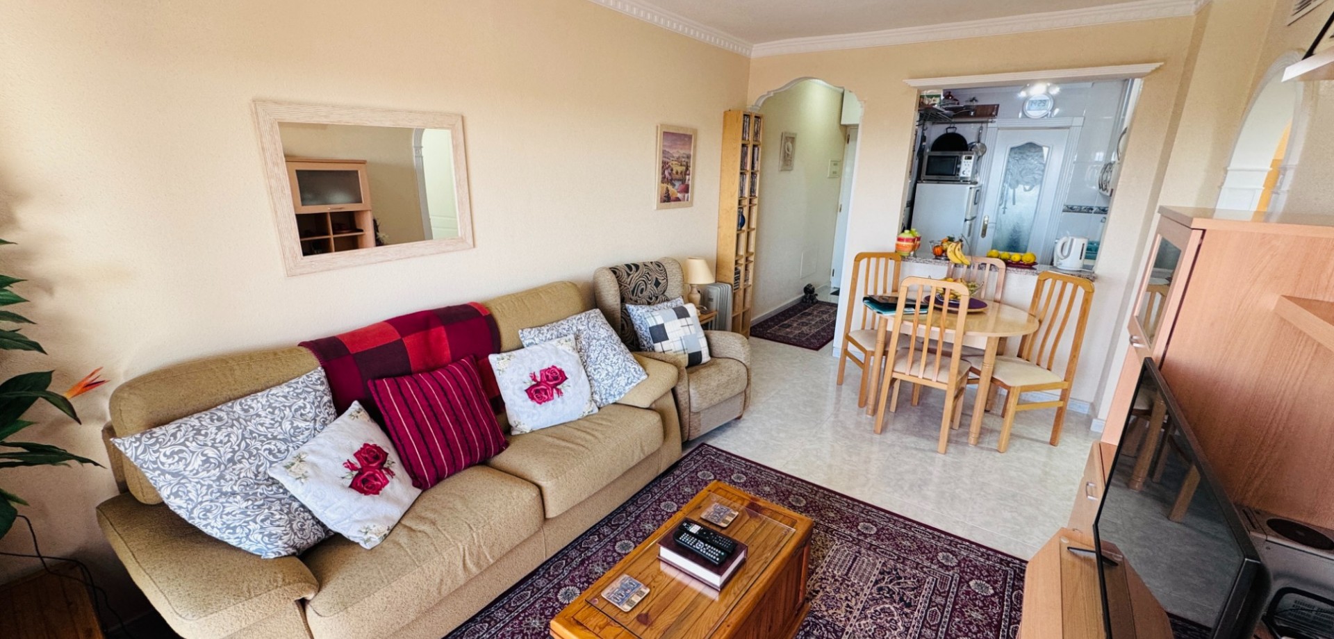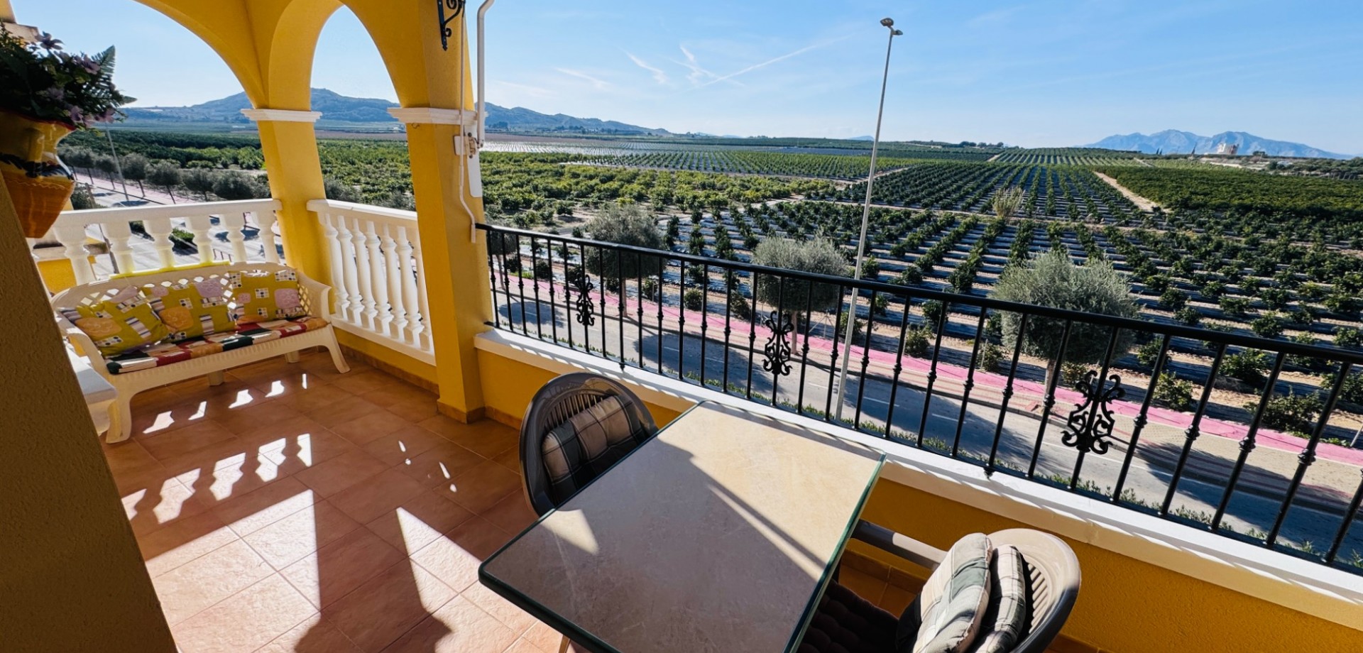 El salón-comedor de planta abierta es luminoso, con puertas correderas que dan a una amplia terraza. Aquí, podrá disfrutar de las fantásticas vistas de los naranjos y las montañas. ¡Siéntese y disfrute de las impresionantes puestas de sol por la noche!