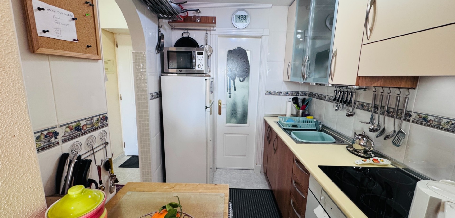Al subir las escaleras o el ascensor a la segunda planta, se accede al apartamento, a un trastero exterior y luego al pasillo principal. A la izquierda, hay una cocina americana. Esta incluye una variedad de muebles altos y bajos, un horno/vitrocerámica integrado y un frigorífico-congelador independiente. Una puerta da a un lavadero con lavadora y hervidor de agua.