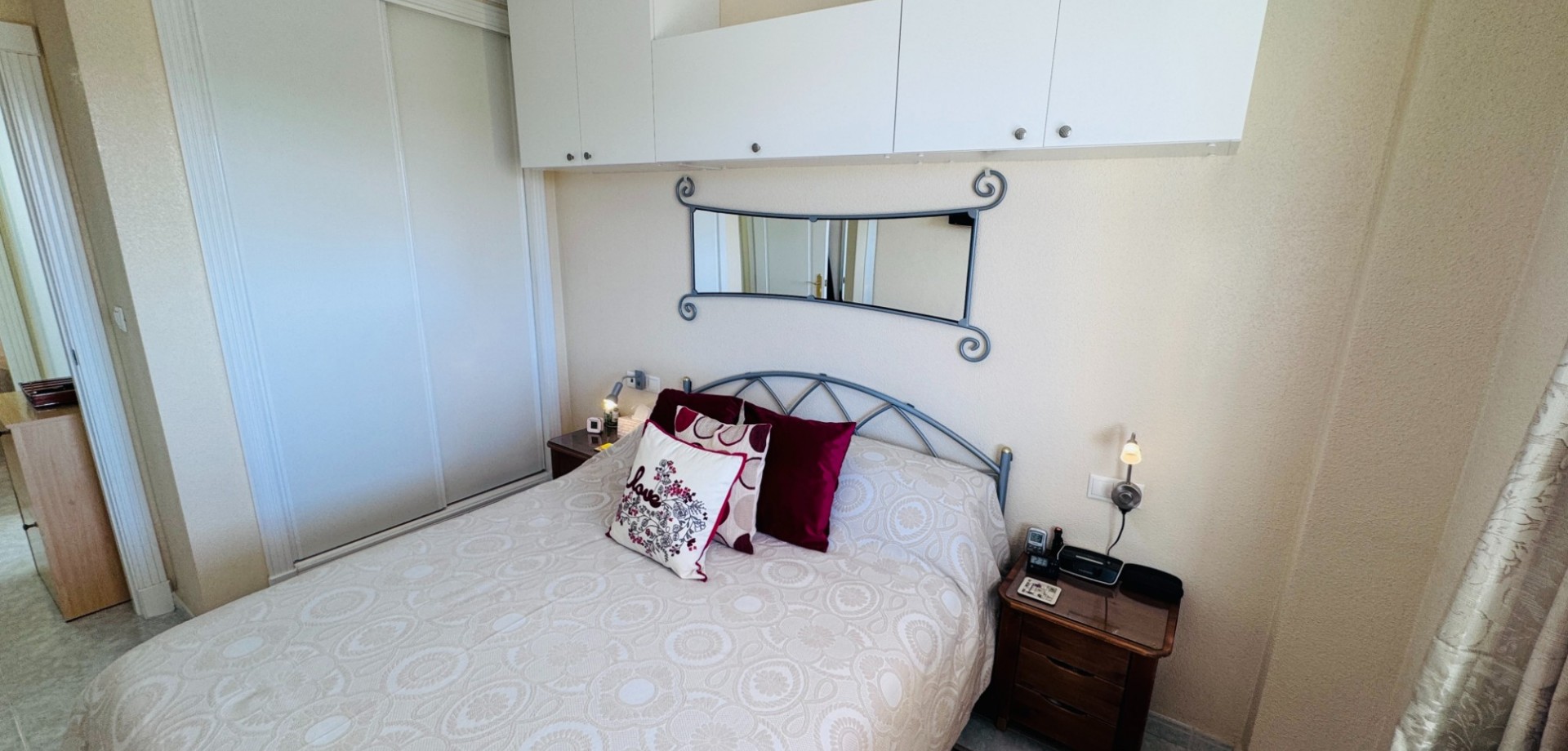 Un arco desde el salón conduce a dos dormitorios dobles, cada uno con armarios empotrados, y a un baño familiar.