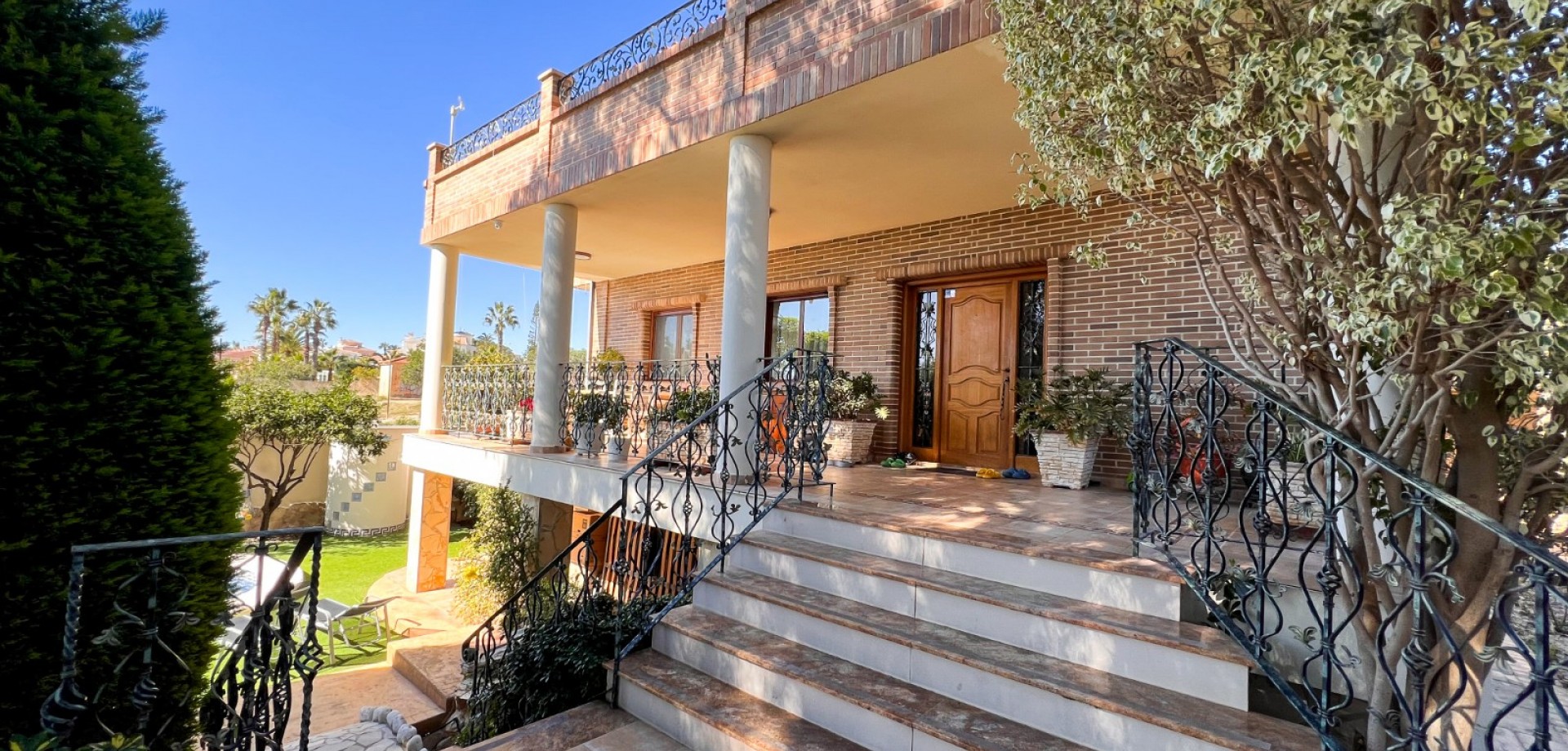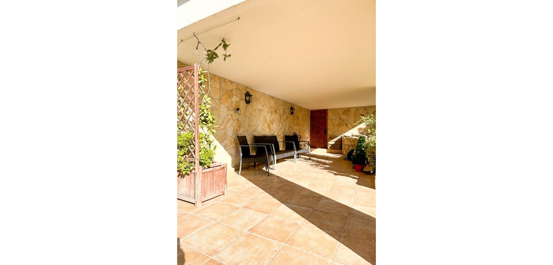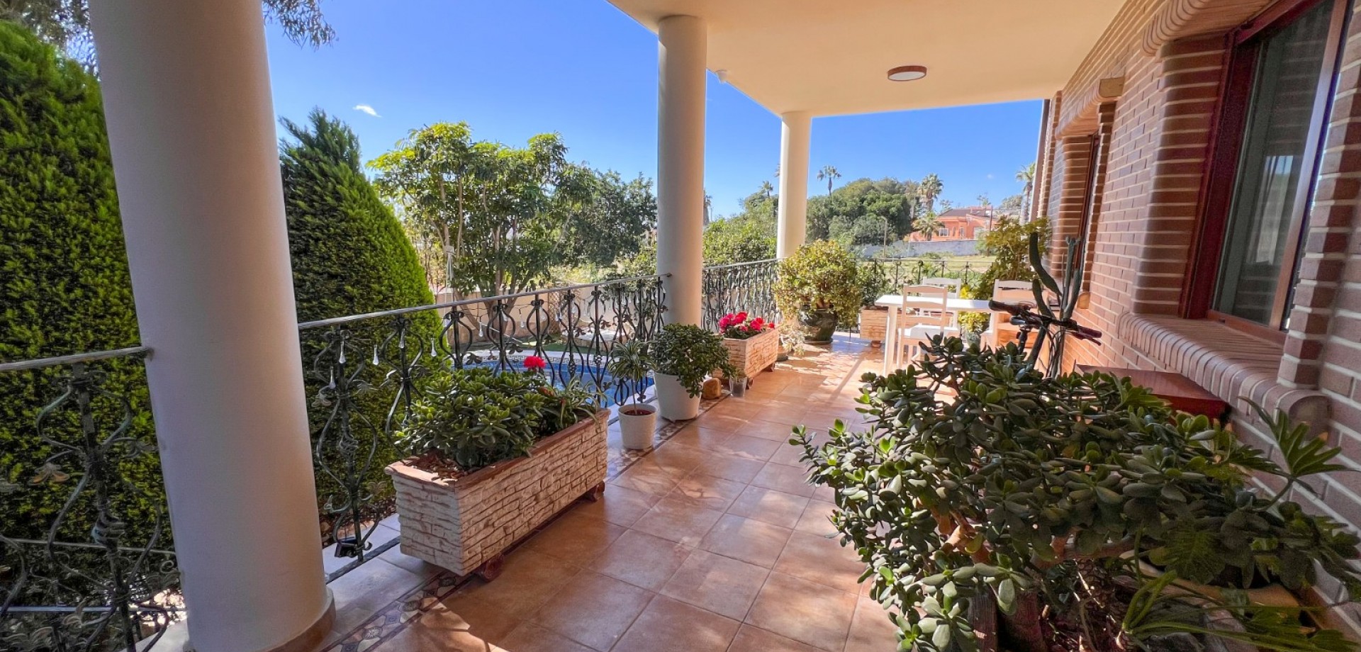 Porche de entrada con vistas al jardín y la piscina
