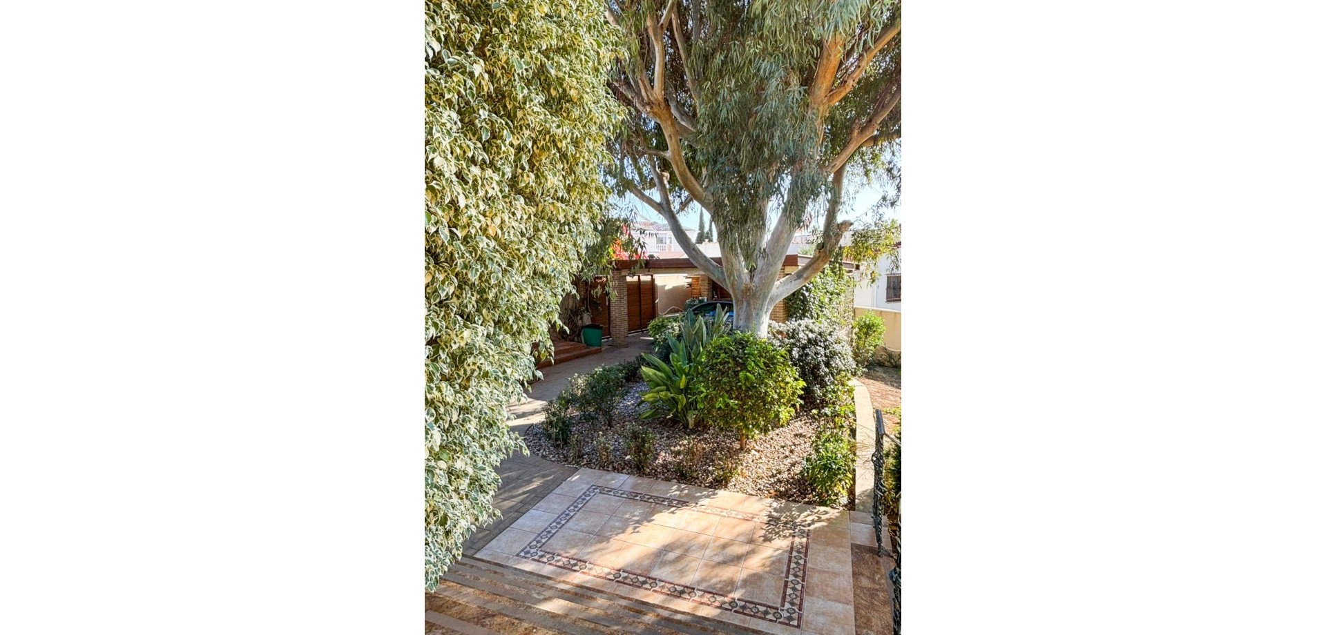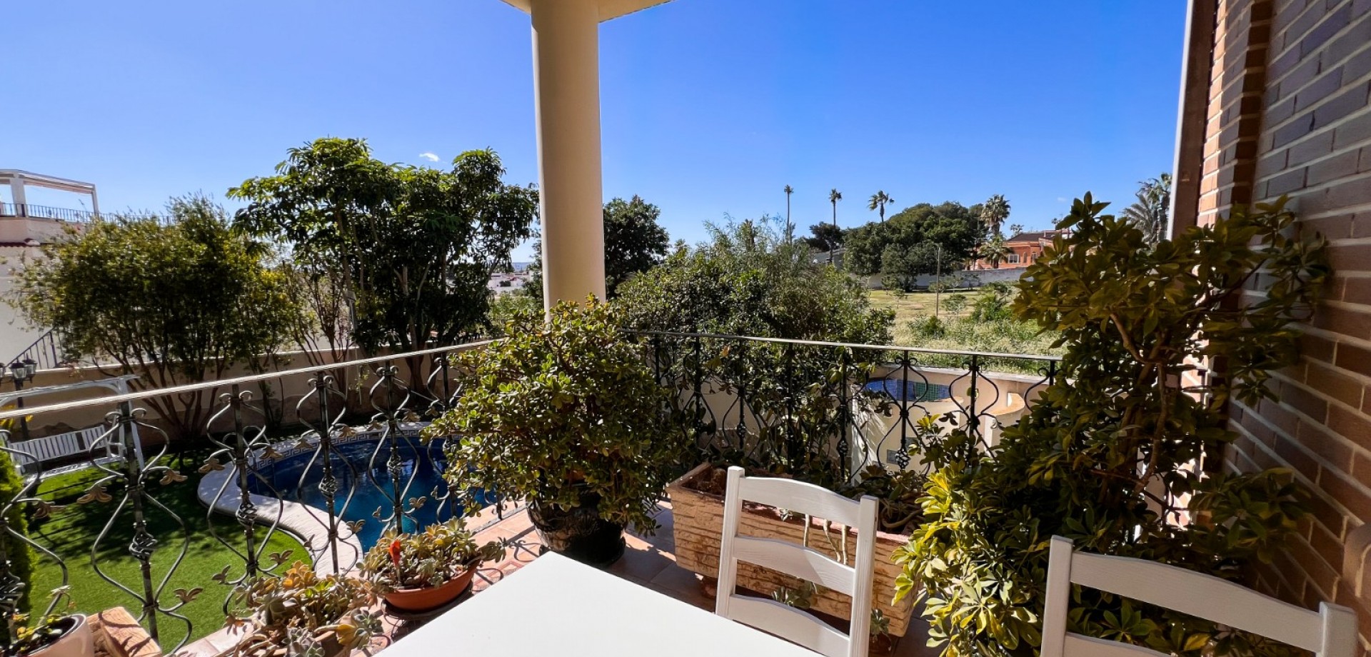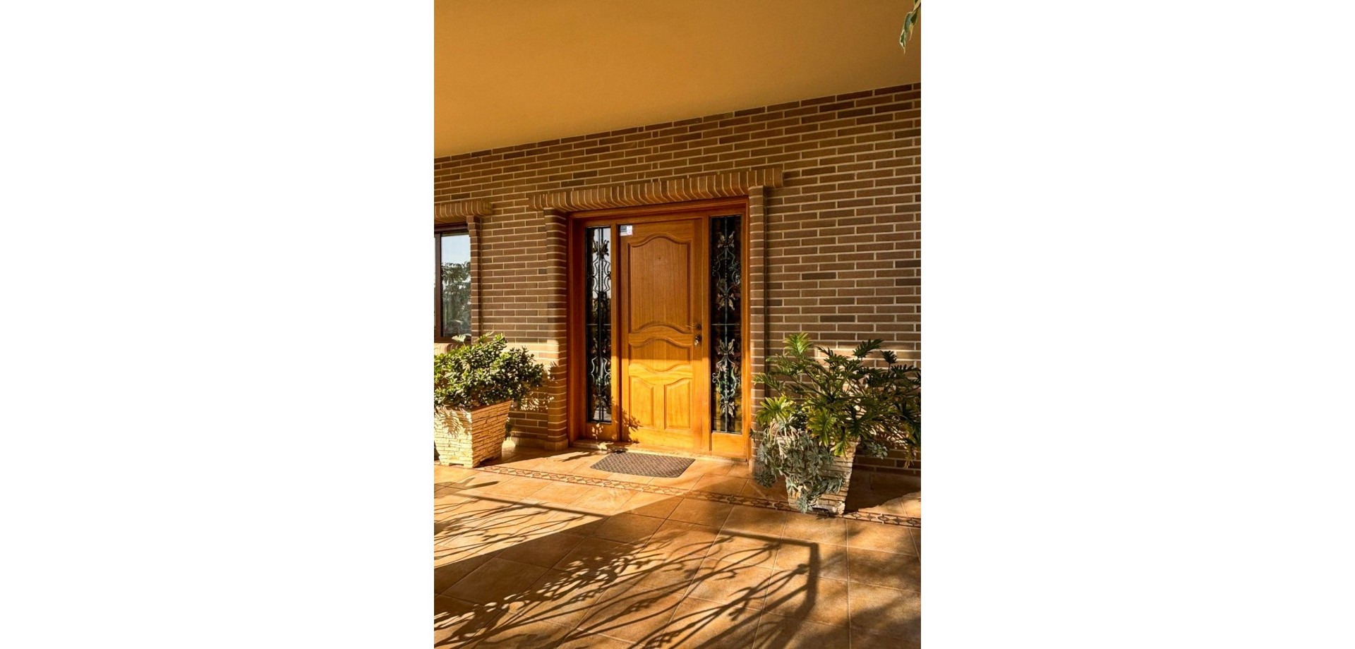 Porche de entrada con vistas al jardín y la piscina