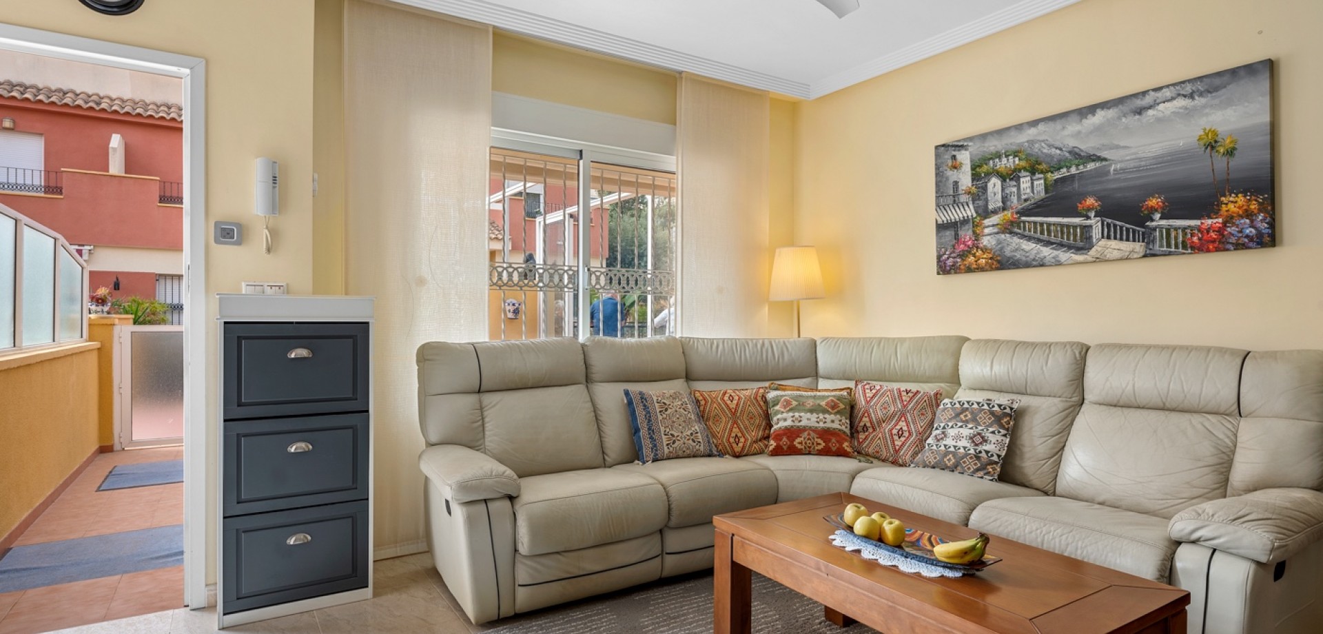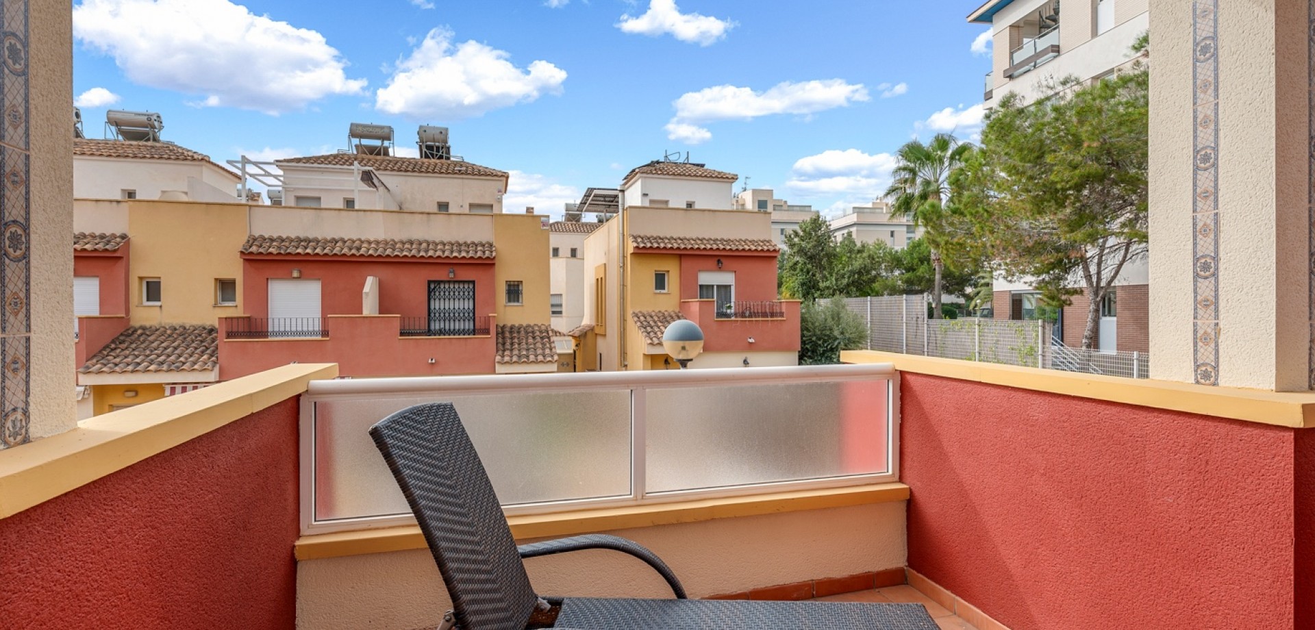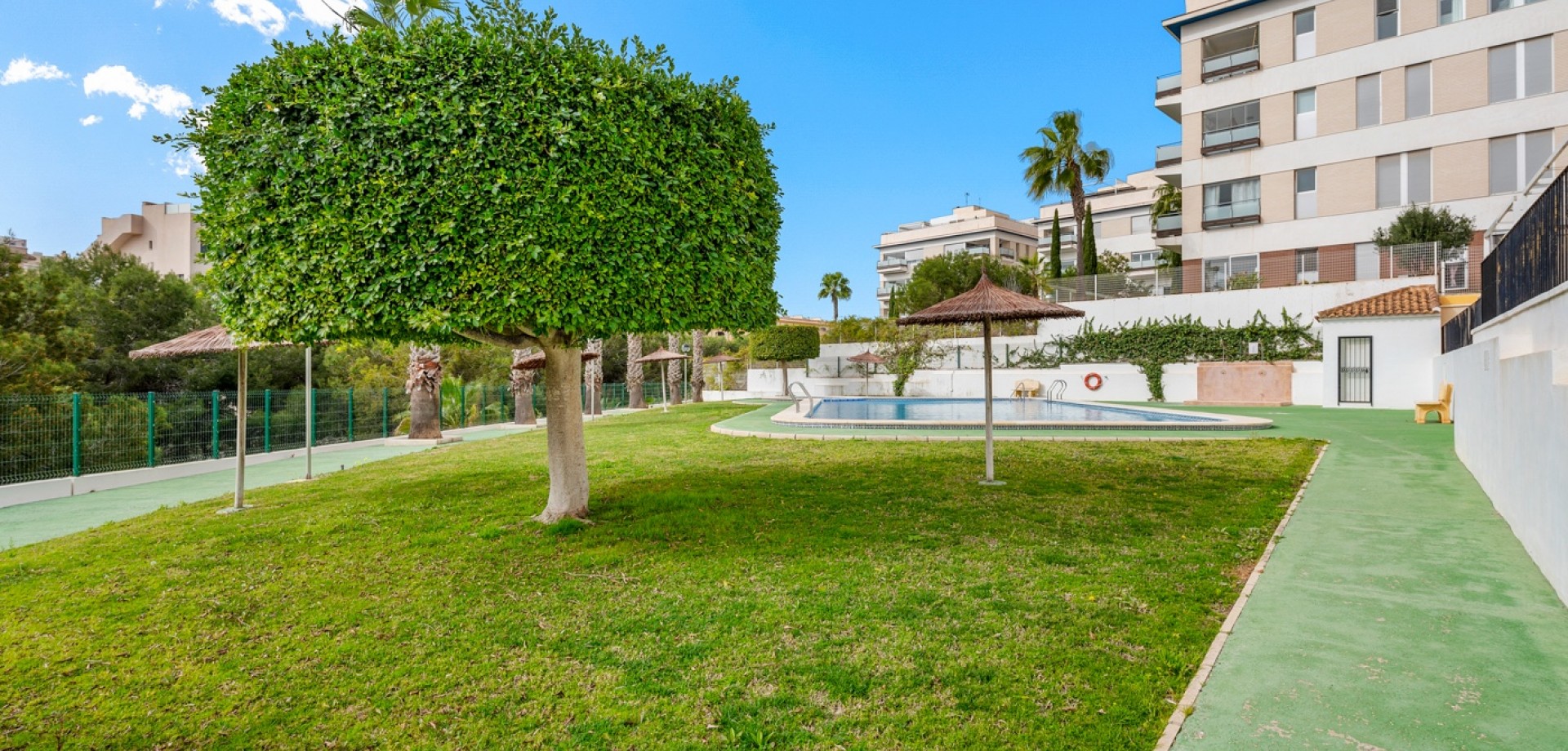 La propiedad forma parte de una urbanización cerrada con acceso a una hermosa piscina comunitaria, ideal para disfrutar del cálido clima mediterráneo.