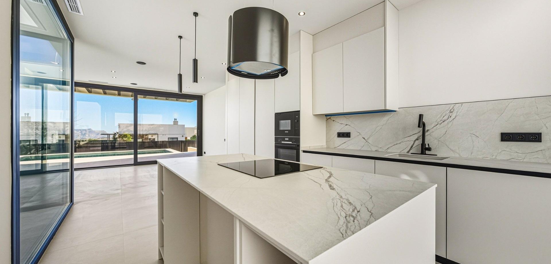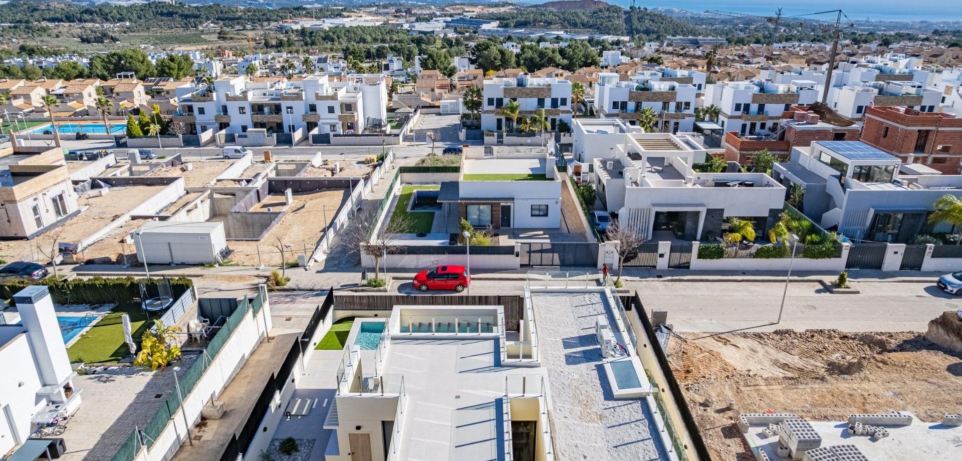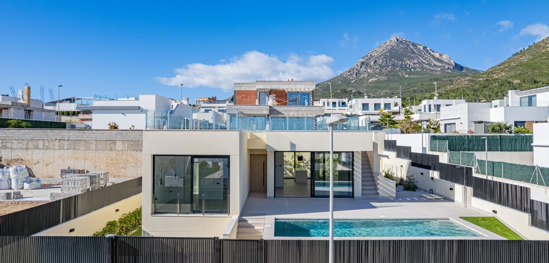 Villa nueva llave en mano con vistas al mar en La Alberca Polop Villa moderna de lujo en un entorno natural de montaña Esta villa contemporánea llave en mano se encuentra en La Alberca, una tranquila zona residencial de Polop, rodeada de bosques y montañas. Situada en un entorno elevado, la propiedad disfruta de vistas panorámicas al mar Mediterráneo, las montañas y el centro histórico de Polop. La villa ofrece privacidad, tranquilidad y excelentes conexiones con la costa y las localidades cercanas. Polop es un encantador pueblo de la comarca de la Marina Baixa, en la Costa Blanca, conocido por su carácter tradicional y su entorno natural. La propiedad está cerca de todos los servicios de La Nucía, incluyendo tiendas, restaurantes, centros deportivos y colegios, mientras que las playas y las animadas localidades costeras se encuentran a poca distancia en coche. Amplia distribución entre la planta principal, el sótano y el solárium La villa se distribuye en una planta principal, un sótano y un solárium en la azotea, lo que ofrece un amplio espacio habitable y flexibilidad. En la planta principal, un acogedor vestíbulo de entrada con armario empotrado conduce a dos dormitorios en suite, incluida una suite principal con puertas ventanas elevables que dan a un balcón Juliette y a una terraza. La sala de estar y el comedor de planta abierta conectan a la perfección con una terraza cubierta con pérgola y una piscina privada de agua salada. El sótano cuenta con dos dormitorios adicionales con baño, grandes ventanas, una sala de juegos o cine flexible con conexiones de agua y electricidad para una zona de bar, un lavadero totalmente equipado con electrodomésticos Haier y dos cuartos técnicos. El solárium de la azotea ofrece un amplio espacio al aire libre con vistas panorámicas al mar y está preparado para la futura instalación de paneles solares. Una cocina al aire libre, múltiples armarios y un jardín de estilo mediterráneo con riego automático completan el exterior. Características de alta gama y eficiencia energética Esta villa destaca por sus acabados de primera calidad y sus instalaciones avanzadas, entre las que se incluyen: Isla de cocina central con electrodomésticos BOSCH integrados Encimeras de piedra natural en interiores y exteriores Preinstalación de calefacción por suelo radiante Sistema de aire acondicionado aerotérmico Mitsubishi Clasificación de eficiencia energética Clase A Preinstalación para sistema domótico Piscina de agua salada con calefacción opcional Aparcamiento privado para dos vehículos Las grandes ventanas con cristales de protección solar maximizan la luz natural y garantizan el confort y la seguridad. Excelente ubicación y distancias Centro de Polop a 2 km La Nucia a 4 km Benidorm a 12 km Altea a 10 km Playas a 10 km Villaitana Golf a 14 km Aeropuerto de Alicante a 65 km Asegúrese la casa de sus sueños en Polop Esta excepcional villa llave en mano combina privacidad, diseño y vistas panorámicas en una de las zonas más atractivas del interior de la Costa Blanca. Póngase en contacto con nosotros hoy mismo para concertar una visita privada y hacer de esta lujosa villa en La Alberca Polop su nuevo hogar.