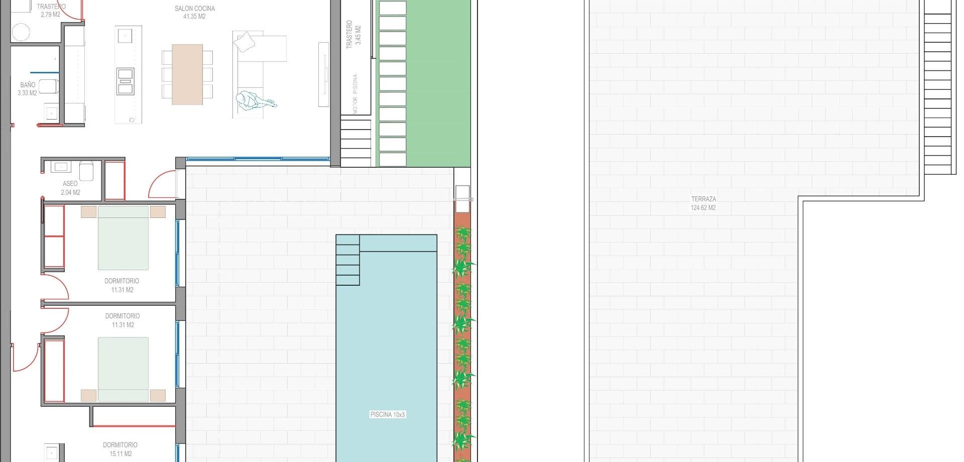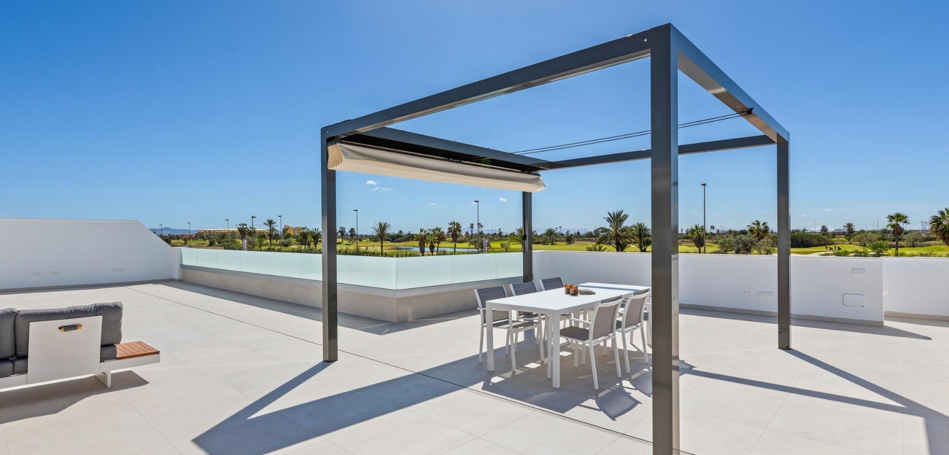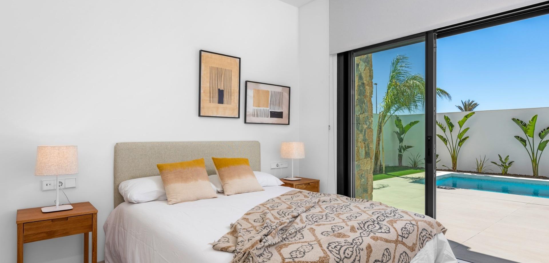 Villas de nueva construcción cerca de Serena Golf en Los Alcázares Villas modernas en una ubicación privilegiada junto a la costa y al campo de golf Este exclusivo proyecto residencial de nueva construcción ofrece villas modernas situadas en Los Alcázares, a poca distancia del prestigioso Serena Golf y a solo 1,2 km de las playas de arena del Mar Menor. Situadas en una de las zonas más atractivas de la Región de Murcia, estas viviendas combinan un diseño contemporáneo, comodidad y una excelente ubicación cerca del mar, del golf y de todos los servicios diarios. Los Alcázares es una localidad costera bien establecida, conocida por su estilo de vida relajado, su largo paseo marítimo, los deportes acuáticos y su clima templado durante todo el año. Diseño de una sola planta con espacios exteriores privados La promoción cuenta con elegantes villas de 3 dormitorios y 2 baños, disponibles en dos tamaños diferentes, de aproximadamente 106 m² y 130 m². El modelo más grande también incluye un aseo adicional para invitados. Todas las villas están diseñadas en una sola planta, lo que ofrece una vida práctica y cómoda. La cocina, el comedor y la sala de estar de planta abierta conectan directamente con una terraza y un jardín privado con piscina, creando un espacio ideal para la vida interior y exterior. Cada propiedad incluye también un solárium privado y una plaza de aparcamiento en la parcela. Acabados de alta calidad y equipamiento moderno Estas villas están construidas con materiales de alta calidad y equipadas con características modernas. Las cocinas, totalmente equipadas, están disponibles en acabado blanco brillante o madera e incluyen encimeras de cuarzo, fregadero de acero inoxidable, placa de inducción con extractor integrado, horno, microondas, lavadora, frigorífico integrado y lavavajillas. Los baños están equipados con muebles, espejos, iluminación y calentadores eléctricos de toallas. Otras características adicionales son las persianas eléctricas en los dormitorios, la iluminación LED en toda la propiedad y un completo sistema de aire acondicionado por conductos de Fujitsu. Piscina privada y confort energéticamente eficiente Cada villa incluye una piscina privada con acabado de azulejos cerámicos azules, escalones integrados e iluminación LED blanca. La piscina está preparada con preinstalación para una bomba de calor. La combinación de un control climático eficiente, una construcción moderna y un diseño bien pensado garantiza el confort durante todo el año. Excelente conectividad y distancias clave Las villas se encuentran a poca distancia a pie del centro de Los Alcázares y muy cerca de Serena Golf. La playa está a aproximadamente 1,2 km. La ciudad de Cartagena está a unos 20 km y ofrece una rica oferta cultural y gastronómica. El aeropuerto internacional de Murcia-Corvera está a unos 22 km y el de Alicante, a unos 90 km. También hay varios campos de golf y puertos deportivos en las cercanías, lo que hace que esta ubicación sea ideal tanto para vivir como para pasar las vacaciones. Su hogar ideal junto al mar y al golf Si busca una villa moderna de nueva construcción cerca de la playa y del golf en Los Alcázares, póngase en contacto con nosotros hoy mismo para obtener más información o concertar una visita privada.