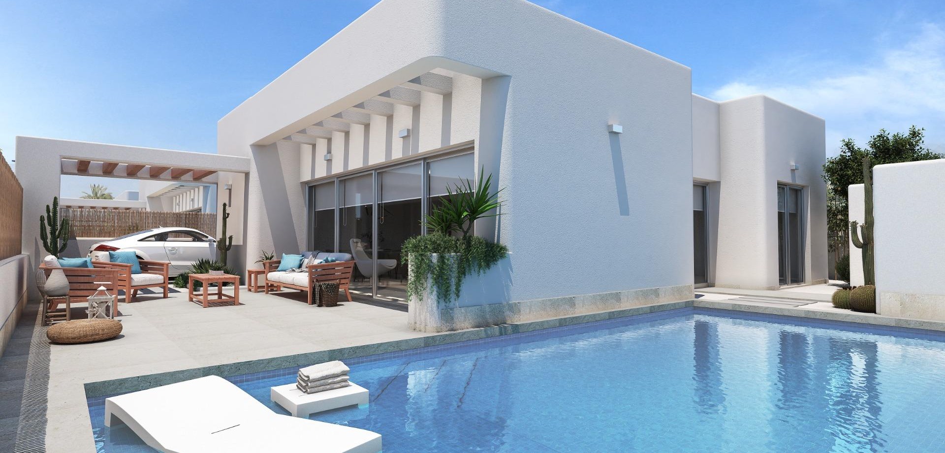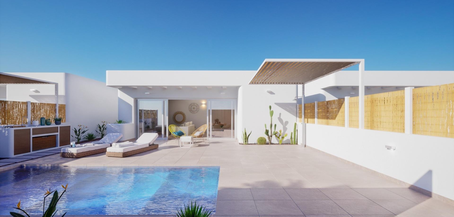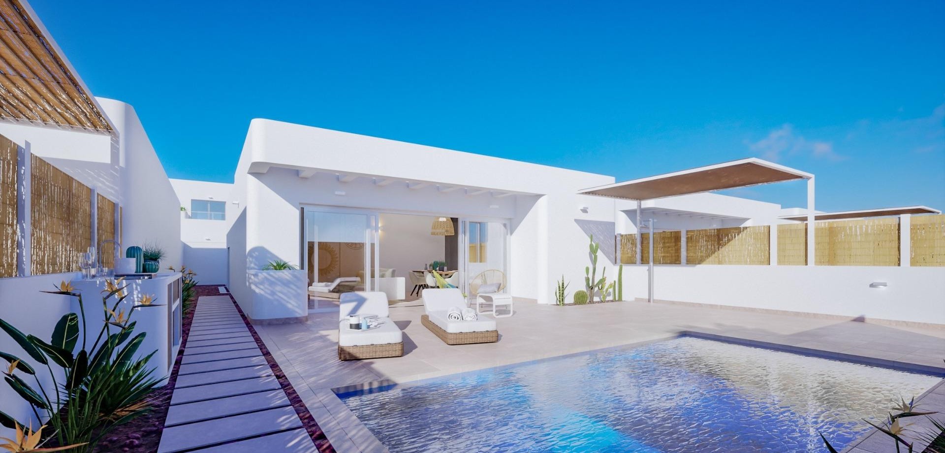 VILLAS DE OBRA NUEVA EN LOS ALCAZARES Villas de obra nueva en Los Alcazares . Villas de obra nueva estilo ibicenco en parcela independiente con terraza, zona de aparcamiento y piscina privada. La vivienda dispone de salón, cocina, 3 dormitorios, 2 baños, y tiene unas vistas privilegiadas. Posibilidad de solarium privado con coste adicional. Viviendas cuidadosamente diseñadas con materiales de alta calidad para satisfacer a los clientes más exigentes. Villas situadas a 1 km de la playa y del pueblo de Los Alcázares, donde se pueden practicar diversos deportes náuticos, rodeados de varios campos de golf. Ciudad de Cartagena a menos de 15 minutos en coche y a 30 minutos del aeropuerto de Murcia Corvera.