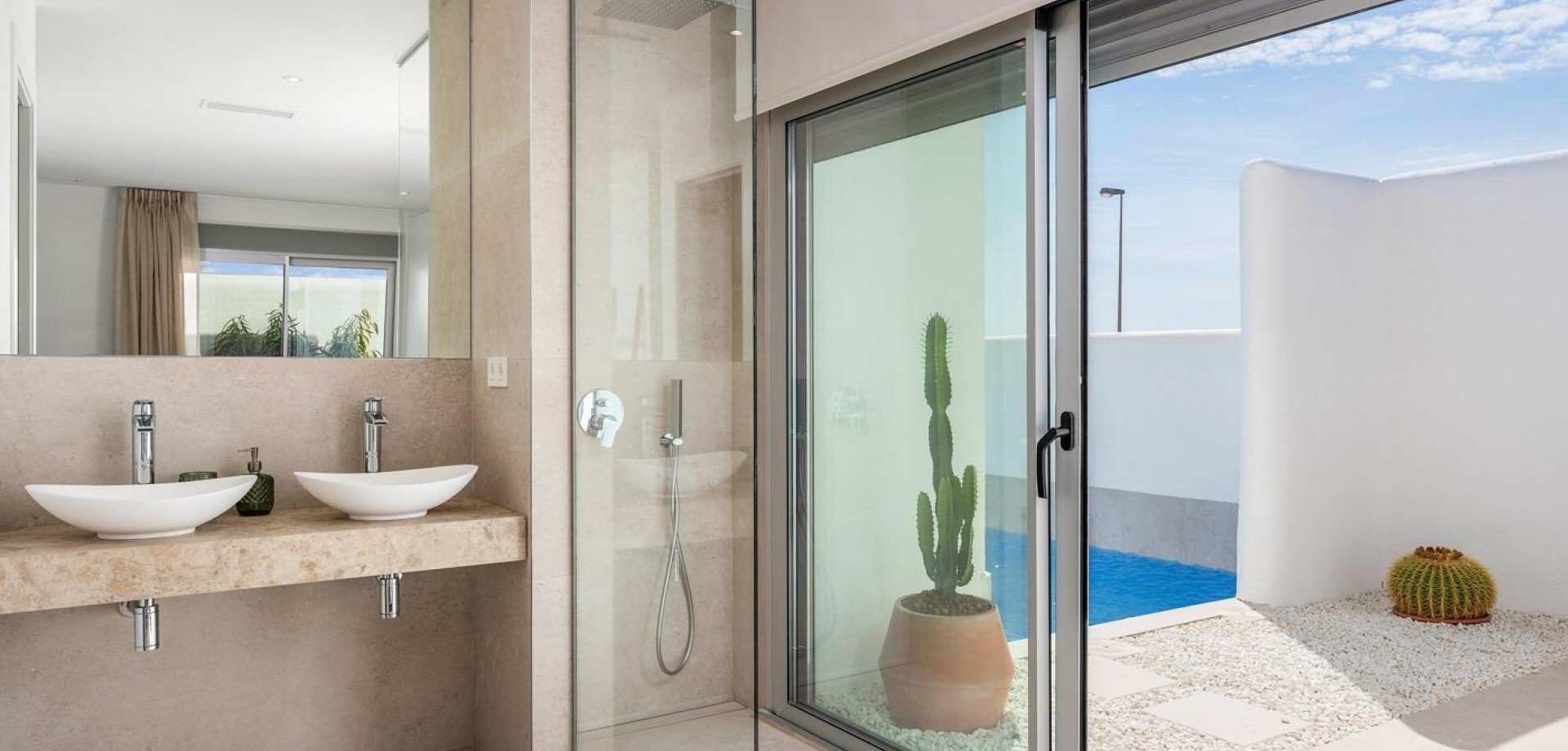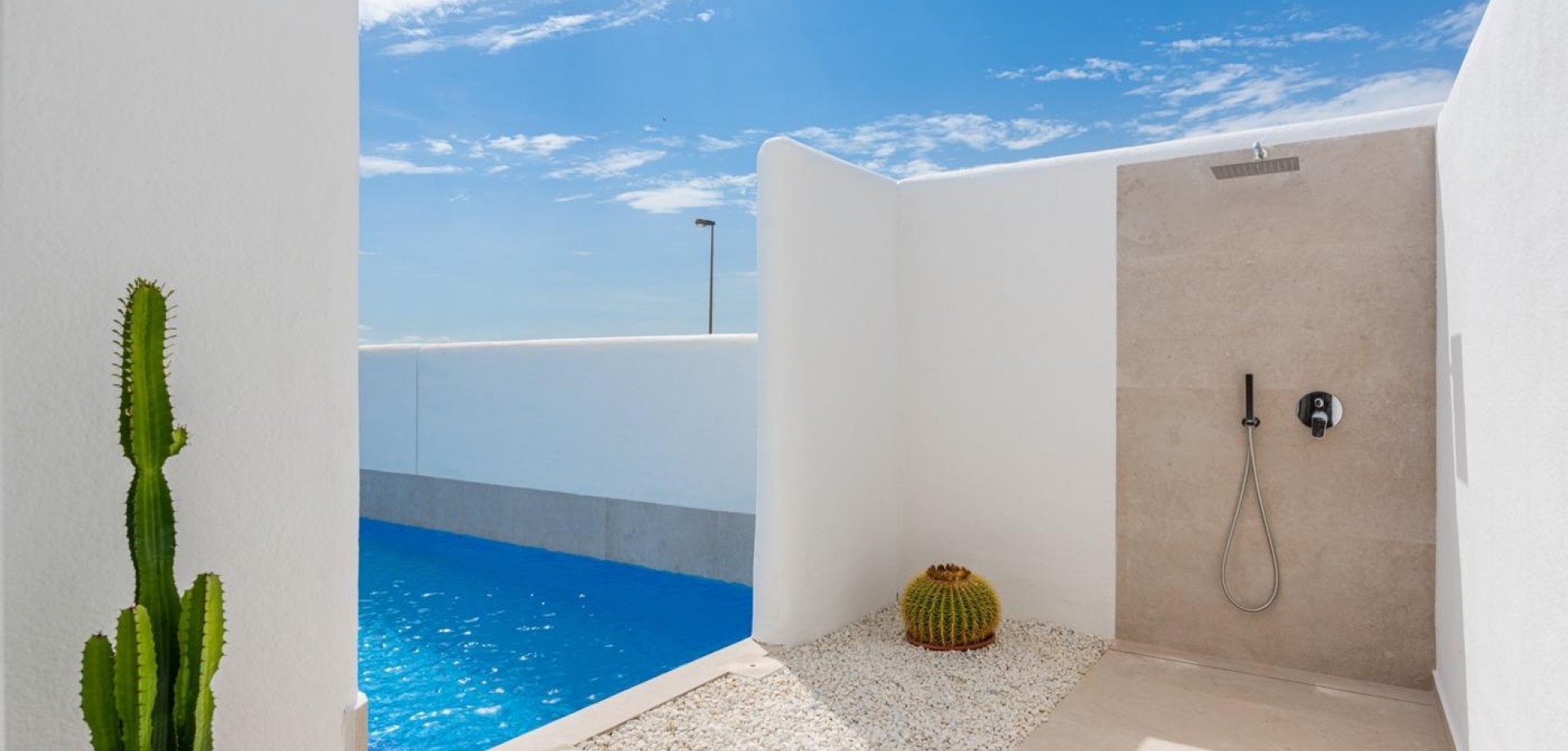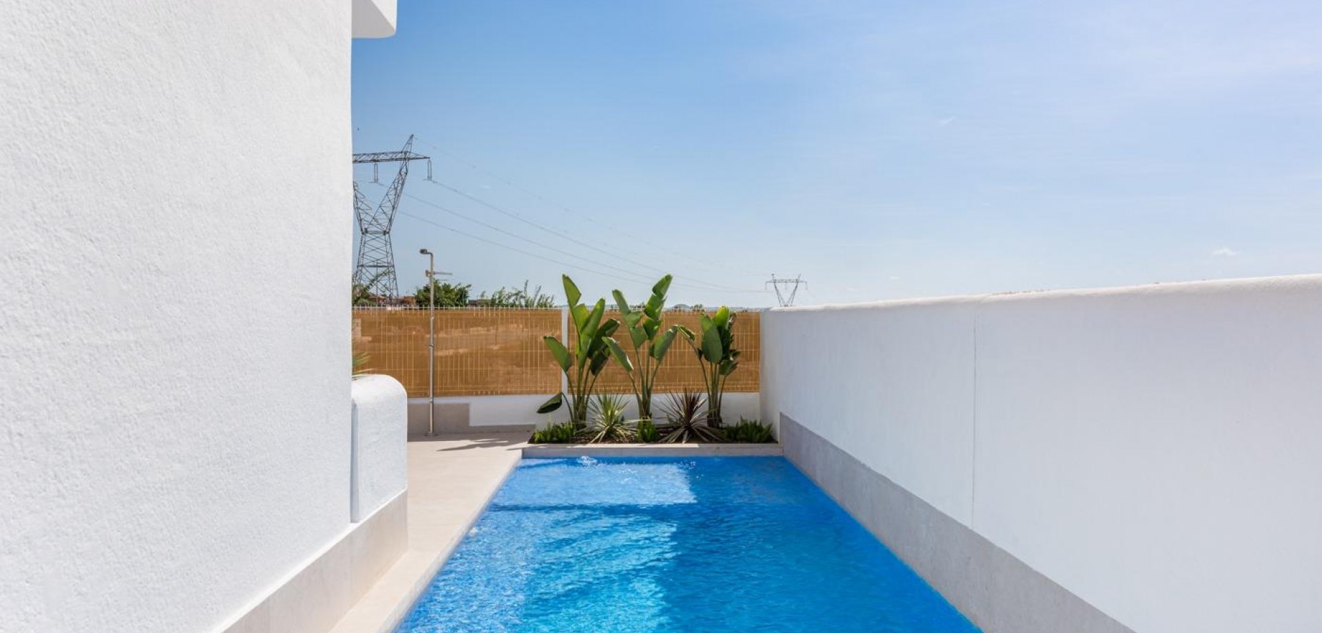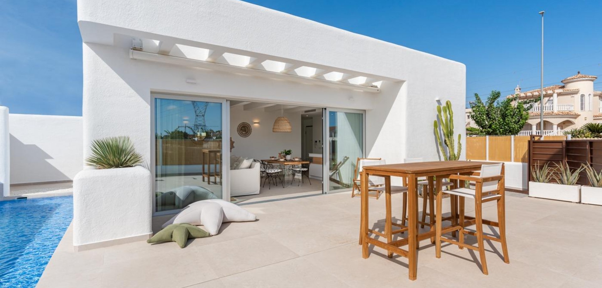 VILLAS DE OBRA NUEVA EN LOS ALCAZARES Villas de obra nueva en Los Alcazares . Villas de obra nueva estilo ibicenco en parcela independiente con terraza, zona de aparcamiento y piscina privada. La vivienda dispone de salón, cocina, 3 dormitorios, 2 baños, y tiene unas vistas privilegiadas. Posibilidad de solarium privado con coste adicional. Viviendas cuidadosamente diseñadas con materiales de alta calidad para satisfacer a los clientes más exigentes. Villas situadas a 1 km de la playa y del pueblo de Los Alcázares, donde se pueden practicar diversos deportes náuticos, rodeados de varios campos de golf. Ciudad de Cartagena a menos de 15 minutos en coche y a 30 minutos del aeropuerto de Murcia Corvera.