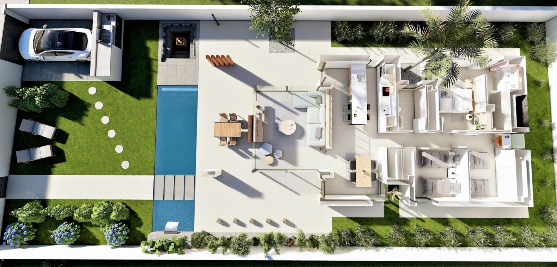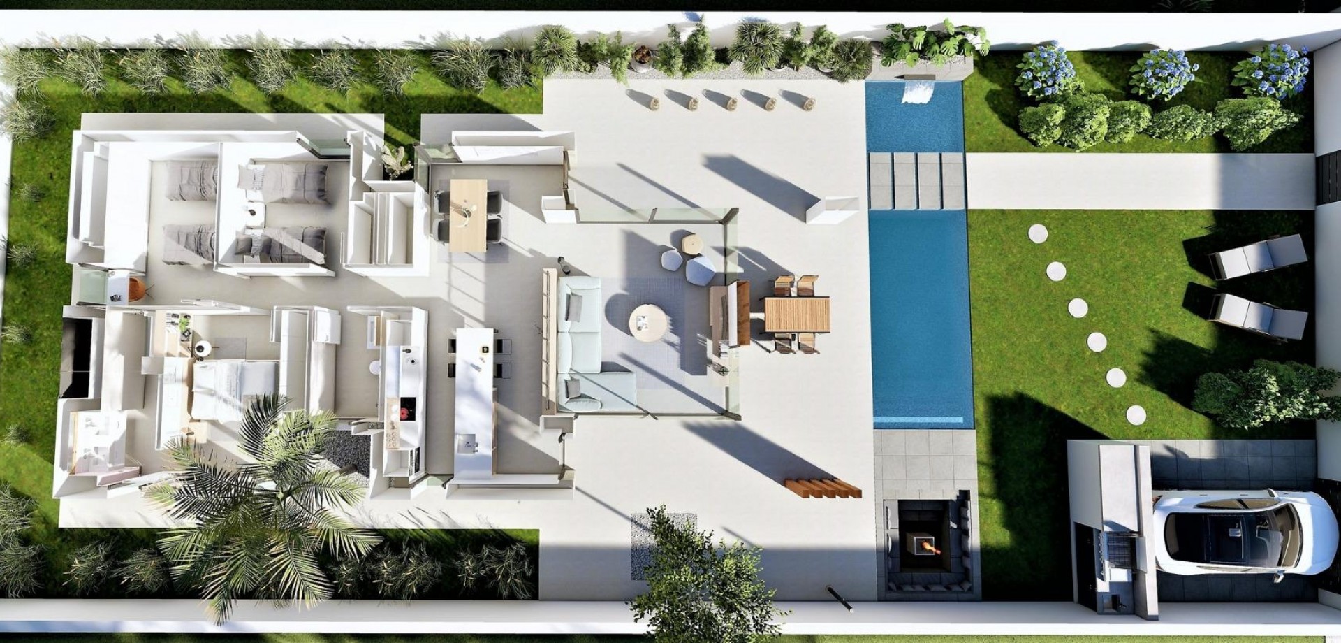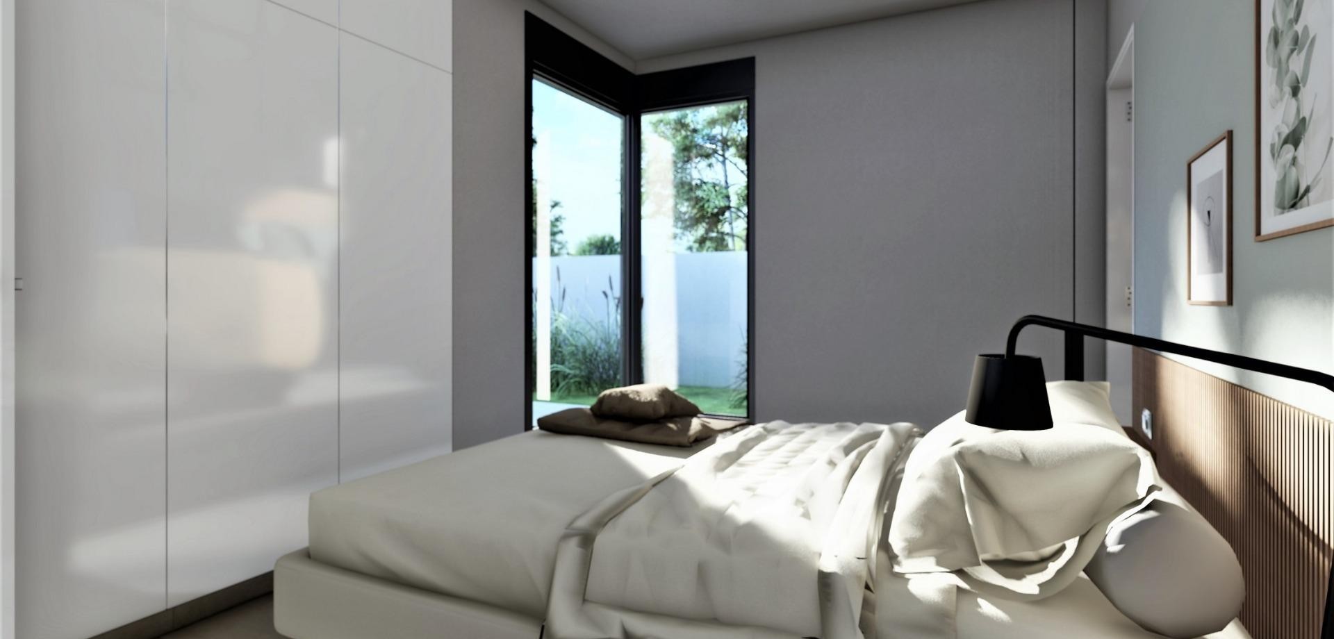 VILLAS DE OBRA NUEVA EN SAN FULGENCIO Villas de obra nueva San Fulgencio, a tan solo 5 km de la playa. Las villas ofrecen 3 dormitorios, 2 baños y amplia cocina, comedor, sala de estar, piscina con cascada y dos piscinas: piscina de chapoteo de 1,95x2,60 m y 0,6 m de profundidad, y piscina de 5,60x2,60 m, entre 1 y 1,5 m de profundidad variable. Un gran porche orientado al sur permite la continuidad del salón con el exterior, abriéndose a un moderno y funcional espacio exterior donde disfrutar de la piscina privada, barbacoa, chillout y amplia zona ajardinada que la rodea. Las líneas sencillas y claras del mobiliario contribuyen a su integración con el resto de la casa. Los detalles en madera aportan calidez al ambiente. Baños donde el color combinado con tonos naturales y cálidos, crean un ambiente acogedor, que unido a la relación directa con el exterior ,permite conectar con la naturaleza, consiguiendo grandes momentos de relax. El dormitorio principal dispone de un patio privado, que junto con la luz que penetra por sus ventanas, crea un ambiente relajante, perfecto para el descanso y la relajación. San Fulgencio es un pueblo agradable con varios restaurantes y tiendas y la ubicación es muy buena por su proximidad a las fantásticas playas de La Marina y al pueblo de Guardamar, un poco más grande. El pueblo de San Fulgencio está situado a unos 30 minutos del aeropuerto de Alicante-Elche, a 6 km del campo de golf más cercano y a sólo 5 km de la playa más cercana.