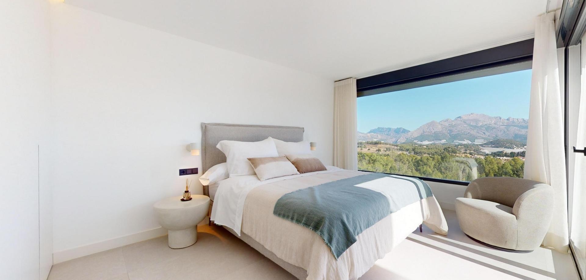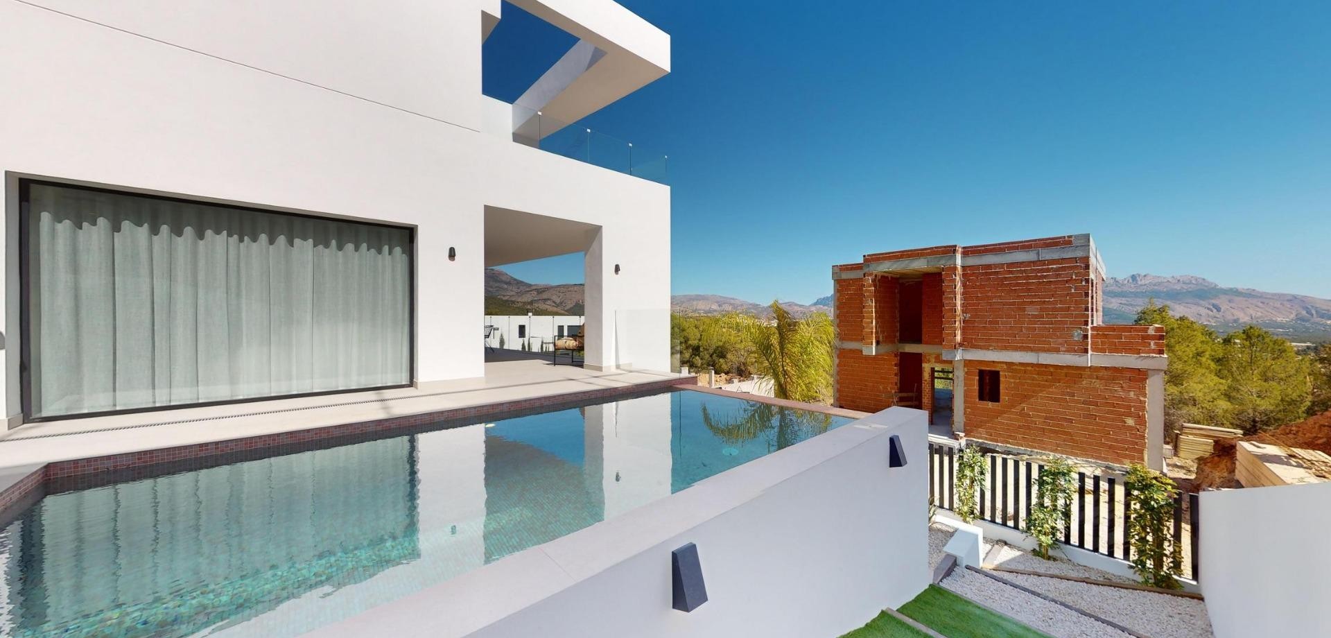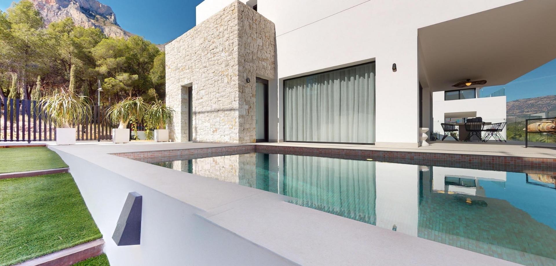 Villas de lujo de nueva construcción en Polop con impresionantes vistas Exclusiva Promoción de 6 Villas de Lujo en Polop Esta nueva promoción de 6 villas de lujo se encuentra en Polop, ofreciendo impresionantes vistas al mar y a la montaña. Cada villa está construida sobre una parcela independiente con piscina privada, aparcamiento, zona de barbacoa y un amplio jardín. Las villas se distribuyen en dos plantas más un semisótano, con un total de 293 m² en parcelas privadas de 393 m². Amplia distribución y diseño moderno En la planta principal, encontrará una moderna cocina con isla, un salón-comedor diáfano, un dormitorio, un baño, una terraza cubierta y una gran terraza descubierta, perfecta para disfrutar de las vistas de Polop, Altea y las montañas de los alrededores. La primera planta cuenta con dos amplios dormitorios, dos baños y dos terrazas, cubiertas y descubiertas. El semisótano se puede convertir en una vivienda independiente. Acabados de alta calidad y eficiencia energética Las villas disponen de cocina totalmente equipada con electrodomésticos Siemens. Los baños están totalmente equipados con grifería Roca de alta gama. Todas las viviendas disponen de calefacción por suelo radiante, aire acondicionado y piscina infinita. Las villas han sido diseñadas pensando en la eficiencia energética y cuentan con un certificado energético de clase A. Ubicación privilegiada cerca de los servicios Situadas a sólo 10 km de Benidorm y Altea, estas villas están a un corto trayecto en coche de La Nucía y Alfaz del Pi. La zona ofrece fácil acceso a los principales puntos de interés, incluyendo las playas de Benidorm (15 km), el aeropuerto de Alicante (65 km), y varios campos de golf (dentro de 10 km). La proximidad de Polop a estos servicios, combinada con su entorno tranquilo, lo convierte en un lugar ideal para los amantes de las actividades al aire libre y los que buscan tranquilidad.