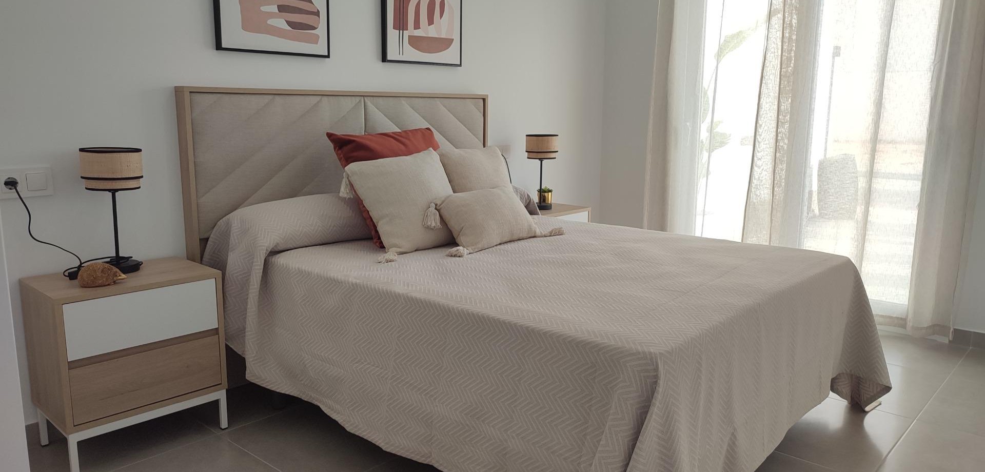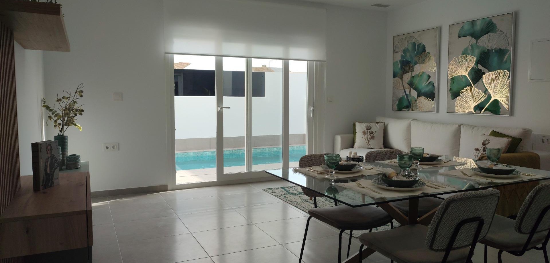 VILLAS DE OBRA NUEVA EN BALSICAS, MURCIA El residencial de nueva construcción dispone de 6 villas unifamiliares de una sola planta, con zona de terrazas, piscina privada, aparcamiento en la parcela y solarium con cocina de verano, para disfrutar de todas las horas de sol todos los días del año. Cada vivienda dispone de 3 dormitorios y 2 baños completos. La propiedad ha sido diseñada con un estilo contemporáneo y un concepto abierto, con una cocina totalmente equipada y un salón-comedor. La propiedad cumplirá con los más altos estándares y estará equipada con: Cocina completamente amueblada y equipada con horno, frigorífico y lavavajillas integrados, placa de cocción y campana extractora. Isla de trabajo en la cocina. Iluminación: en el interior de la vivienda (comedor, cocina, pasillos y baños), así como en las zonas exteriores. Armarios forrados con cajones. Cuartos de baño totalmente equipados con inodoro, mueble de baño, espejo y ducha con mamparas. Preinstalación de aire acondicionado por conductos. Solarium con cocina de verano, con preinstalación de electrodomésticos y puertas correderas. Piscina privada con ducha exterior. Plaza de aparcamiento en la parcela. Balsicas es un lugar perfecto para los amantes del golf y también para todo aquel que disfrute de los espacios verdes como lugares de ocio, belleza y tranquilidad. Su estratégica ubicación hace que la familia que decida vivir en este complejo tenga a su alcance todo lo que cualquier persona puede desear: un clima donde el sol brilla casi todo el año, playas cercanas, el Mar Menor y sus lodos naturales. con poderes curativos demostrados. Complejo situado a 20 minutos del aeropuerto de Murcia - Corvera y a 1 hora del aeropuerto de Alicante.