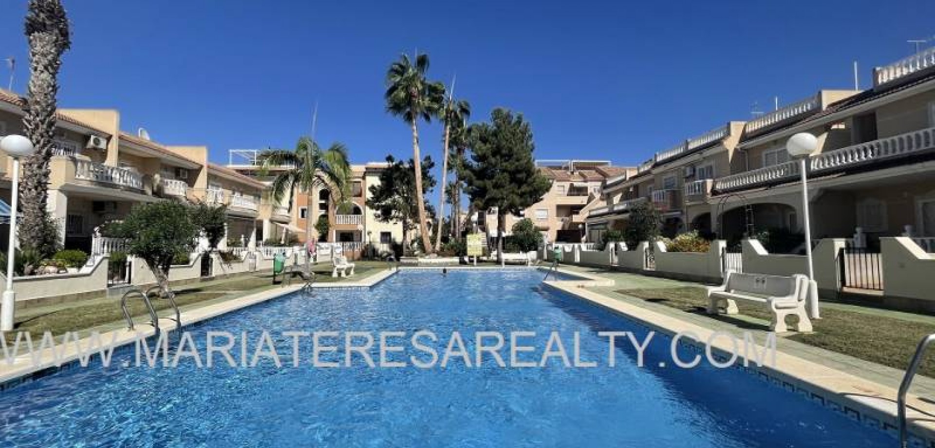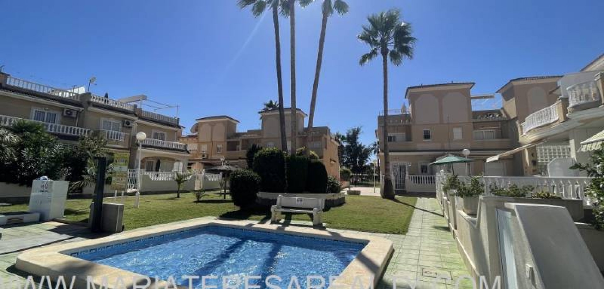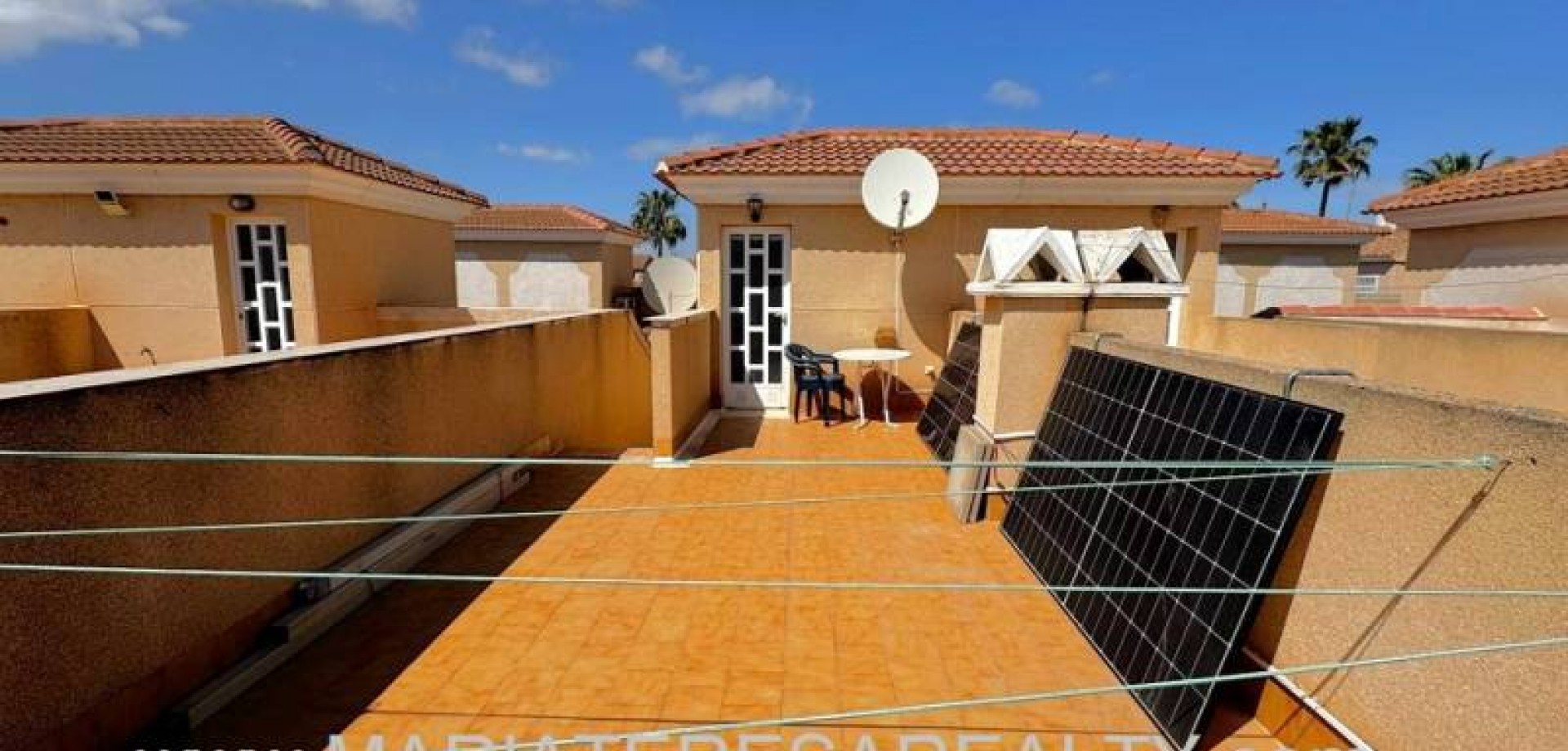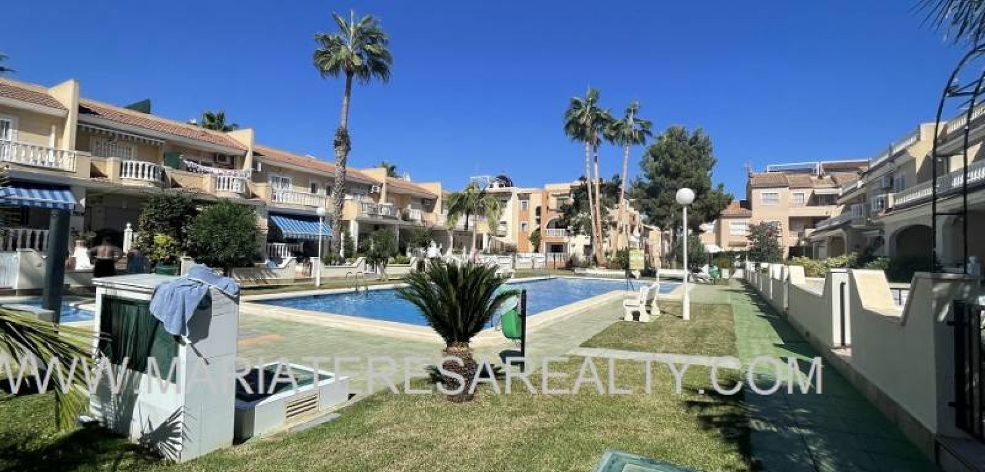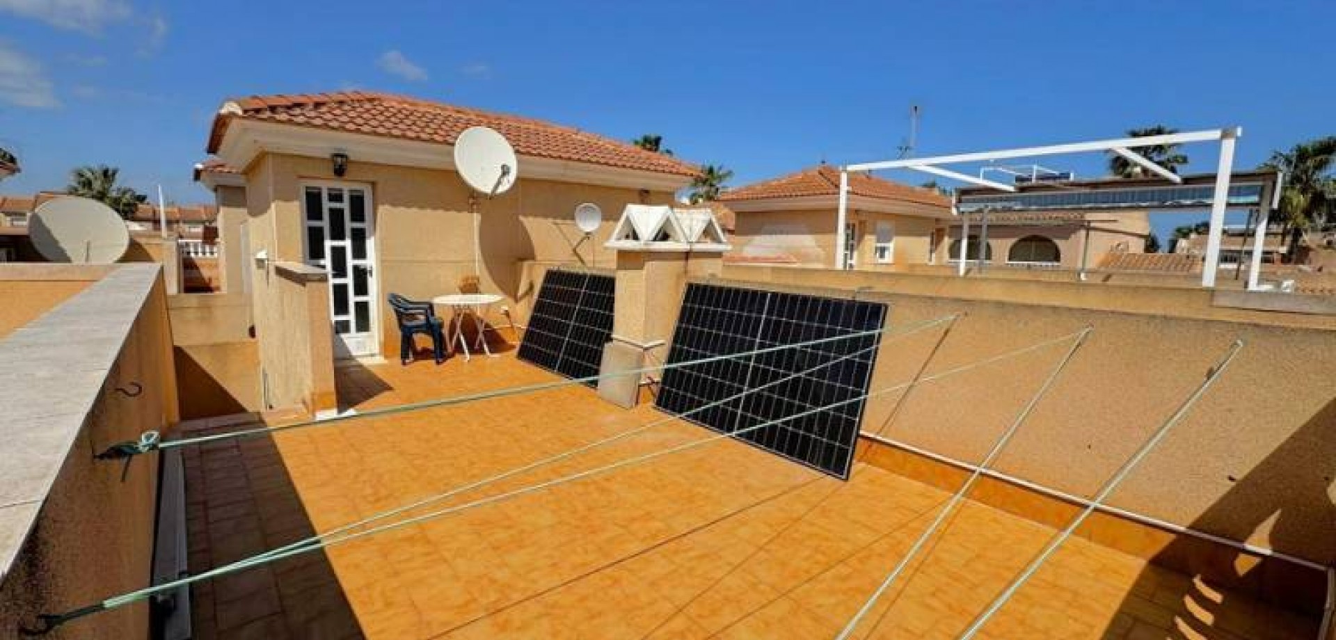 Precioso dúplex adosado con jardín privado orientación Sureste ideal para disfrutar del sol y equipado con toldos. Al entrar a la vivienda en esta planta baja de 36m2 tenemos distribuidos un amplio salón/comedor completamente amueblado y con aire acondicionado, seguido tenemos la cocina de diseño abierto completamente equipada con encimera de granito, a su vez tenemos un aseo, un pequeño hueco bajo la escalera utilizado de trastero y una salida al patio trasero equipado con un amplio trastero que a su vez nos da acceso a la zona comunitaria para acceder a la piscina. Subiendo las escaleras interiores tenemos la planta alta de 40m2 que consta de un amplio dormitorio principal con armario empotrado, aire acondicionado y con salida a un balcón, un cuarto de baño equipado con ducha y un segundo dormitorio equipado actualmente con sofá-cama, armario empotrado y aire condicionado, a su vez desde este dormitorio podemos acceder a una terraza acristalada con cerramiento de aluminio y que nos da acceso a las escaleras de acceso al solario a través de una puerta. En el solario tenemos unos 40m2 totalmente de uso privado equipados con placas solares y un amplio trastero donde se encuentra la lavadora y el termo y es de aproximadamente de unos 6m2.