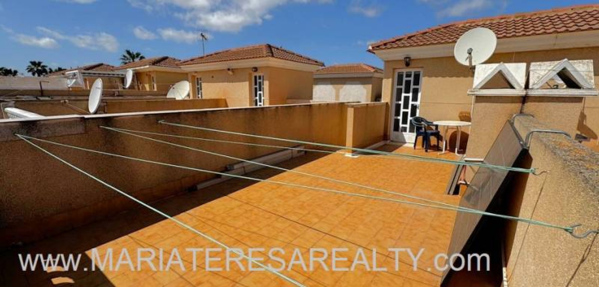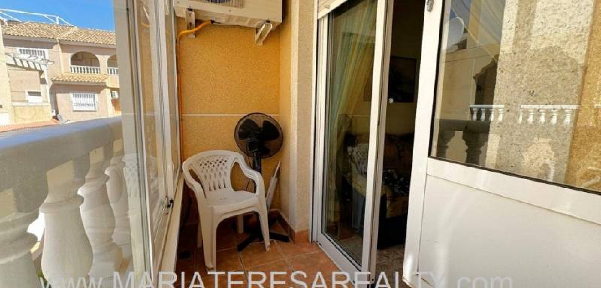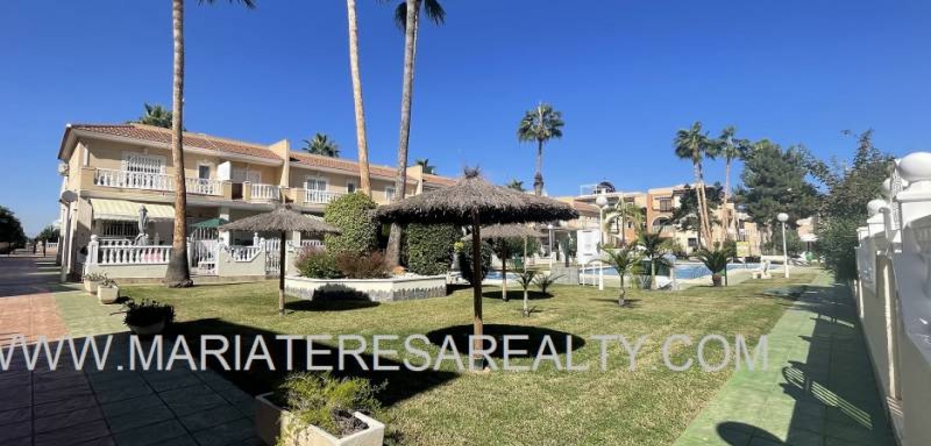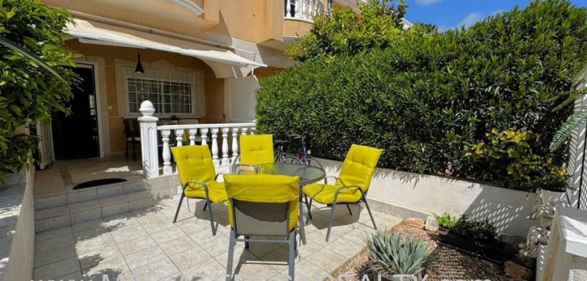Precioso dúplex adosado con jardín privado orientación Sureste ideal para disfrutar del sol y equipado con toldos. Al entrar a la vivienda en esta planta baja de 36m2 tenemos distribuidos un amplio salón/comedor completamente amueblado y con aire acondicionado, seguido tenemos la cocina de diseño abierto completamente equipada con encimera de granito, a su vez tenemos un aseo, un pequeño hueco bajo la escalera utilizado de trastero y una salida al patio trasero equipado con un amplio trastero que a su vez nos da acceso a la zona comunitaria para acceder a la piscina. Subiendo las escaleras interiores tenemos la planta alta de 40m2 que consta de un amplio dormitorio principal con armario empotrado, aire acondicionado y con salida a un balcón, un cuarto de baño equipado con ducha y un segundo dormitorio equipado actualmente con sofá-cama, armario empotrado y aire condicionado, a su vez desde este dormitorio podemos acceder a una terraza acristalada con cerramiento de aluminio y que nos da acceso a las escaleras de acceso al solario a través de una puerta. En el solario tenemos unos 40m2 totalmente de uso privado equipados con placas solares y un amplio trastero donde se encuentra la lavadora y el termo y es de aproximadamente de unos 6m2.