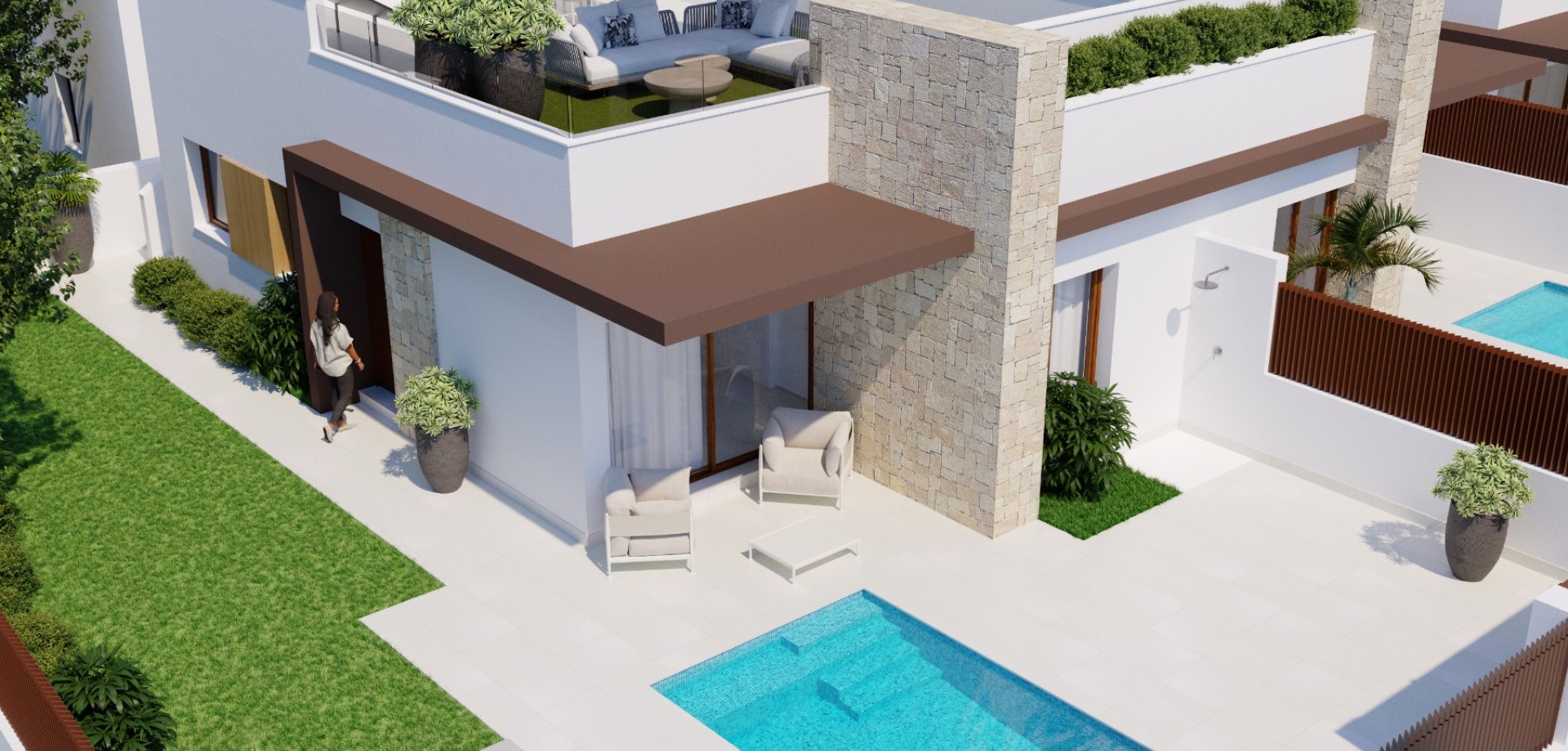Découvrez ces superbes villas individuelles, chacune dotée d'une piscine privée de 5 x 2,5 mètres. Conçues pour le confort et le style, ces maisons offrent deux chambres spacieuses et deux salles de bains modernes, l'une équipée d'une colonne d'hydromassage et l'autre d'une élégante colonne de douche. La luxueuse cuisine est dotée d'un plan de travail en grès cérame, d'un évier en acier inoxydable et d'une élégante hotte aspirante décorative fixée au plafond, créant un mélange parfait de fonctionnalité et de sophistication.