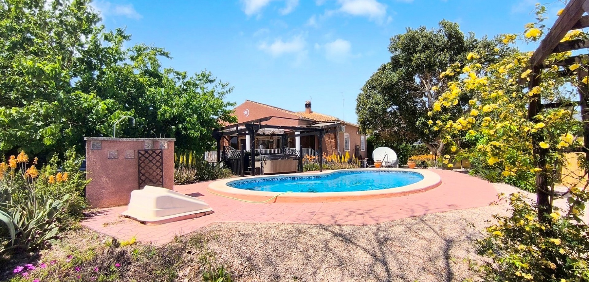 À l'extérieur, la propriété brille par sa piscine privée, son jacuzzi et ses jardins paysagers, ainsi que par ses 30 m² de terrasses parfaites pour les repas en plein air et la détente. Un grand parking privé sur le terrain offre à la fois intimité et praticité.