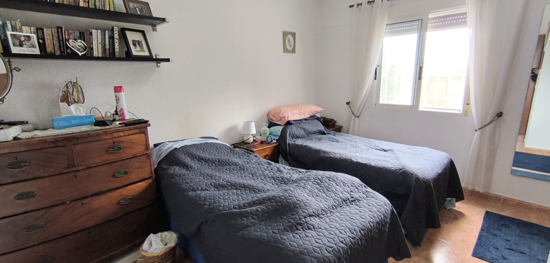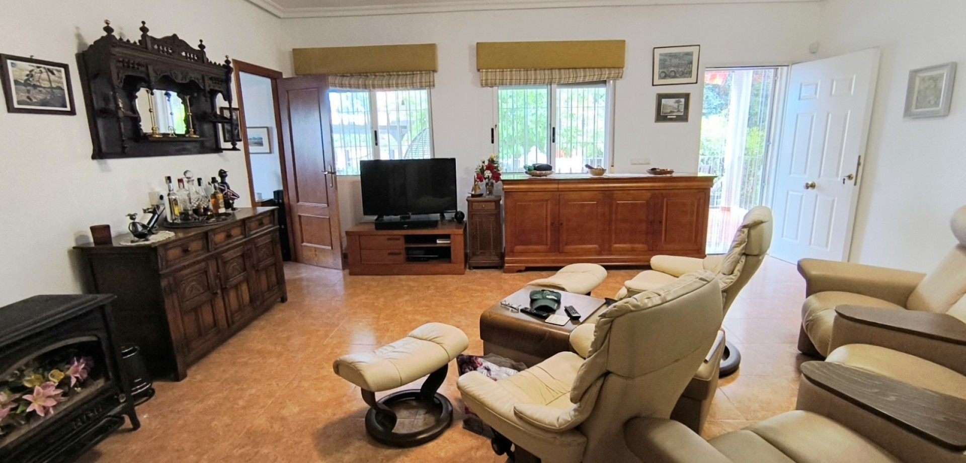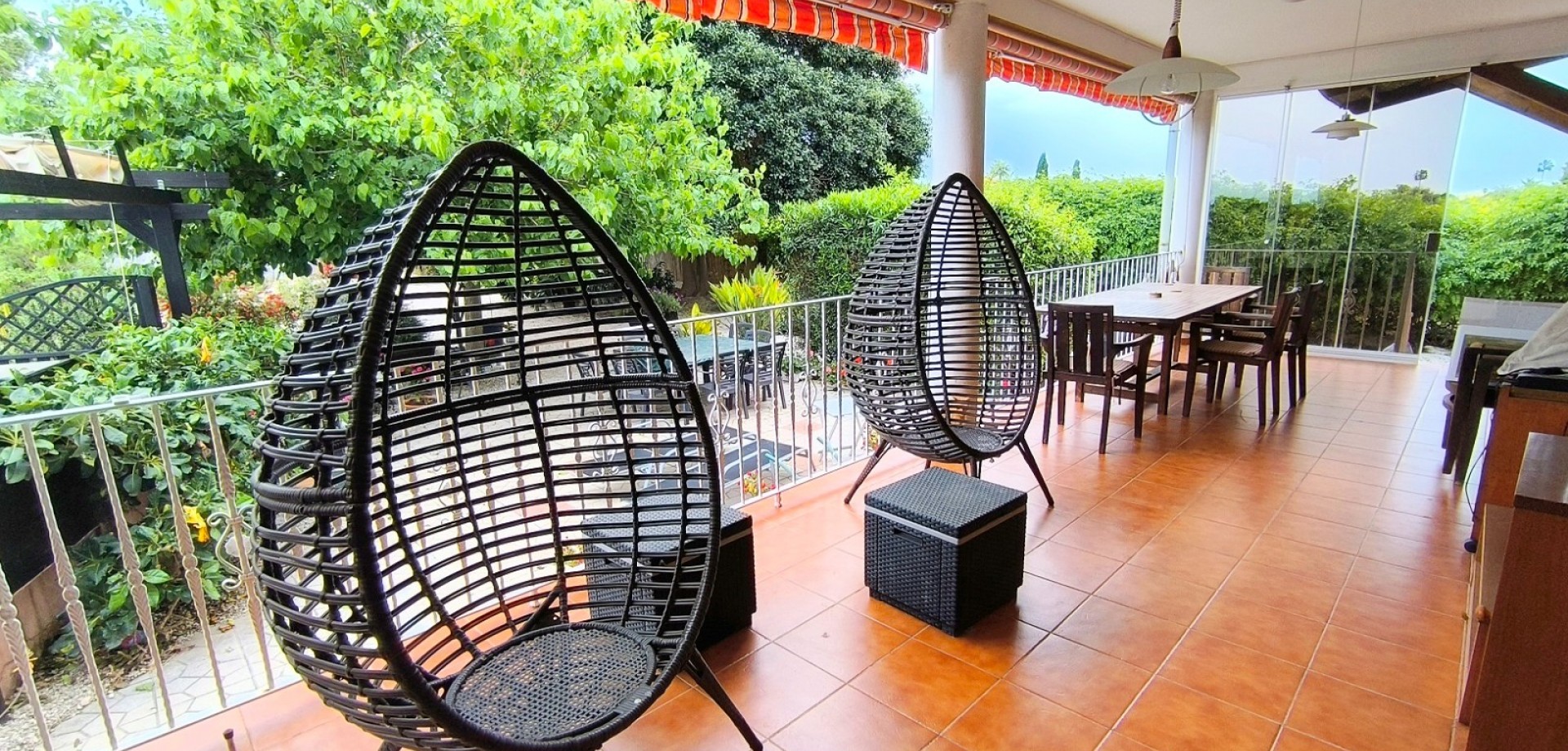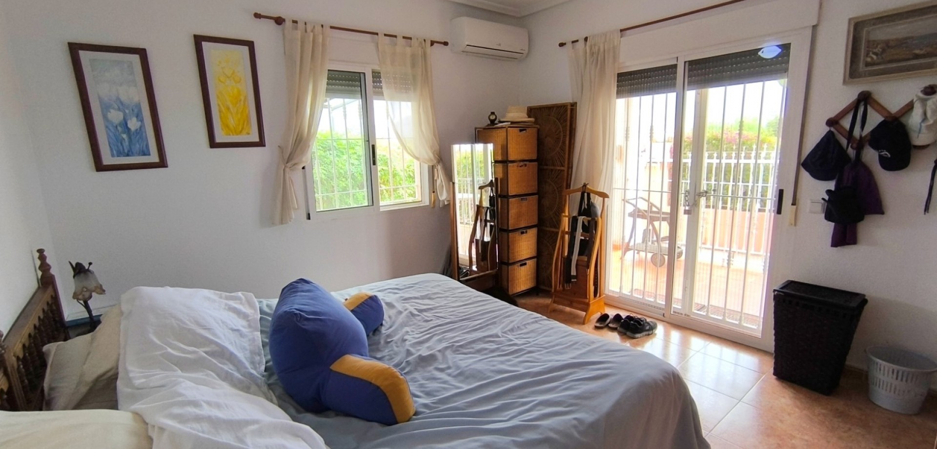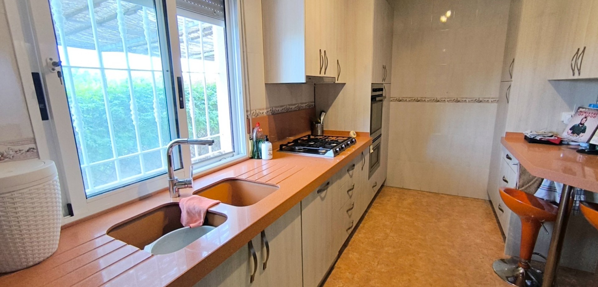 La maison offre 110 m² d'espace de vie lumineux et bien agencé, comprenant un séjour spacieux baigné de lumière naturelle et une cuisine entièrement équipée, dotée d'appareils électroménagers de qualité et d'une disposition fonctionnelle. Les trois chambres sont dotées de placards intégrés, de ventilateurs de plafond et de la climatisation. La chambre principale bénéficie d'une salle de bains privative.