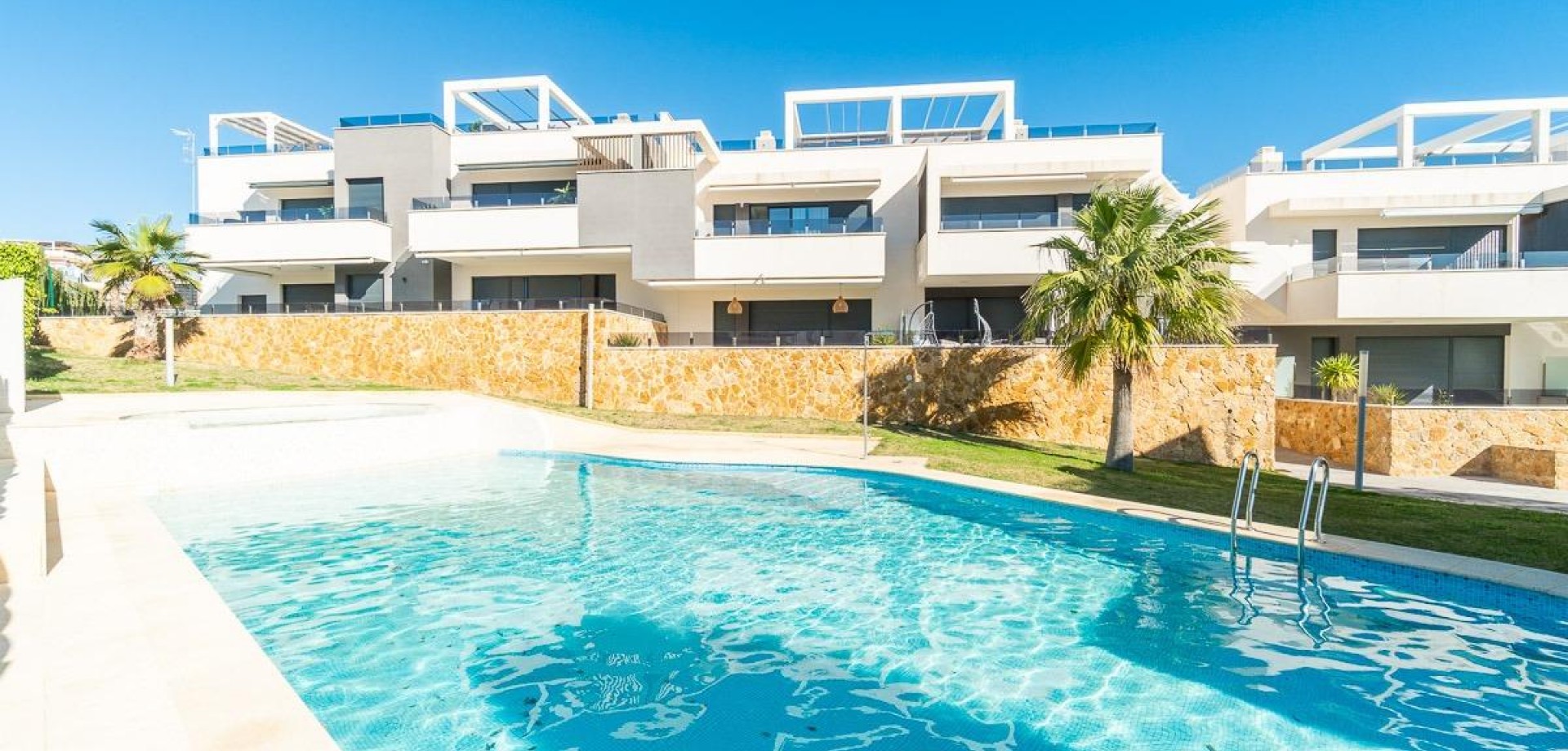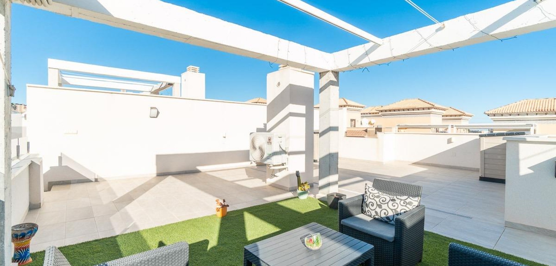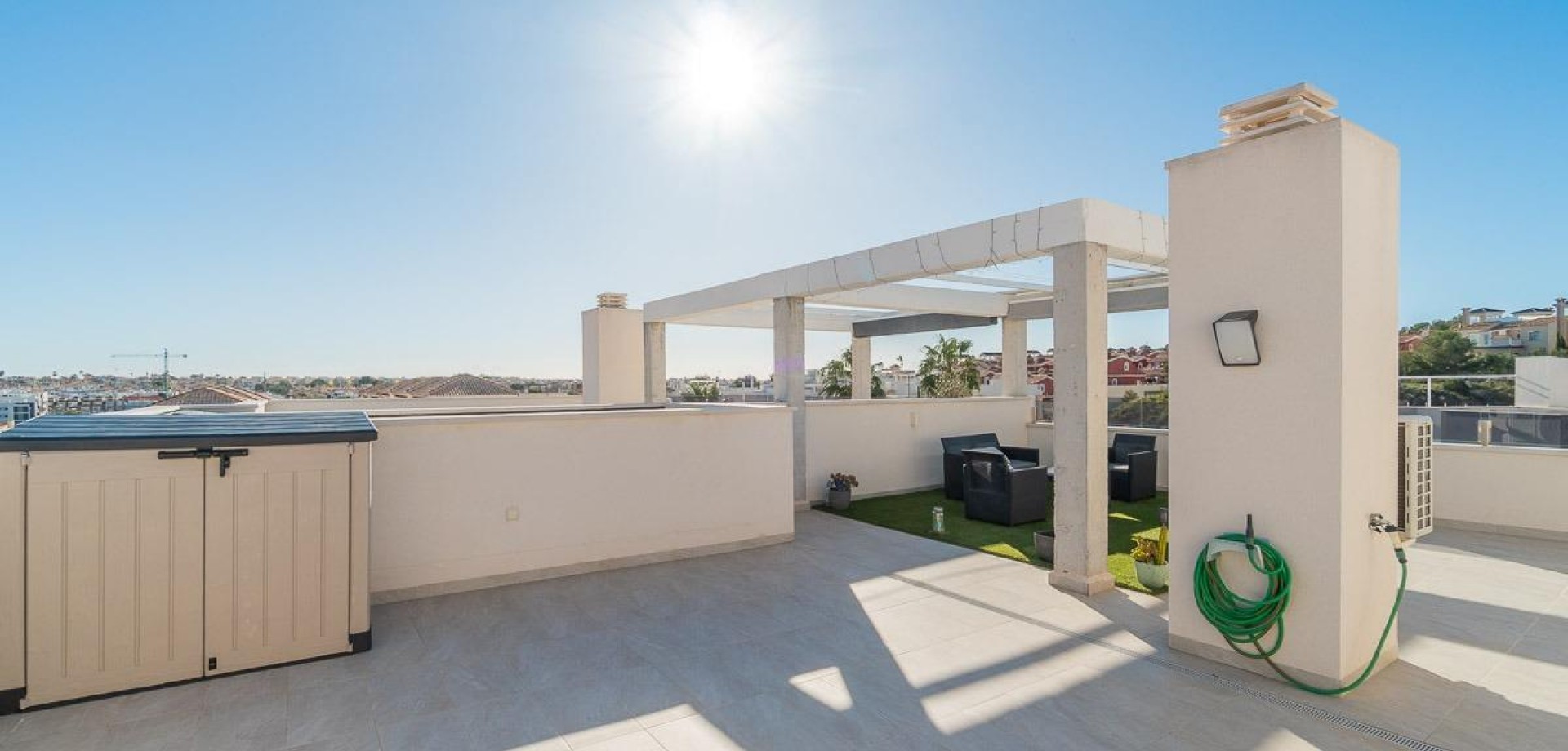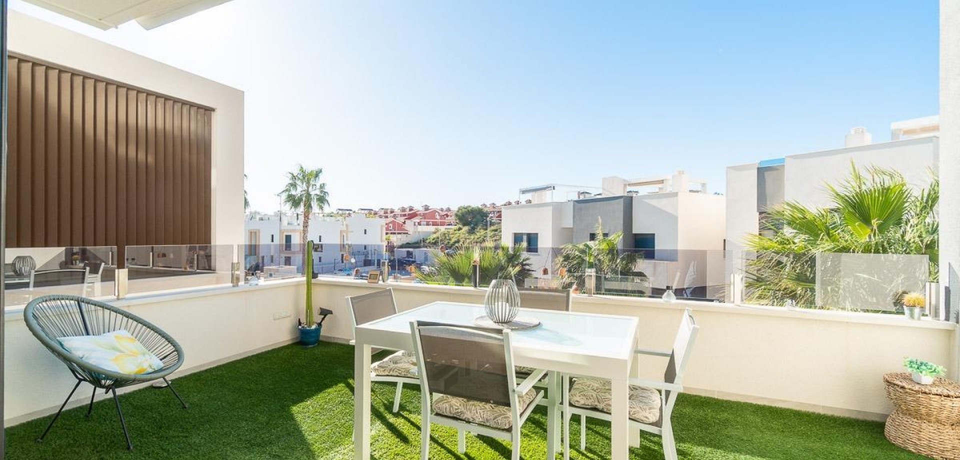 Découvrez ce superbe bungalow à l’étage supérieur situé dans la prestigieuse zone de PAU 26, Orihuela Costa, un environnement privilégié où se conjuguent design moderne, confort et qualité de vie.. . Cette propriété semi-neuve, construite en 2022, offre 76 m2 construits, une distribution fonctionnelle et une excellente orientation plein sud, garantissant une luminosité naturelle tout au long de la journée.. . Depuis la rue, vous accédez à une résidence privée et exclusive de seulement 24 logements, assurant tranquillité, intimité et un cadre résidentiel haut de gamme. À l’entrée, vous découvrez un spacieux et lumineux salon-salle à manger avec une cuisine ouverte moderne. Le salon donne accès à une terrasse de 12 m2, équipée d’un store électrique et de gazon artificiel, idéale pour profiter de l’extérieur toute l’année grâce à son exposition ensoleillée.. La maison dispose également d’une buanderie, de deux grandes chambres doubles et de deux salles de bains complètes, toutes deux avec chauffage au sol, un véritable plus en matière de confort.. . Depuis la terrasse, un escalier privé mène au joyau de la propriété : un magnifique solarium privé d’environ 71 m2, aménagé avec gazon artificiel et stores, parfait pour créer un espace chill-out exclusif ou se détendre au soleil méditerranéen.. . Parmi les prestations : sol en grès cérame, moustiquaires à toutes les fenêtres, porte blindée, store électrique sur la terrasse et store manuel sur la pergola du solarium.. . La propriété est vendue avec une place de parking et un débarras fermé, offrant un confort supplémentaire.. . La résidence dispose d’une superbe piscine communautaire, de jardins parfaitement entretenus et d’espaces communs de grande qualité, dans un cadre réellement luxueux.. . Située à seulement 3,5 km de la mer, la propriété se trouve à proximité de plages emblématiques telles que La Zenia et Playa Flamenca, réputées pour leurs eaux cristallines et leurs services.. . La proximité de plusieurs parcours de golf renommés en fait également un excellent investissement locatif saisonnier, très recherché.. . Une propriété pensée pour offrir exclusivité, confort et art de vivre méditerranéen.. Une opportunité unique à découvrir sans tarder.. Prix : 349 000 €. Taxes et frais d’acquisition non inclus (conformément à la réglementation en vigueur). Un détail des frais supplémentaires sera communiqué avant la réservation.