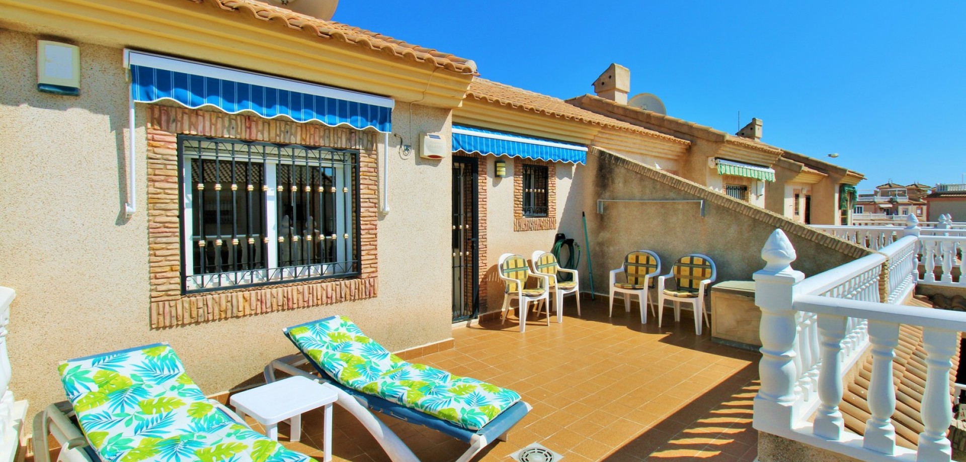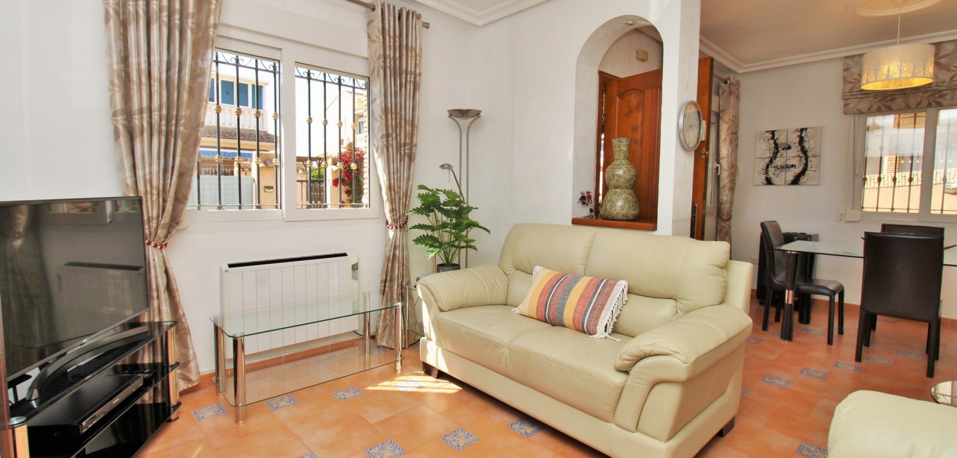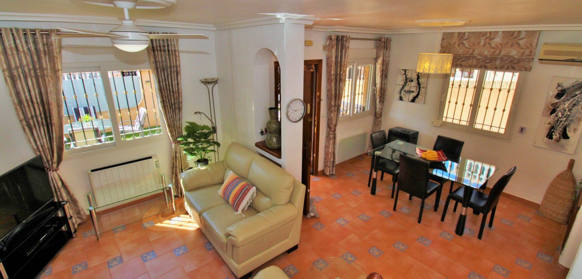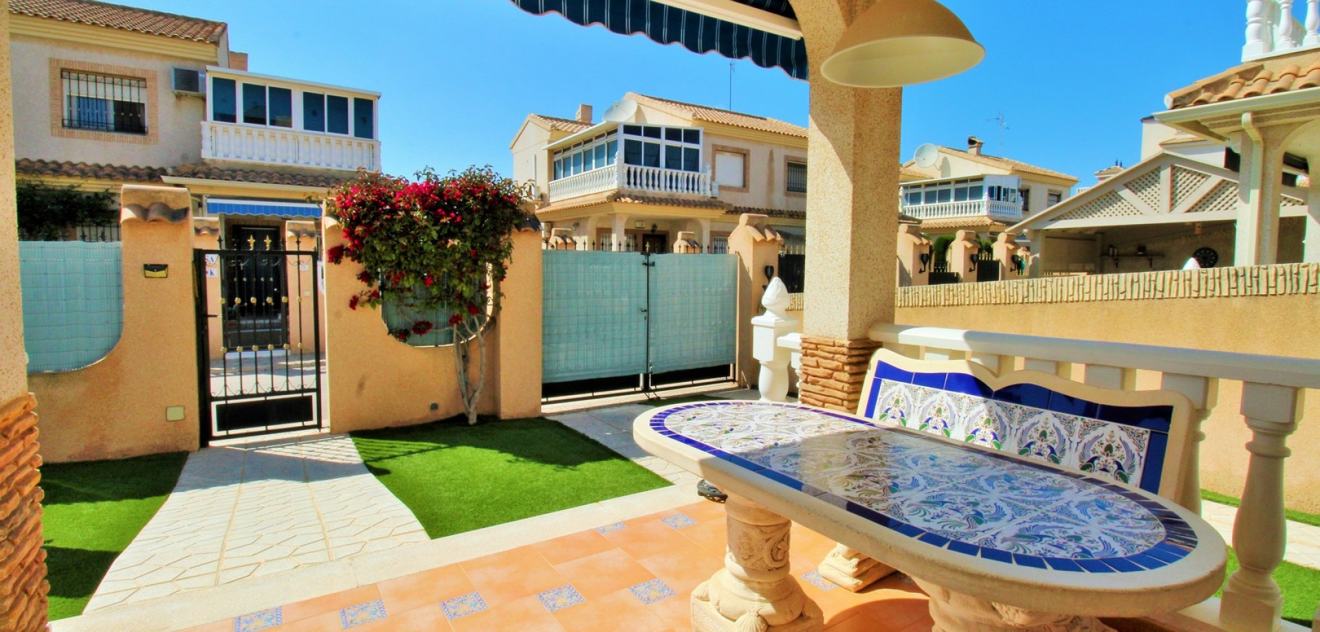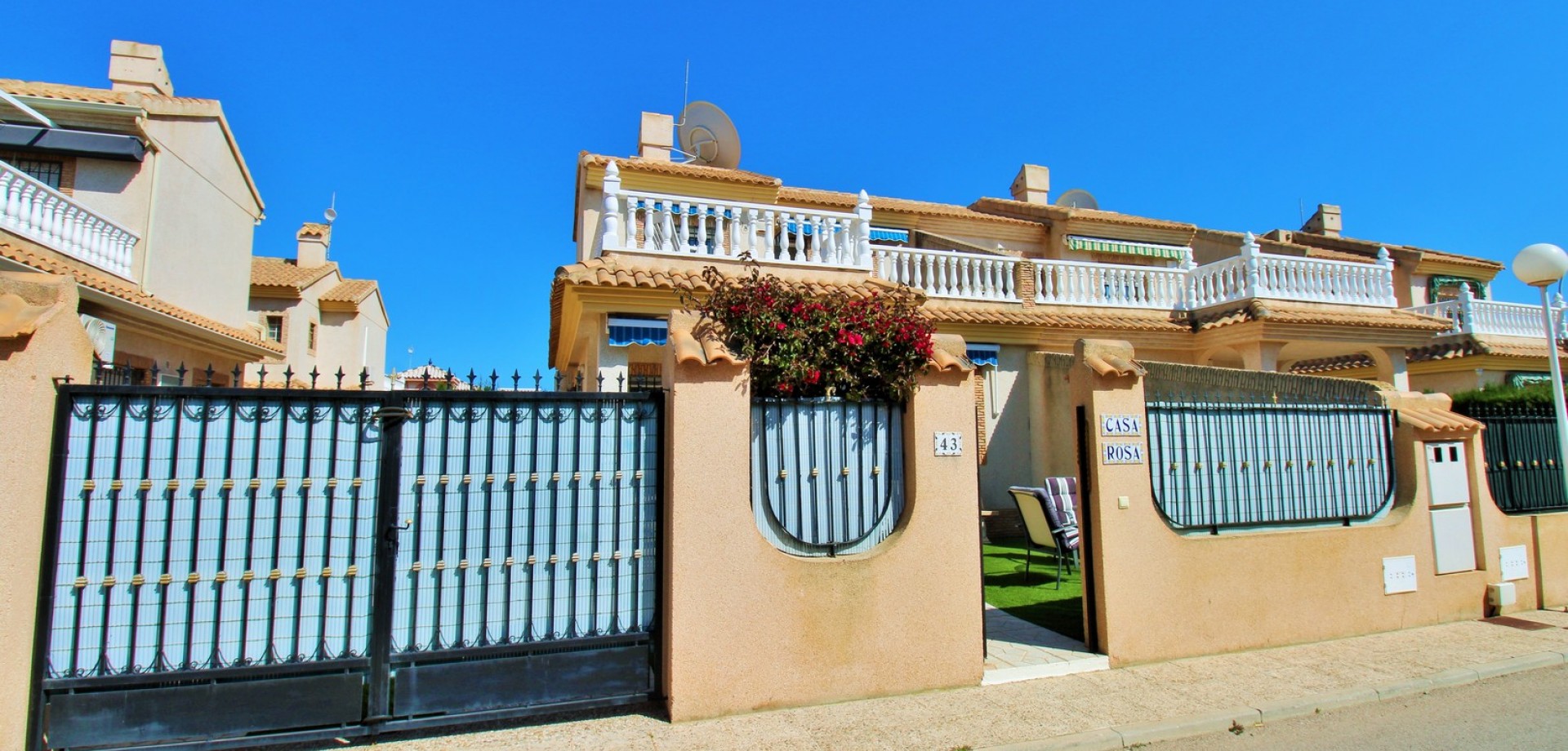 Située dans la très recherchée résidence Flamingo Hills II à Playa Flamenca, cette maison mitoyenne de 3 chambres et 2 salles de bains offre de beaux espaces extérieurs, une distribution pratique et un emplacement idéal à distance de marche de toutes les commodités. Nichée dans une rue communautaire privée, la propriété bénéficie d’un environnement calme tout en étant à proximité immédiate de nombreux bars, restaurants, supermarchés et du célèbre centre commercial Zenia Boulevard. La maison dispose d’un jardin privé à l’avant avec entrée pour véhicule, idéal pour stationner ou profiter de l’extérieur, ainsi qu’une terrasse couverte parfaite pour se détendre. À l’intérieur, vous trouverez un lumineux salon-salle à manger, ainsi qu’une cuisine indépendante partiellement modernisée. Le rez-de-chaussée comprend également une chambre double avec placards intégrés et une salle de bain avec douche à l’italienne, idéale pour les invités. Un espace de rangement sous l’escalier apporte un confort supplémentaire. À l’étage, il y a deux autres chambres doubles avec placards intégrés et une seconde salle de bain familiale. Depuis le palier, vous accédez à un grand solarium privé, parfait pour se détendre, recevoir ou profiter de repas en extérieur. La propriété fait partie d’une résidence bien entretenue avec accès à une belle piscine communautaire située à proximité. Vendue entièrement meublée avec électroménager, cette propriété est idéale comme résidence principale ou secondaire.