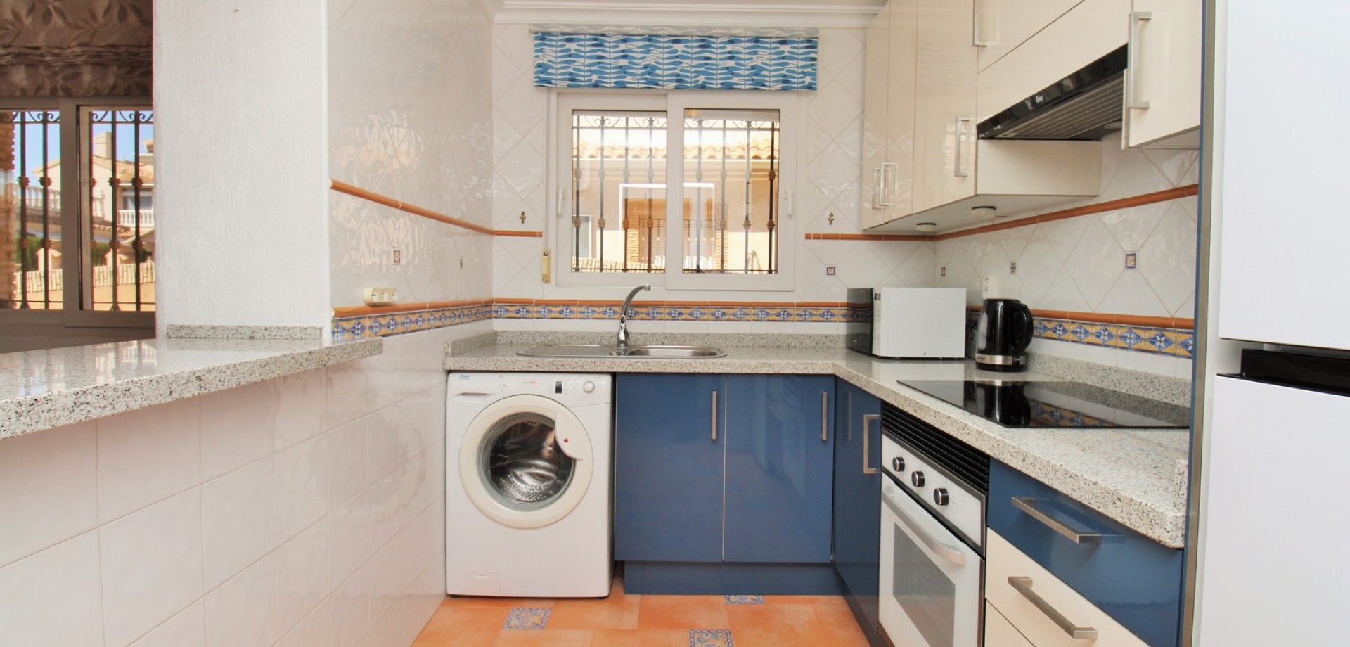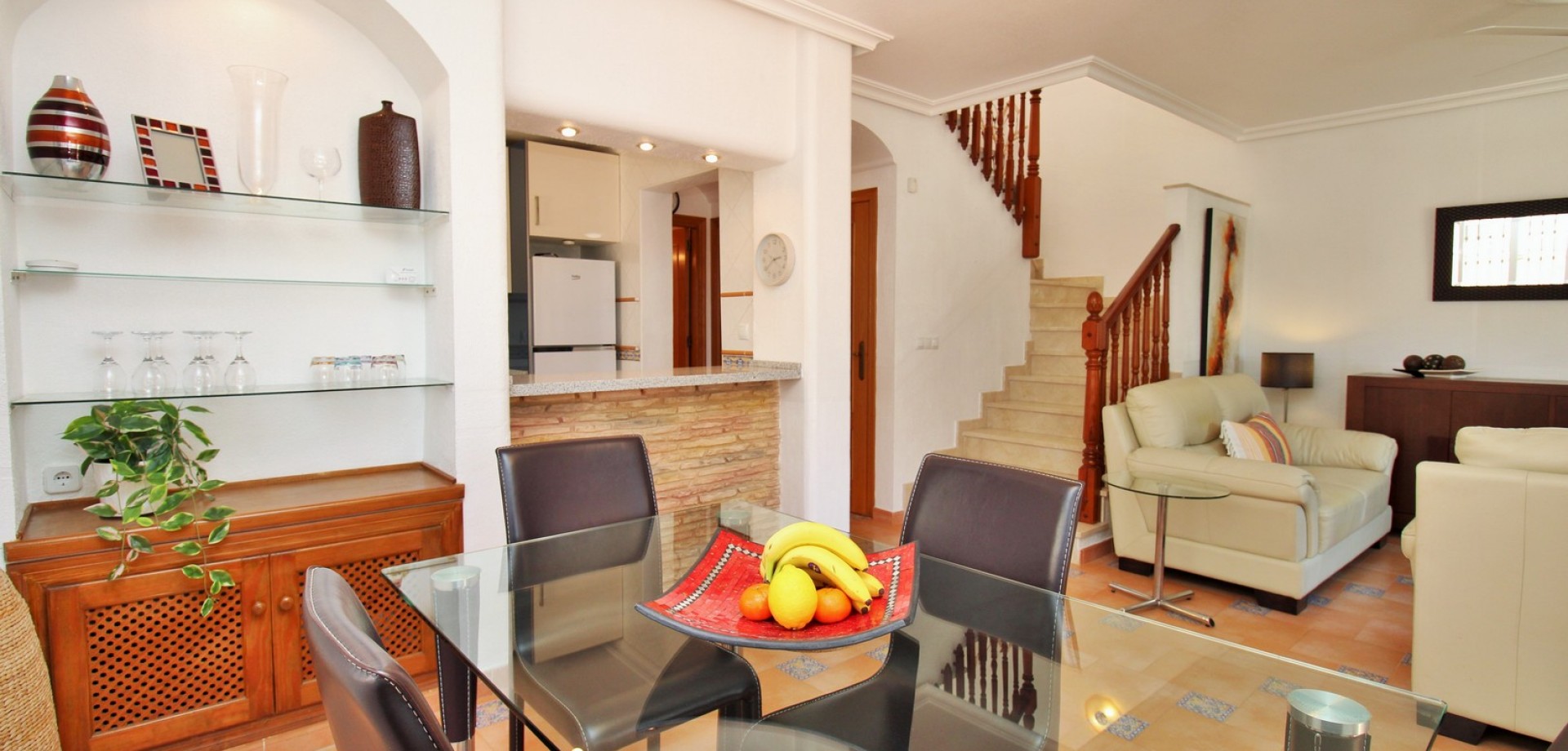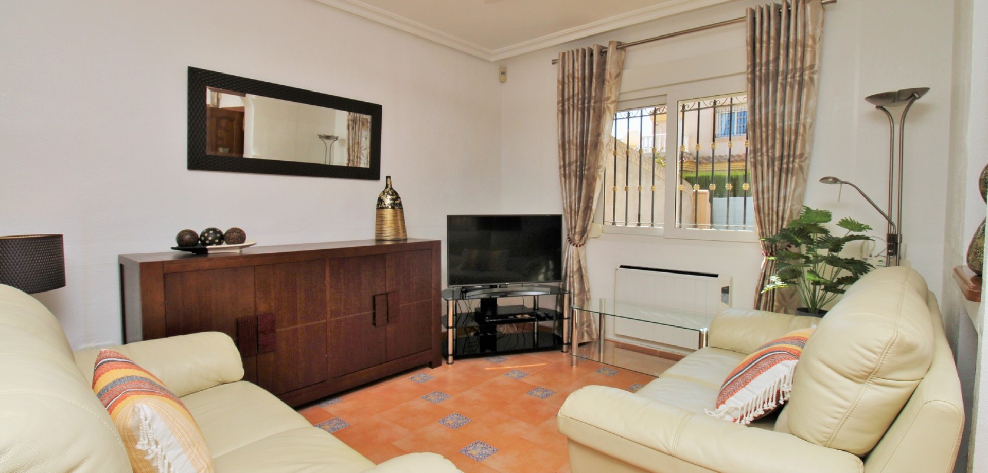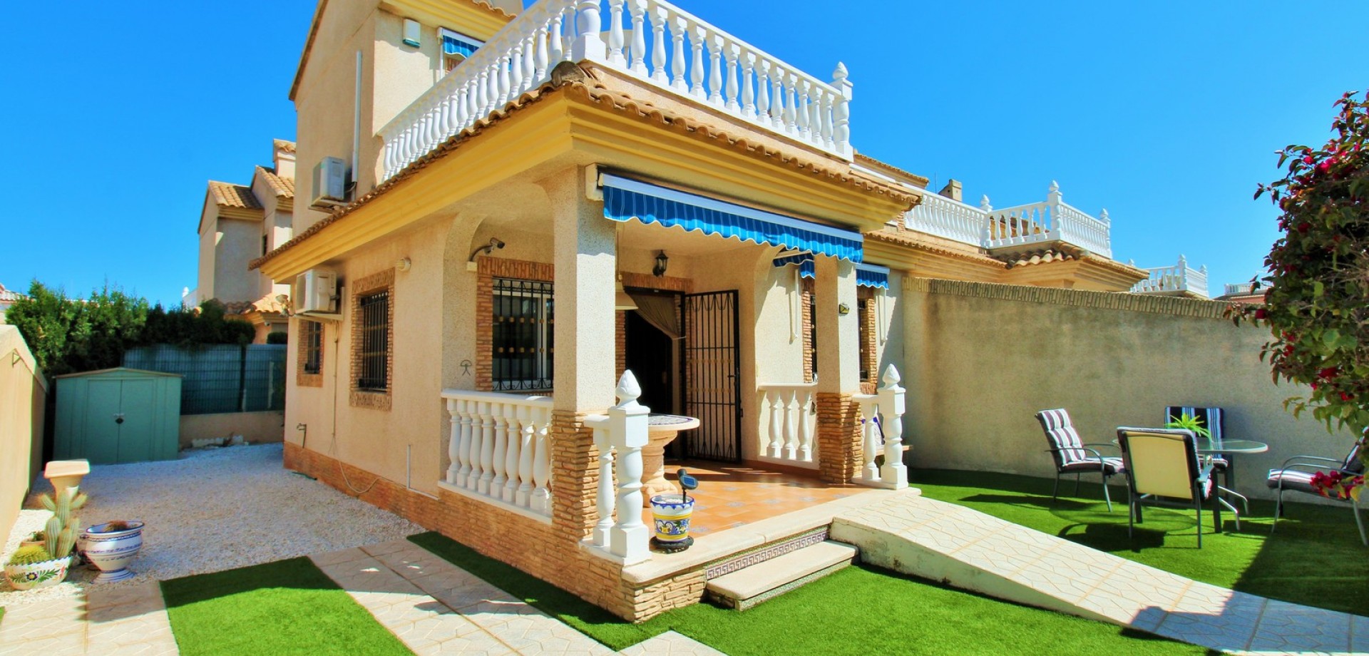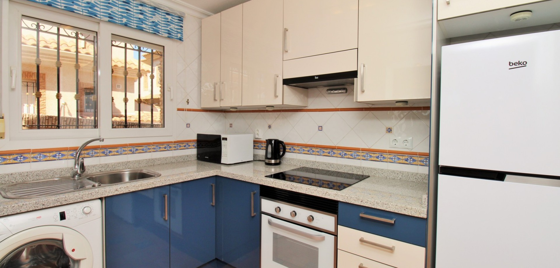 Située dans la très recherchée résidence Flamingo Hills II à Playa Flamenca, cette maison mitoyenne de 3 chambres et 2 salles de bains offre de beaux espaces extérieurs, une distribution pratique et un emplacement idéal à distance de marche de toutes les commodités. Nichée dans une rue communautaire privée, la propriété bénéficie d’un environnement calme tout en étant à proximité immédiate de nombreux bars, restaurants, supermarchés et du célèbre centre commercial Zenia Boulevard. La maison dispose d’un jardin privé à l’avant avec entrée pour véhicule, idéal pour stationner ou profiter de l’extérieur, ainsi qu’une terrasse couverte parfaite pour se détendre. À l’intérieur, vous trouverez un lumineux salon-salle à manger, ainsi qu’une cuisine indépendante partiellement modernisée. Le rez-de-chaussée comprend également une chambre double avec placards intégrés et une salle de bain avec douche à l’italienne, idéale pour les invités. Un espace de rangement sous l’escalier apporte un confort supplémentaire. À l’étage, il y a deux autres chambres doubles avec placards intégrés et une seconde salle de bain familiale. Depuis le palier, vous accédez à un grand solarium privé, parfait pour se détendre, recevoir ou profiter de repas en extérieur. La propriété fait partie d’une résidence bien entretenue avec accès à une belle piscine communautaire située à proximité. Vendue entièrement meublée avec électroménager, cette propriété est idéale comme résidence principale ou secondaire.