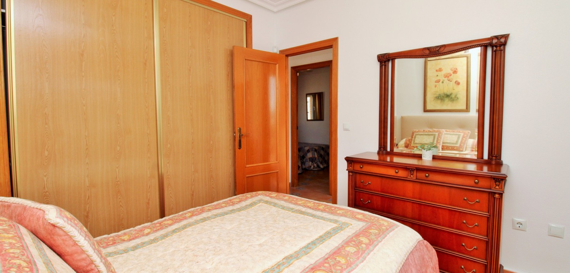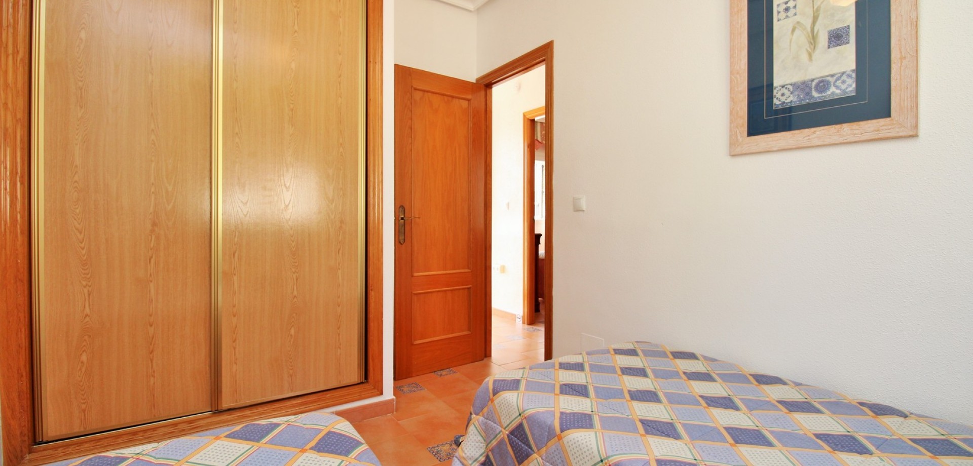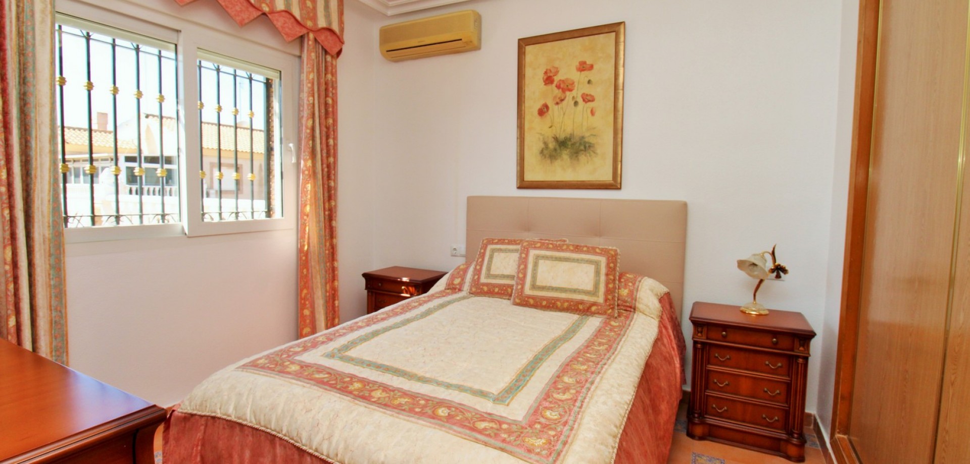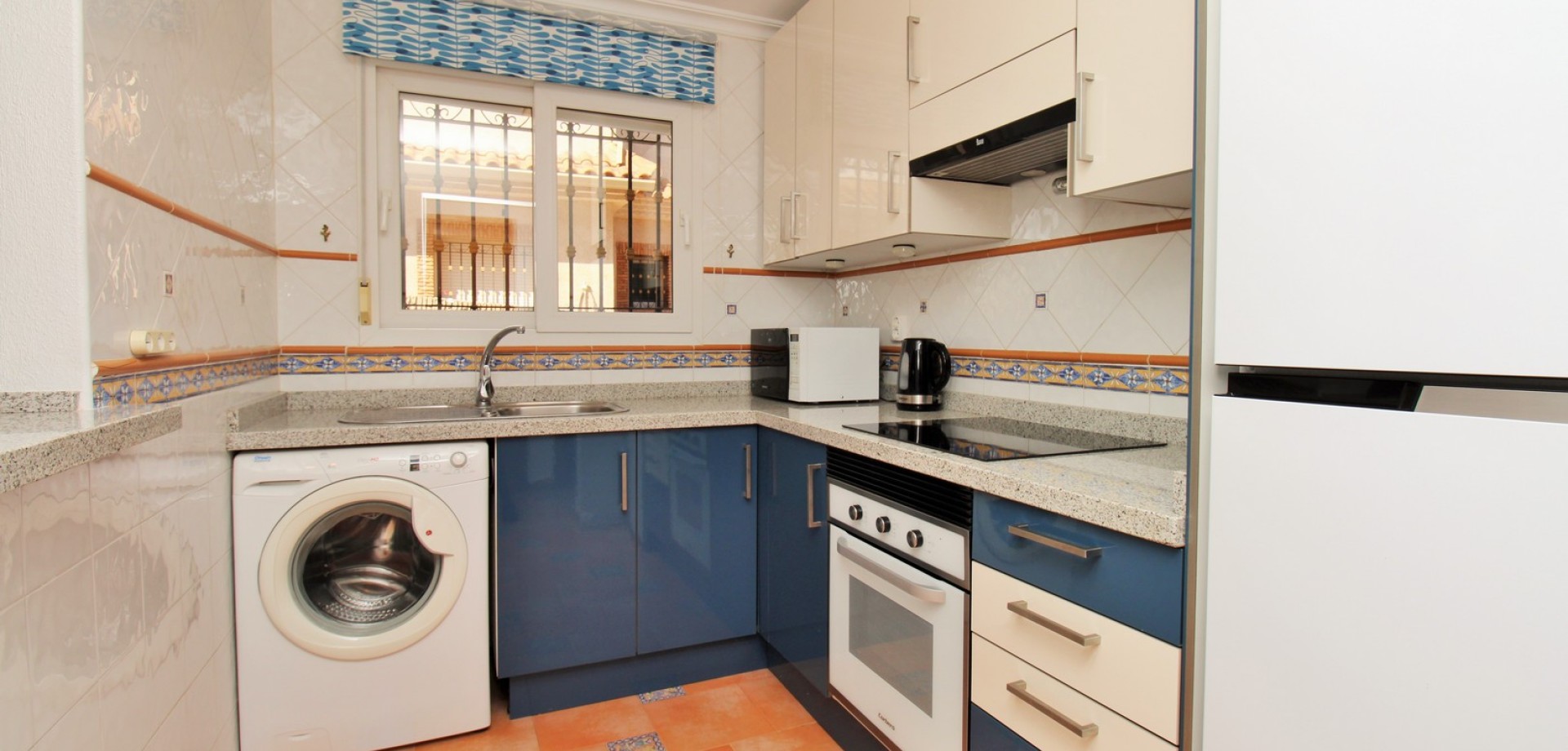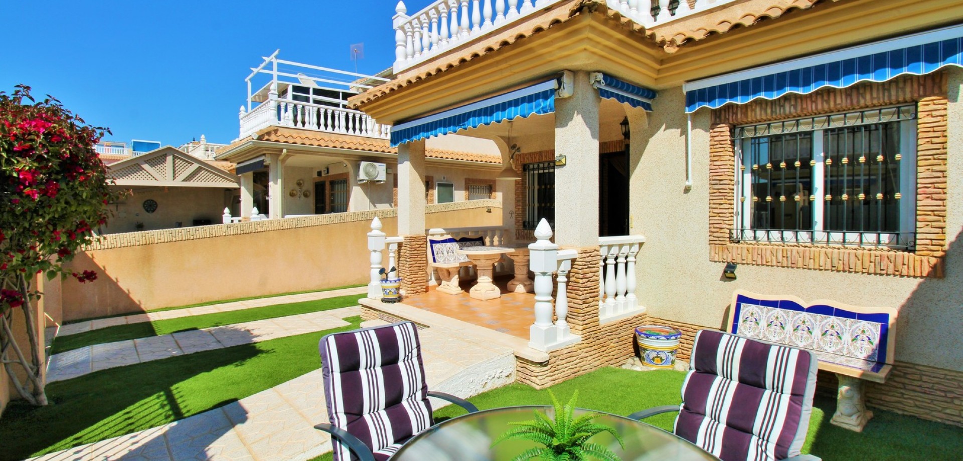 Située dans la très recherchée résidence Flamingo Hills II à Playa Flamenca, cette maison mitoyenne de 3 chambres et 2 salles de bains offre de beaux espaces extérieurs, une distribution pratique et un emplacement idéal à distance de marche de toutes les commodités. Nichée dans une rue communautaire privée, la propriété bénéficie d’un environnement calme tout en étant à proximité immédiate de nombreux bars, restaurants, supermarchés et du célèbre centre commercial Zenia Boulevard. La maison dispose d’un jardin privé à l’avant avec entrée pour véhicule, idéal pour stationner ou profiter de l’extérieur, ainsi qu’une terrasse couverte parfaite pour se détendre. À l’intérieur, vous trouverez un lumineux salon-salle à manger, ainsi qu’une cuisine indépendante partiellement modernisée. Le rez-de-chaussée comprend également une chambre double avec placards intégrés et une salle de bain avec douche à l’italienne, idéale pour les invités. Un espace de rangement sous l’escalier apporte un confort supplémentaire. À l’étage, il y a deux autres chambres doubles avec placards intégrés et une seconde salle de bain familiale. Depuis le palier, vous accédez à un grand solarium privé, parfait pour se détendre, recevoir ou profiter de repas en extérieur. La propriété fait partie d’une résidence bien entretenue avec accès à une belle piscine communautaire située à proximité. Vendue entièrement meublée avec électroménager, cette propriété est idéale comme résidence principale ou secondaire.