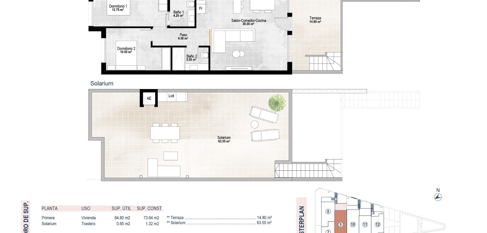 Appartements modernes avec piscine commune près de la plage à San Pedro del Pinatar Appartements neufs exclusifs sur la Costa Calida Découvrez ce petit complexe immobilier de 12 appartements modernes, conçus pour offrir confort, fonctionnalité et qualité de vie dans l'un des quartiers les plus attrayants de la Costa Calida. Situé près de Lo Pagan à San Pedro del Pinatar, ce complexe résidentiel allie un cadre de vie paisible à un accès facile à la côte et à tous les services essentiels. La région est réputée pour son style de vie méditerranéen décontracté, ses plages naturelles et ses célèbres bains de boue. Avec des commerces, des restaurants, des supermarchés et des installations de loisirs à proximité, cet emplacement est idéal tant pour une résidence principale que pour des séjours de vacances. Emplacement de choix à proximité des plages et de la promenade Le complexe est situé à seulement 3 km des plages de La Torre et de la célèbre promenade de Lo Pagan, où vous pourrez profiter de balades en bord de mer, de bars de plage et d’activités nautiques. Le Mar Menor offre des eaux calmes et chaudes, parfaites pour les familles et les amateurs de plein air. Design contemporain et agencements flexibles Le projet propose des appartements de 1 et 2 chambres dans différentes configurations pour s'adapter à divers modes de vie. Les logements du rez-de-chaussée disposent de grandes terrasses privées, d'un parking sur le terrain et d'un accès direct à la piscine commune. Les appartements du dernier étage comprennent des solariums privés sur le toit, idéaux pour profiter du soleil et de la vie en plein air. Tous les logements sont conçus avec des espaces de vie ouverts, combinant cuisine, salle à manger et salon avec accès direct aux terrasses. Les chambres sont équipées d’armoires encastrées, et la chambre principale bénéficie d’une salle de bains attenante. Finitions de haute qualité et efficacité énergétique Ces appartements sont construits en mettant l’accent sur le confort et la durabilité. Les équipements comprennent la pré-installation pour la climatisation par conduits, la pré-installation pour le chauffage central au gaz naturel et un système aérothermique pour l’eau chaude. Les salles de bains sont entièrement équipées de meubles, de miroirs et de parois de douche, tandis que des volets électriques sont installés dans le salon. Des systèmes techniques d’éclairage et de ventilation supplémentaires garantissent un environnement intérieur confortable tout au long de l’année. Espaces communs conçus pour la détente Le complexe résidentiel offre un espace commun magnifiquement conçu avec une piscine dotée d’une entrée de style plage, parfaite pour se détendre et se rafraîchir. Un espace détente dédié, avec des chaises longues et des zones ombragées, crée un cadre accueillant pour se retrouver et se détendre. Les équipements supplémentaires comprennent un parking extérieur avec pré-installation pour la recharge de véhicules électriques et un local commun pour les vélos, favorisant un mode de vie durable et actif. Excellente connectivité et commodités à proximité Ce complexe est idéalement situé, avec un accès facile aux principaux points d'intérêt. L'aéroport international de Murcie se trouve à environ 35 km et celui d'Alicante à environ 75 km. Plusieurs terrains de golf se trouvent à moins de 10 à 15 km, et les ports de plaisance à proximité offrent d'excellentes installations nautiques. Une opportunité idéale d'investissement ou de résidence secondaire Ces appartements offrent une excellente opportunité de profiter d'un mode de vie côtier moderne dans un quartier bien desservi et très prisé. Contactez-nous dès aujourd'hui pour obtenir plus d'informations ou pour organiser une visite et réserver votre nouvel appartement près de la mer à San Pedro del Pinatar.