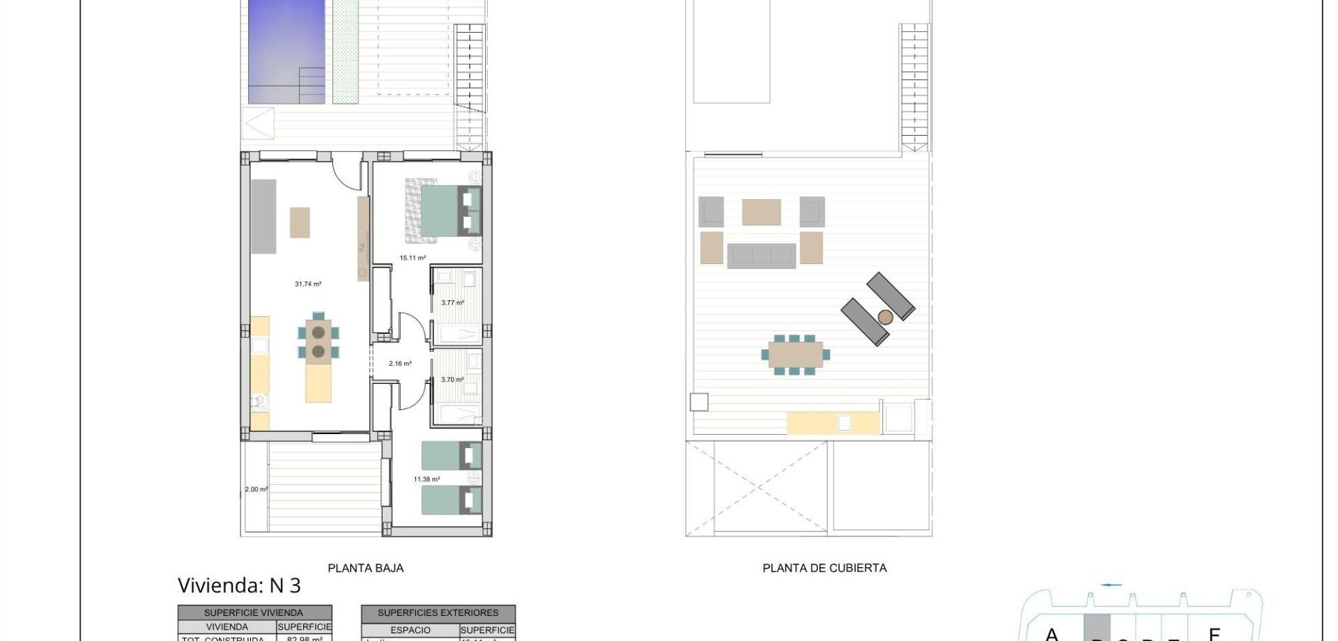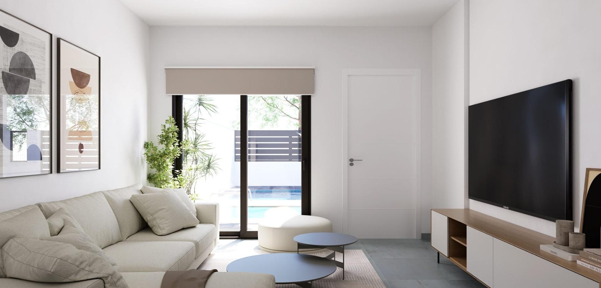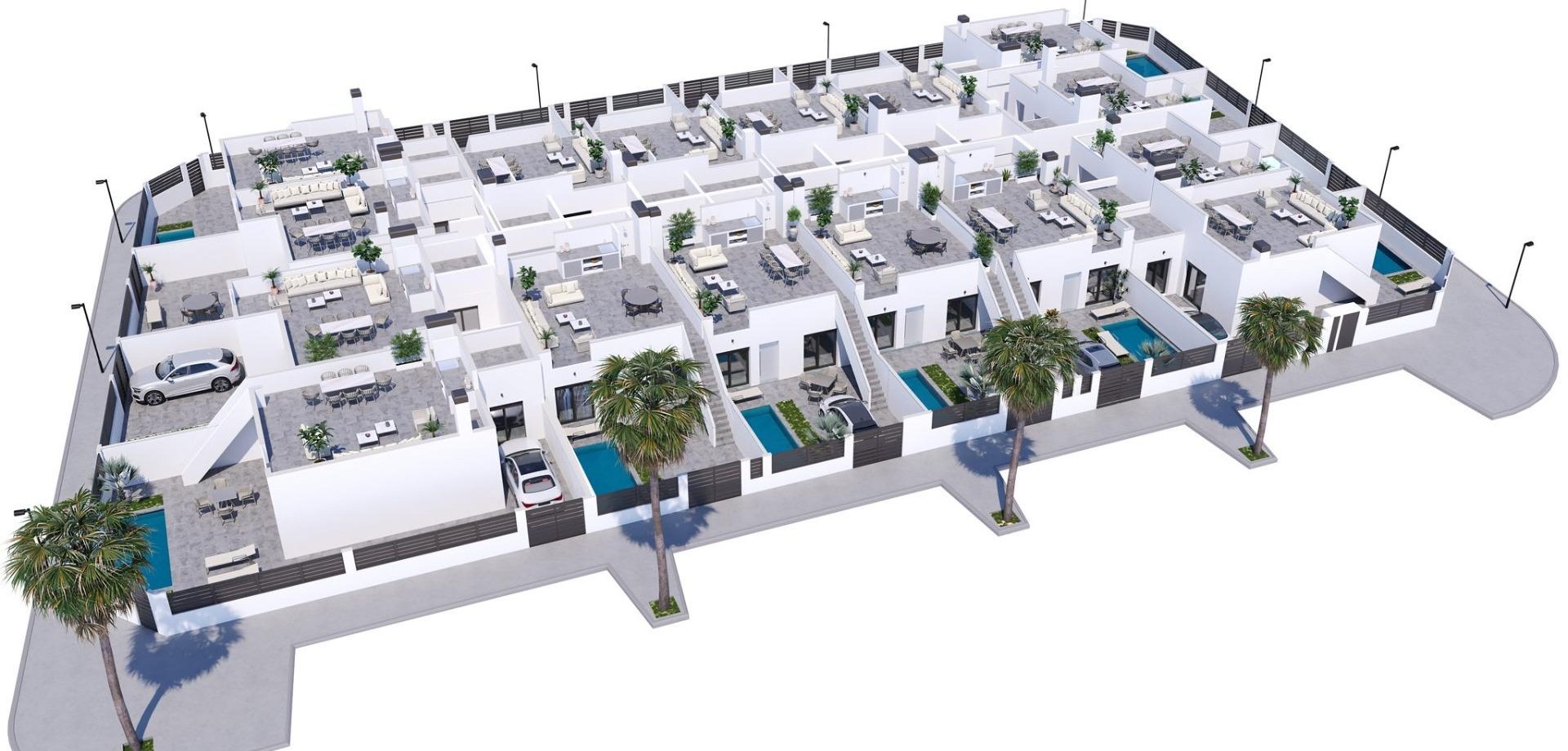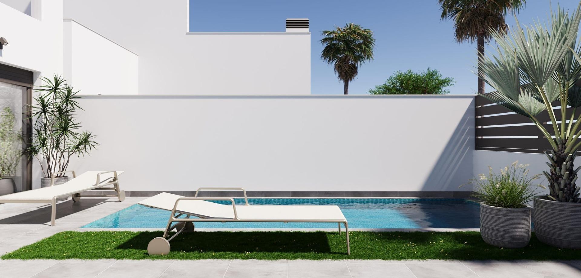 Maisons jumelées et mitoyennes modernes, récemment construites, avec piscine privée à El Alba Resort-Torre Pacheco Des maisons contemporaines dans une communauté de vacances méditerranéenne en plein essor Ce nouveau programme immobilier comprend 16 maisons jumelées et mitoyennes exclusives, situées au sein du complexe El Alba Mediterranean Resort à Torre Pacheco. Conçues comme des maisons de plain-pied, ces propriétés modernes offrent un mélange parfait de confort, de fonctionnalité et de vie en plein air à la méditerranéenne. El Alba Resort est un quartier résidentiel en plein essor, entouré de campagne et de terrains de golf, à proximité de la ville de Roldán, où vous trouverez des supermarchés, des restaurants, des banques et toutes les commodités quotidiennes. Le complexe dispose déjà d'un club social avec piscine et restaurant, et une zone commerciale est actuellement en cours de développement, ajoutant encore plus de commodité et de valeur à l'emplacement. Maison de plain-pied avec jardin privé et terrasse ensoleillée Chaque propriété comprend 2 chambres et 2 salles de bains, dont une attenante, ainsi qu’une cuisine ouverte reliée à un salon lumineux. L’agencement est soigneusement pensé pour maximiser la lumière naturelle et créer une transition harmonieuse entre les espaces intérieurs et extérieurs. Toutes les maisons comprennent : Cuisine équipée avec appareils électroménagers Salles de bains avec meubles-lavabos, miroirs, éclairage et parois de douche Des armoires encastrées avec tiroirs dans les chambres Une pré-installation pour la climatisation par conduits Un éclairage LED intérieur et extérieur Trois panneaux solaires photovoltaïques d'une capacité de 1,5 kW par logement Les espaces extérieurs sont conçus pour être appréciés toute l'année, avec un jardin privé doté d'une piscine, une terrasse et une grande terrasse ensoleillée privée avec une cuisine d'été, idéale pour les repas en plein air et la détente au soleil. Des équipements de qualité conçus pour le confort et l'efficacité Ces maisons sont construites avec des intérieurs élégants et fonctionnels, axés sur l'efficacité énergétique et la vie moderne. Le terrain dispose d'une place de parking privée, garantissant commodité et sécurité. La combinaison de panneaux solaires, d'une isolation de haute qualité et d'une conception intelligente offre une maison économe en énergie, idéale pour une résidence principale, une résidence secondaire ou un investissement locatif. Emplacement exceptionnel à proximité des terrains de golf, des plages et des aéroports Centre-ville de Roldán à 2 km Plages du Mar Menor à 15 km Plages de la Méditerranée à 20 km La Torre Golf Resort à 5 km Terrazas de la Torre Golf à 6 km Aéroport de Murcie-Corvera à 18 km Carthagène à 30 km Cet emplacement stratégique offre un accès facile aux terrains de golf, aux plages, aux commodités et aux réseaux de transport, tout en bénéficiant d’un cadre résidentiel paisible. Un investissement judicieux sur la Costa Cálida Ces maisons de ville et maisons jumelées de l’El Alba Mediterranean Resort offrent une excellente opportunité d’acquérir une propriété moderne avec piscine privée dans la zone en pleine expansion de Torre Pacheco. Contactez-nous dès aujourd’hui pour obtenir plus d’informations ou pour organiser une visite de ces maisons neuves exclusives.