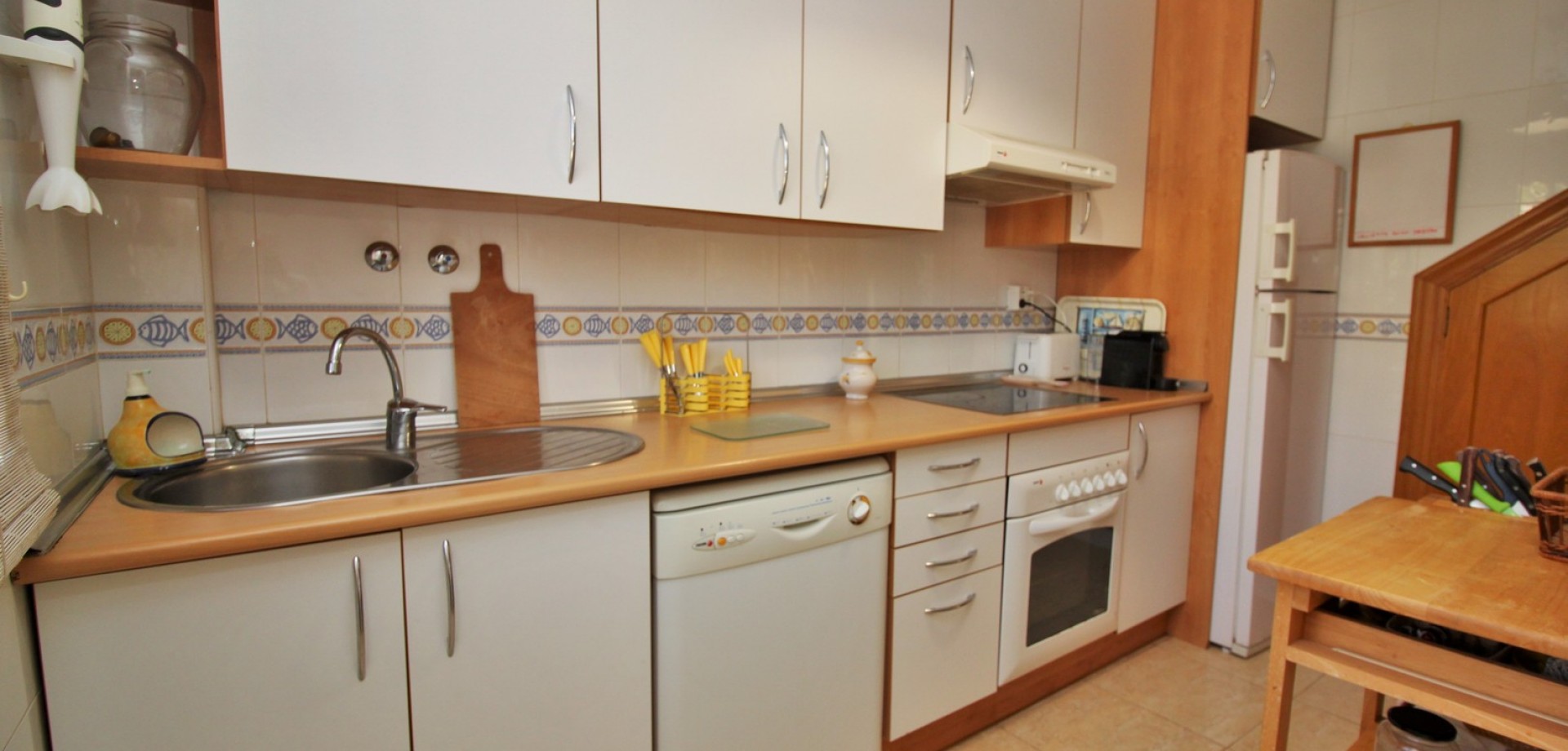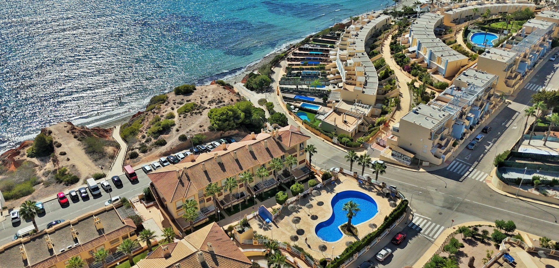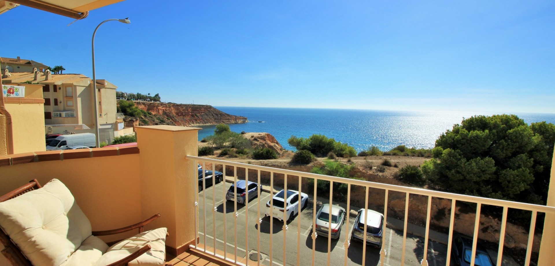 Superbe opportunité d’acquérir un duplex de 3 chambres en première ligne avec vue imprenable sur la mer dans la résidence sécurisée recherchée Las Terrazas, idéalement située entre Cabo Roig et Campoamor sur la magnifique Orihuela Costa. Située dans l’un des emplacements côtiers les plus privilégiés de la Costa Blanca, la propriété se trouve à seulement quelques mètres des plages d’Aguamarina et de Campoamor (La Glea). Le niveau principal comprend un salon lumineux avec cheminée donnant accès à un grand balcon orienté plein sud avec vue spectaculaire sur la mer Méditerranée. Ce niveau comprend également une cuisine entièrement équipée avec buanderie et une salle de bain familiale avec douche à l’italienne. À l’étage supérieur se trouvent trois chambres et une seconde salle de bain familiale. Deux chambres bénéficient de magnifiques vues panoramiques sur la mer, tandis que la troisième offre une vue sur les jardins et la piscine communautaire. La propriété fait partie d’une résidence sécurisée en première ligne de mer, avec jardins paysagers et piscine commune. Une place de parking souterrain privée est incluse dans le prix. Idéalement située à quelques minutes à pied de la plage d’Aguamarina et de la célèbre zone commerciale de Cabo Roig, avec restaurants, bars et services.