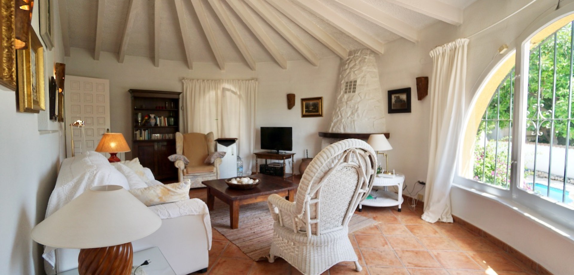 Le spacieux salon avec cheminée offre des vues sur le rocher Ifach de Calpe et le jardin est planté d'arbres et de plantes matures.