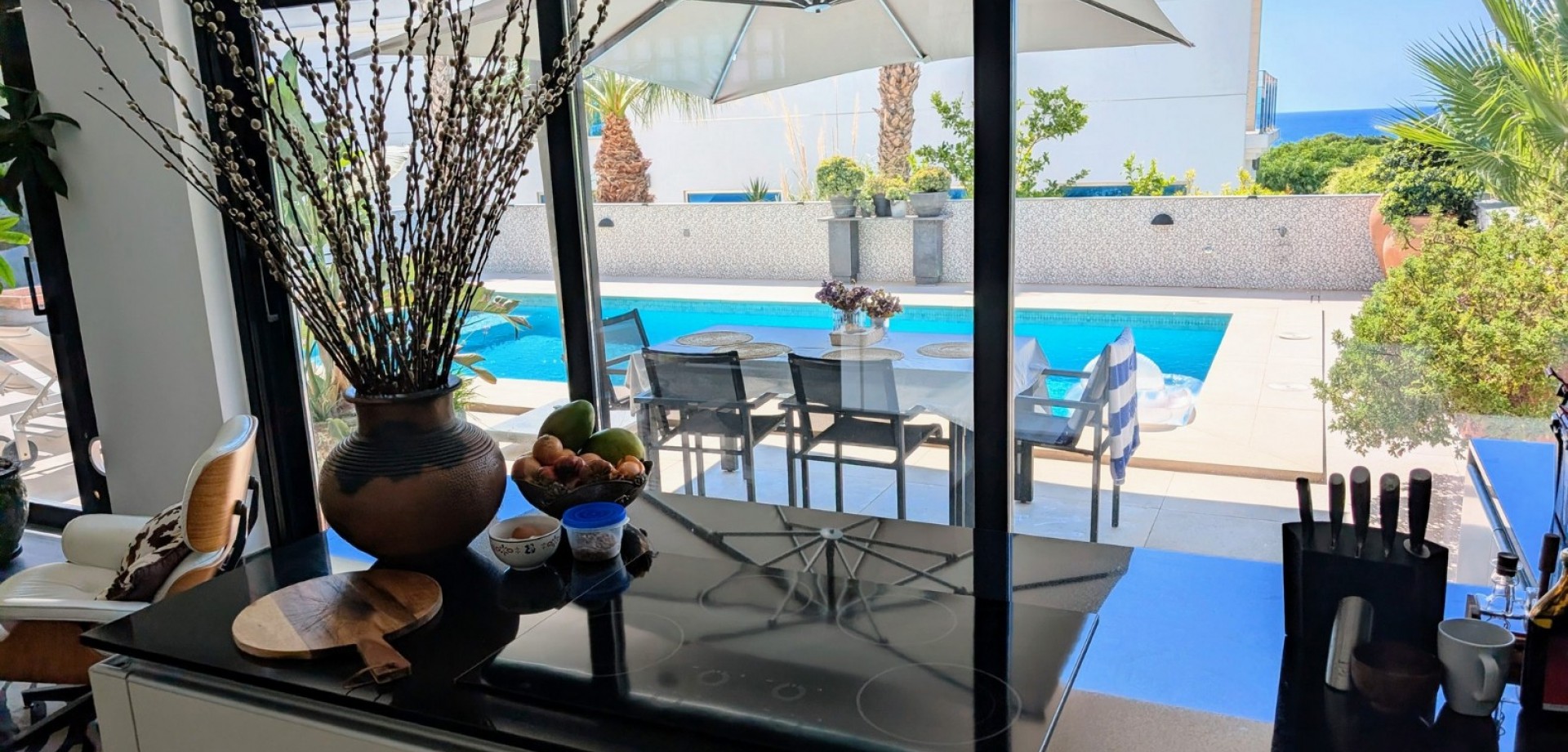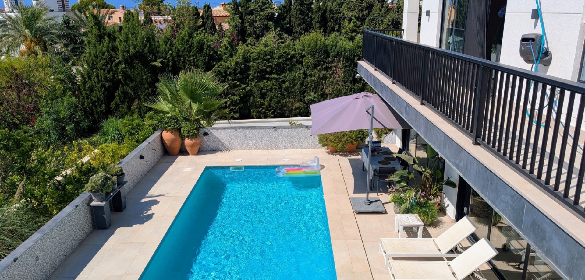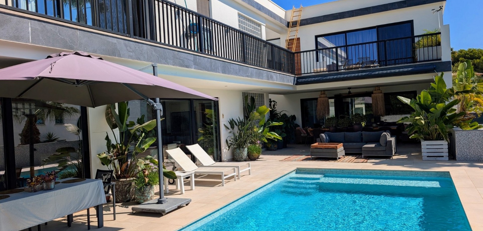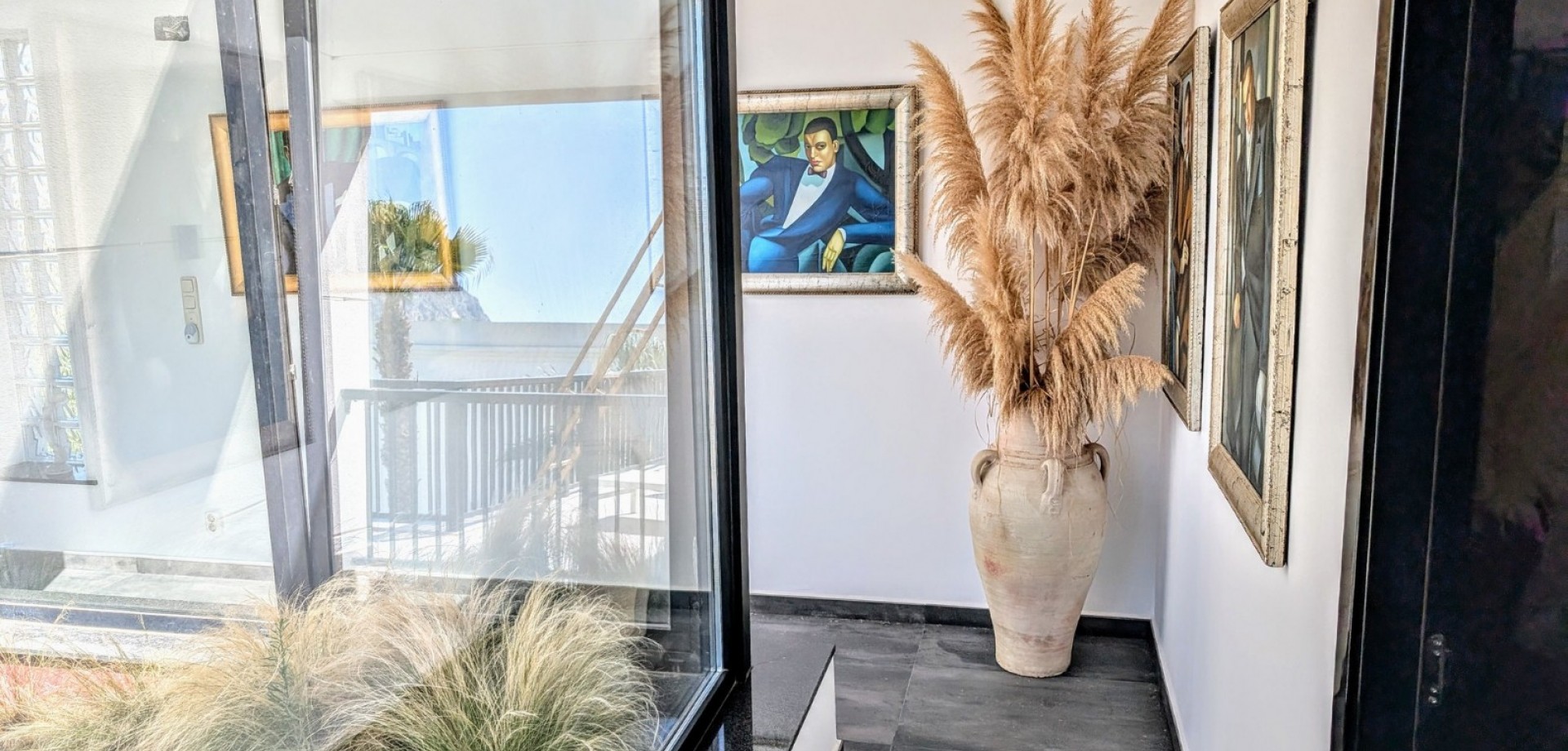 Deze luxe, exotische, moderne villa met uitzicht op zee ligt in de populaire wijk La Calalga in Calpe. De villa is verdeeld over drie verdiepingen en ligt op een perceel van 800 m2 met een gemakkelijk te onderhouden volgroeide tropische tuin. Je komt de woning binnen op een ruime parkeerplaats met een zeil carport buiten de ingang van de garage. De villa is prachtig ontworpen met gebruik van glas waar mogelijk om het licht en de binnen/buiten woonervaring te maximaliseren. Je komt binnen in de belangrijkste woonverdieping, een lichte hal met een gastentoilet en een muur van opbergkasten leidt je langs de trap naar de prachtige keuken / eetkamer / familie kamer met volledige hoogte glazen deuren en ramen met uitzicht op het terras bij het zwembad en een stenen muur om de kamer de "wow"-factor te geven. De designkeuken is volledig uitgerust met room- en lichthouten kasten, zwart granieten werkbladen en roestvrijstalen apparatuur. Aan de andere kant van de entreehal is de woonkamer, een prachtige ruime kamer met een moderne open haard en glazen deuren over de volle hoogte die leiden naar de tropische zomerkeuken en het zwembadterras. Het terras bij het zwembad is toegankelijk vanuit zowel de woonkamer als de keuken en er zijn twee overdekte terrassen en een trap naar beneden naar de tuin. Via de lichte en heldere trap vanuit de entreehal bereik je de slaapverdieping, aan de linkerkant zijn er twee tweepersoonsslaapkamers, waarvan een met uitzicht op zee, beide met kledingkasten en en-suite doucheruimtes. Aan de rechterkant is de ouderslaapkamer, een grote kamer met veel kastruimte, een televisie, glazen deuren naar het balkon, uitzicht op zee en een grote en-suite badkamer met douche en extra opslagruimte. Via de trap vanuit de entreehal bereik je de halve kelder, hier vind je een grote wasruimte met een grote berging die toegang geeft tot de enorme garageruimte. Aan het eind van de gang is de wellnessruimte, die een grote slaapkamer 4 zou kunnen zijn, met een sauna, massage-/behandeltafel en een doucheruimte. De villa wordt aan drie kanten omringd door een gemakkelijk te onderhouden tuin met volwassen planten, palmen en fruitbomen, allemaal met automatische besproeiing.- Belangrijkste punten:- 3 slaapkamers, mogelijkheid tot 4- 4 badkamers- Gastentoilet- Woonkamer- Keuken/Familiekamer- Wasserij- Veel bergruimtes- Eigenaar heeft ruimte overgelaten voor een te installeren lift- Overdekt terras aan het einde van de eerste verdieping kan worden veranderd in een kantoor met uitzicht op zee- Centraal airconditioningsysteem door aerothermie- Fotovoltaïsch systeem dat elektriciteit produceert met 12 zonnepanelen- Ingebouwd geluidssysteem- Gecentraliseerd stofzuigsysteem- Locatie is Partida Calalga: - Op loopafstand van Bassetes watersportcentrum, La Fustera strand of Playa de la Fossa strand- Op loopafstand van een ruime keuze aan restaurants- 14 minuten rijden naar een golfbaan- 19 minuten rijden naar de snelweg toegang in Benissa- Als je op zoek bent naar een buitengewone villa met een eigentijds ontwerp, een gunstige ligging, energie-efficiëntie en een prachtige binnen / buiten levensstijl, zoek dan niet verder.