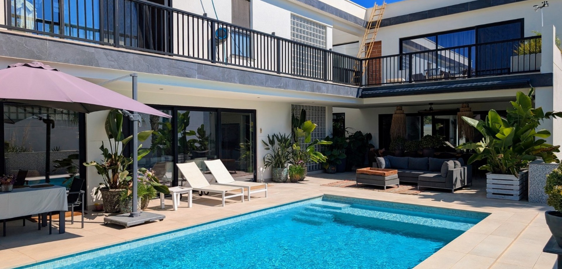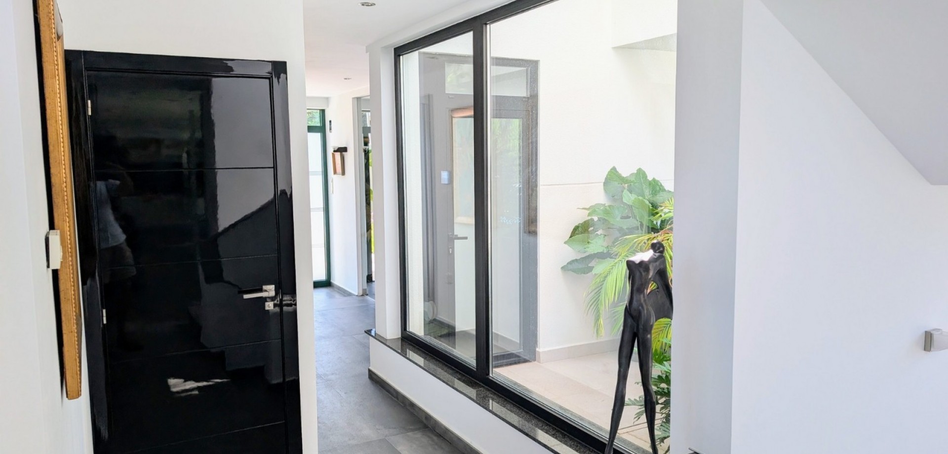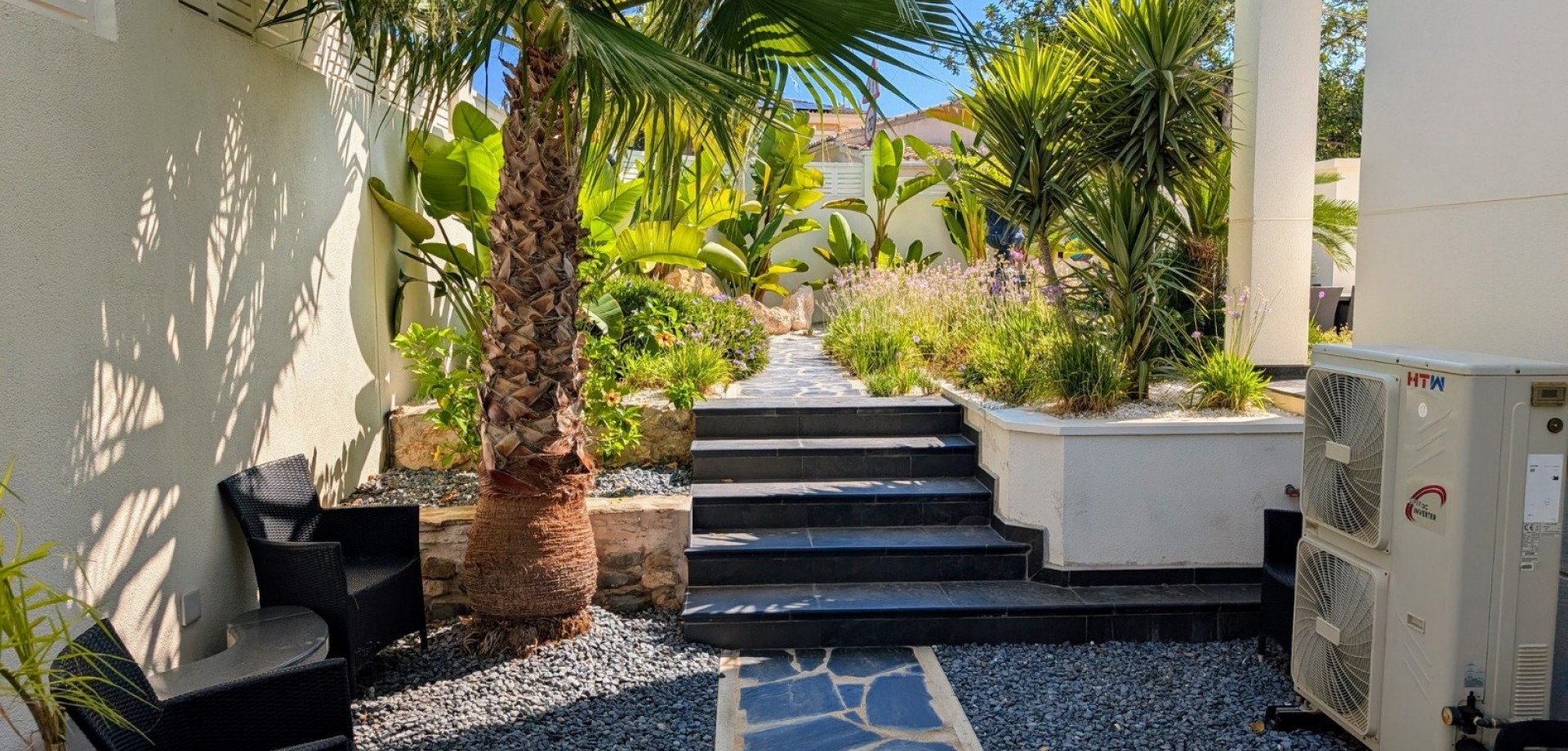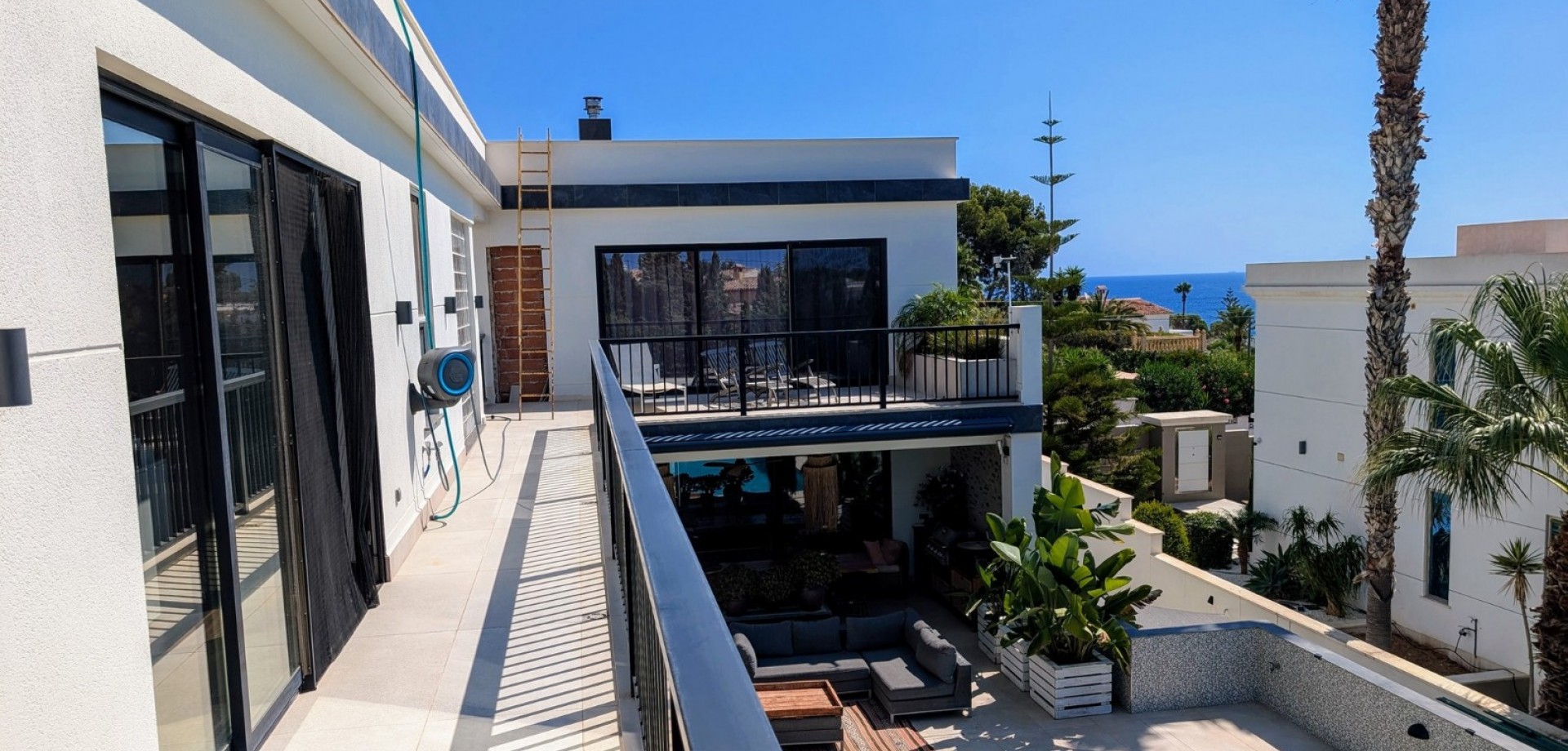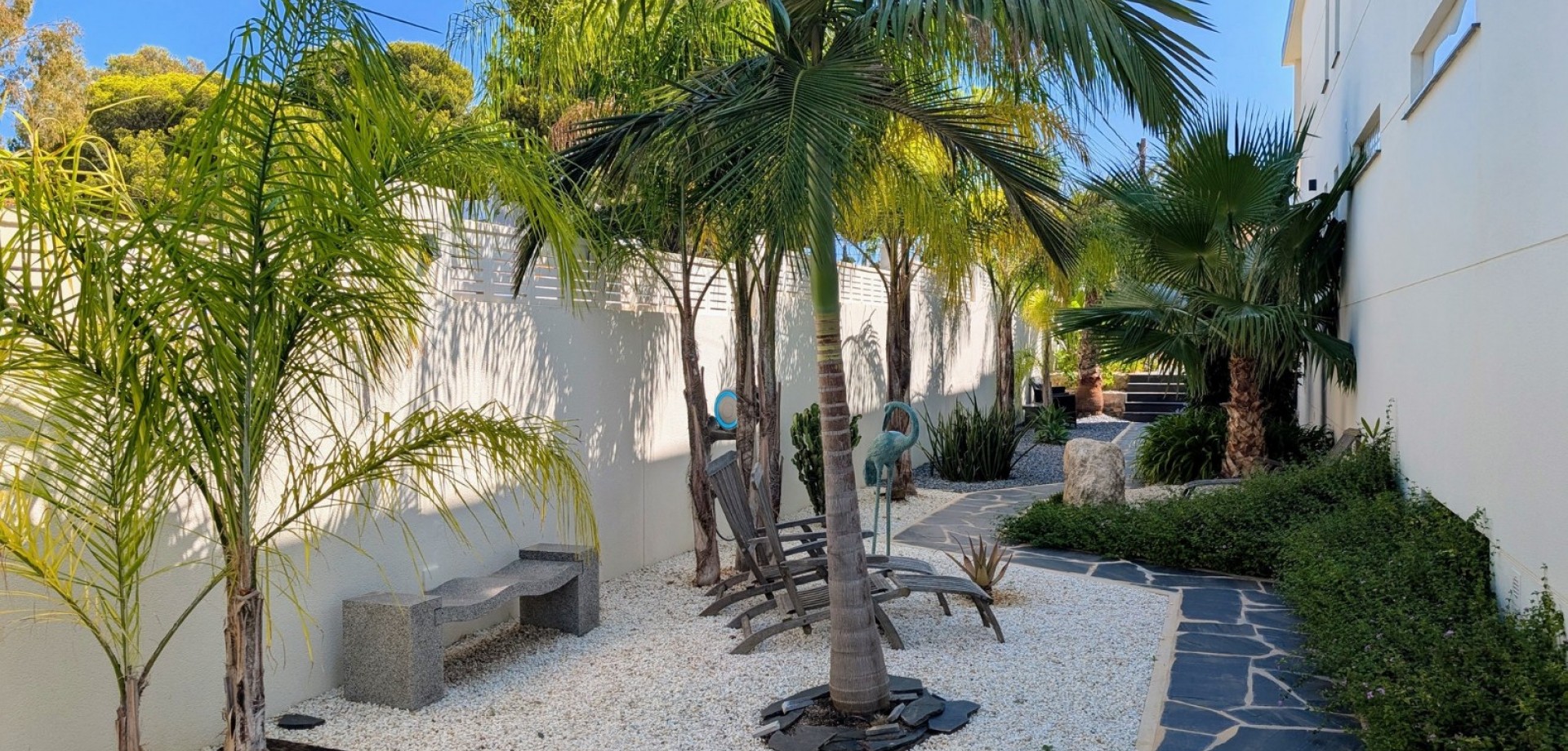Deze luxe, exotische, moderne villa met uitzicht op zee ligt in de populaire wijk La Calalga in Calpe. De villa is verdeeld over drie verdiepingen en ligt op een perceel van 800 m2 met een gemakkelijk te onderhouden volgroeide tropische tuin. Je komt de woning binnen op een ruime parkeerplaats met een zeil carport buiten de ingang van de garage. De villa is prachtig ontworpen met gebruik van glas waar mogelijk om het licht en de binnen/buiten woonervaring te maximaliseren. Je komt binnen in de belangrijkste woonverdieping, een lichte hal met een gastentoilet en een muur van opbergkasten leidt je langs de trap naar de prachtige keuken / eetkamer / familie kamer met volledige hoogte glazen deuren en ramen met uitzicht op het terras bij het zwembad en een stenen muur om de kamer de "wow"-factor te geven. De designkeuken is volledig uitgerust met room- en lichthouten kasten, zwart granieten werkbladen en roestvrijstalen apparatuur. Aan de andere kant van de entreehal is de woonkamer, een prachtige ruime kamer met een moderne open haard en glazen deuren over de volle hoogte die leiden naar de tropische zomerkeuken en het zwembadterras. Het terras bij het zwembad is toegankelijk vanuit zowel de woonkamer als de keuken en er zijn twee overdekte terrassen en een trap naar beneden naar de tuin. Via de lichte en heldere trap vanuit de entreehal bereik je de slaapverdieping, aan de linkerkant zijn er twee tweepersoonsslaapkamers, waarvan een met uitzicht op zee, beide met kledingkasten en en-suite doucheruimtes. Aan de rechterkant is de ouderslaapkamer, een grote kamer met veel kastruimte, een televisie, glazen deuren naar het balkon, uitzicht op zee en een grote en-suite badkamer met douche en extra opslagruimte. Via de trap vanuit de entreehal bereik je de halve kelder, hier vind je een grote wasruimte met een grote berging die toegang geeft tot de enorme garageruimte. Aan het eind van de gang is de wellnessruimte, die een grote slaapkamer 4 zou kunnen zijn, met een sauna, massage-/behandeltafel en een doucheruimte. De villa wordt aan drie kanten omringd door een gemakkelijk te onderhouden tuin met volwassen planten, palmen en fruitbomen, allemaal met automatische besproeiing.- Belangrijkste punten:- 3 slaapkamers, mogelijkheid tot 4- 4 badkamers- Gastentoilet- Woonkamer- Keuken/Familiekamer- Wasserij- Veel bergruimtes- Eigenaar heeft ruimte overgelaten voor een te installeren lift- Overdekt terras aan het einde van de eerste verdieping kan worden veranderd in een kantoor met uitzicht op zee- Centraal airconditioningsysteem door aerothermie- Fotovoltaïsch systeem dat elektriciteit produceert met 12 zonnepanelen- Ingebouwd geluidssysteem- Gecentraliseerd stofzuigsysteem- Locatie is Partida Calalga: - Op loopafstand van Bassetes watersportcentrum, La Fustera strand of Playa de la Fossa strand- Op loopafstand van een ruime keuze aan restaurants- 14 minuten rijden naar een golfbaan- 19 minuten rijden naar de snelweg toegang in Benissa- Als je op zoek bent naar een buitengewone villa met een eigentijds ontwerp, een gunstige ligging, energie-efficiëntie en een prachtige binnen / buiten levensstijl, zoek dan niet verder.
