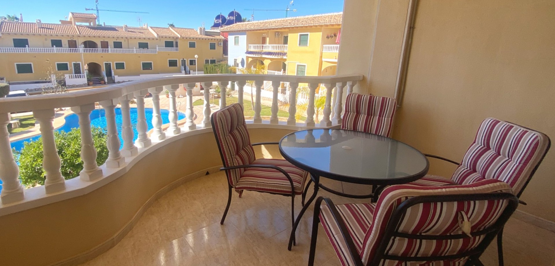 Via de openslaande deuren vanuit de woonkamer bereikt u een groot, overdekt privéterras met uitzicht op het gemeenschappelijke zwembad en de privéparkeerplaats – ideaal om te ontspannen of buiten te dineren.