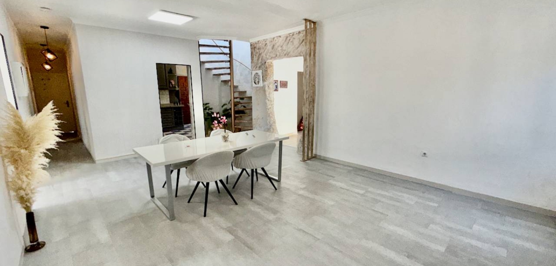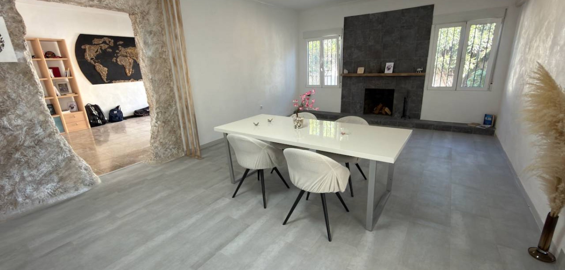 Lichte woon- en eetkamer met open haard