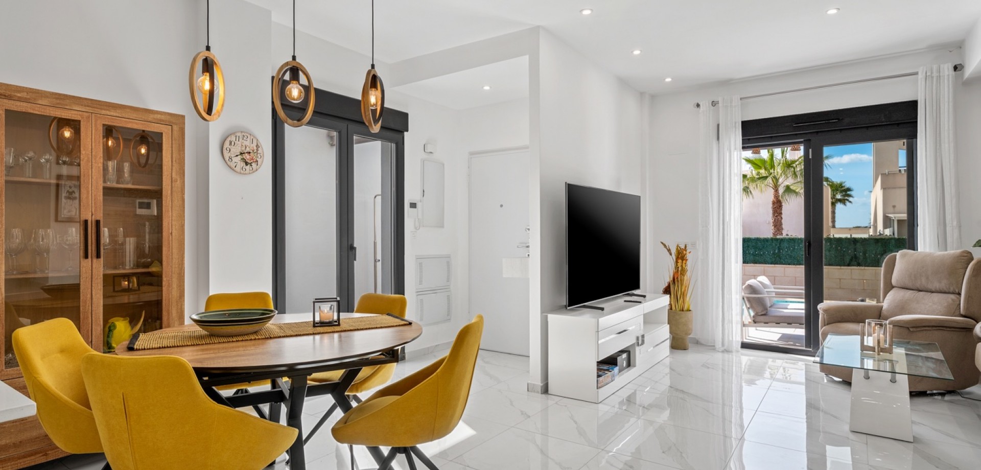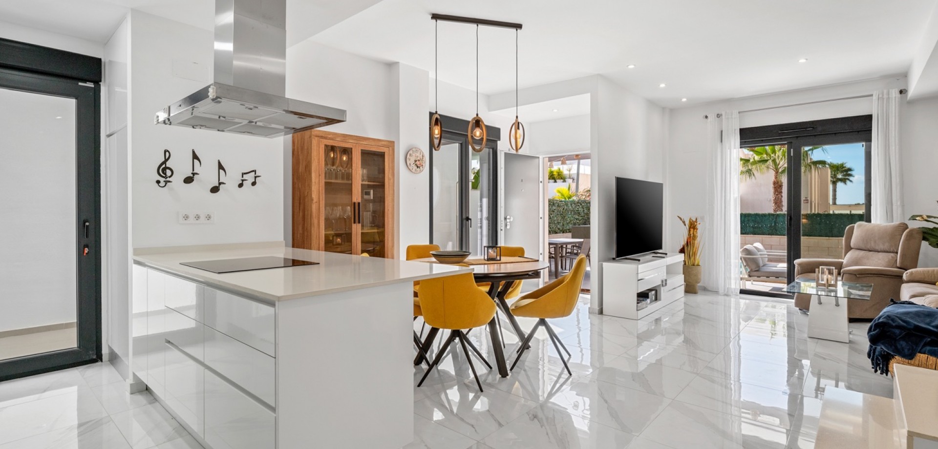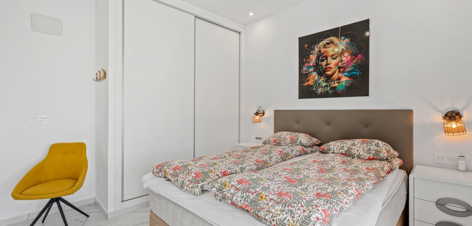 Op de begane grond vindt u één tweepersoonsslaapkamer, een badkamer en een lichte open keuken met eet- en woonkamer. Grote schuifdeuren vanuit de woonkamer geven directe toegang tot de tuin en het zwembad, waardoor binnen- en buitenleven naadloos in elkaar overlopen.